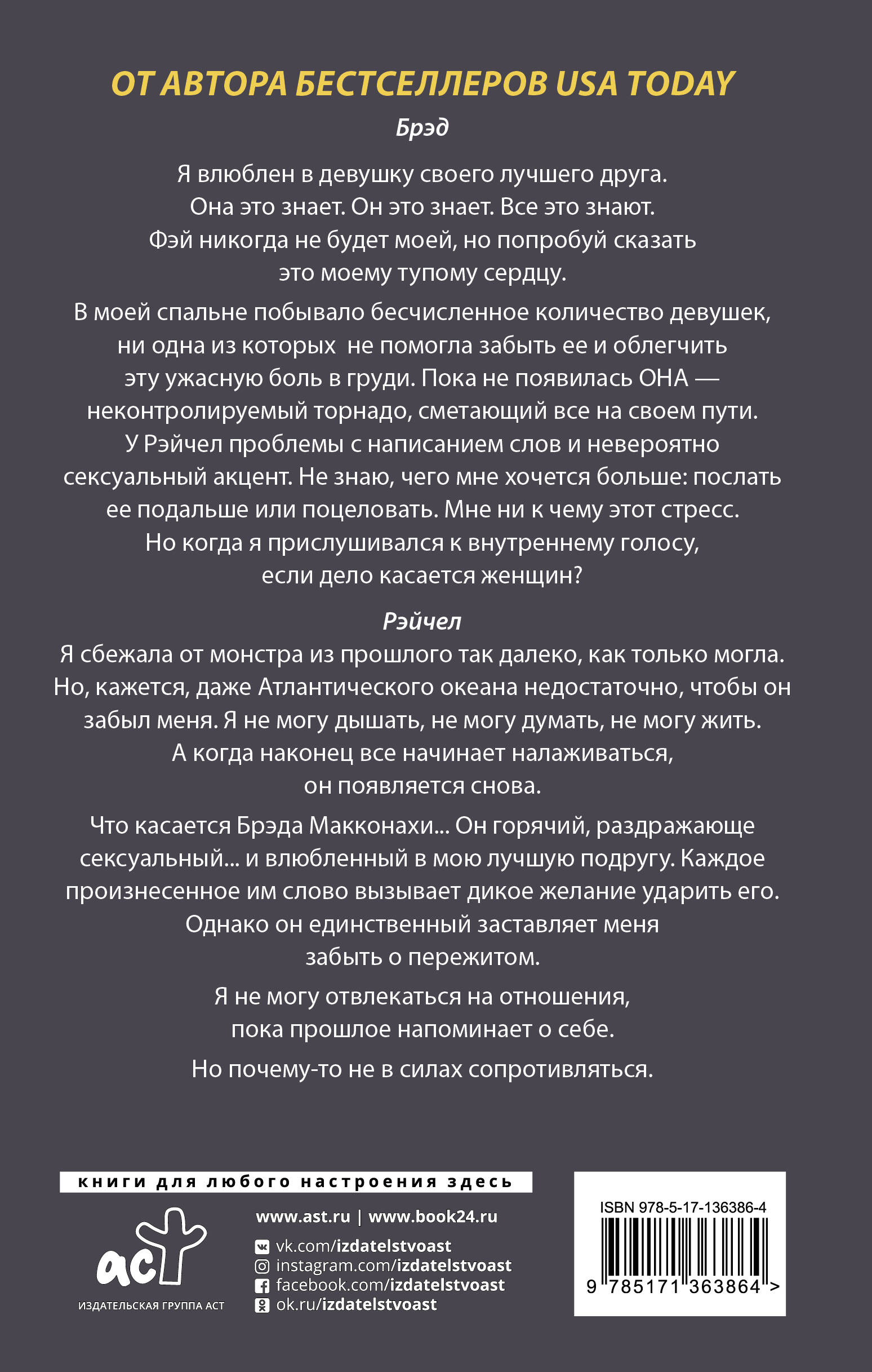 Брэд Я влюблен в девушку своего лучшего друга. Она это знает. Он это знает. Все это знают. Фэй никогда не будет моей, но попробуй сказать это моему тупому сердцу. В моей спальне побывало бесчисленное количество девушек, ни одна из которых не помогла забыть ее и облегчить эту ужасную боль в груди. Пока не появилась ОНА - неконтролируемый торнадо, сметающий все на своем пути. У Рэйчел проблемы с написанием слов и невероятно сексуальный акцент. Не знаю, чего мне хочется больше: послать ее подальше или поцеловать. Мне ни к чему этот стресс. Но когда я прислушивался к внутреннему голосу, если дело касается женщин? Рэйчел Когда речь заходит о нем, я готова взорваться. Я сбежала от этого монстра так далеко, как только могла. Но, кажется, даже Атлантического океана недостаточно, чтобы забыть о нем. Я не могу дышать, не могу думать, не могу жить. А когда наконец все начинает налаживаться, он появляется снова. Брэд Макконахи. Такой раздражающе горячий, сексуальный… и влюбленный в девушку лучшего друга. Каждое произнесенное им слово вызывает дикое желание ударить его. Но что хуже всего - он единственный заставляет меня забыть о прошлом. Мы оба знаем, что это плохо кончится. Но почему-то не в силах сопротивляться.| Издательство | АСТ |