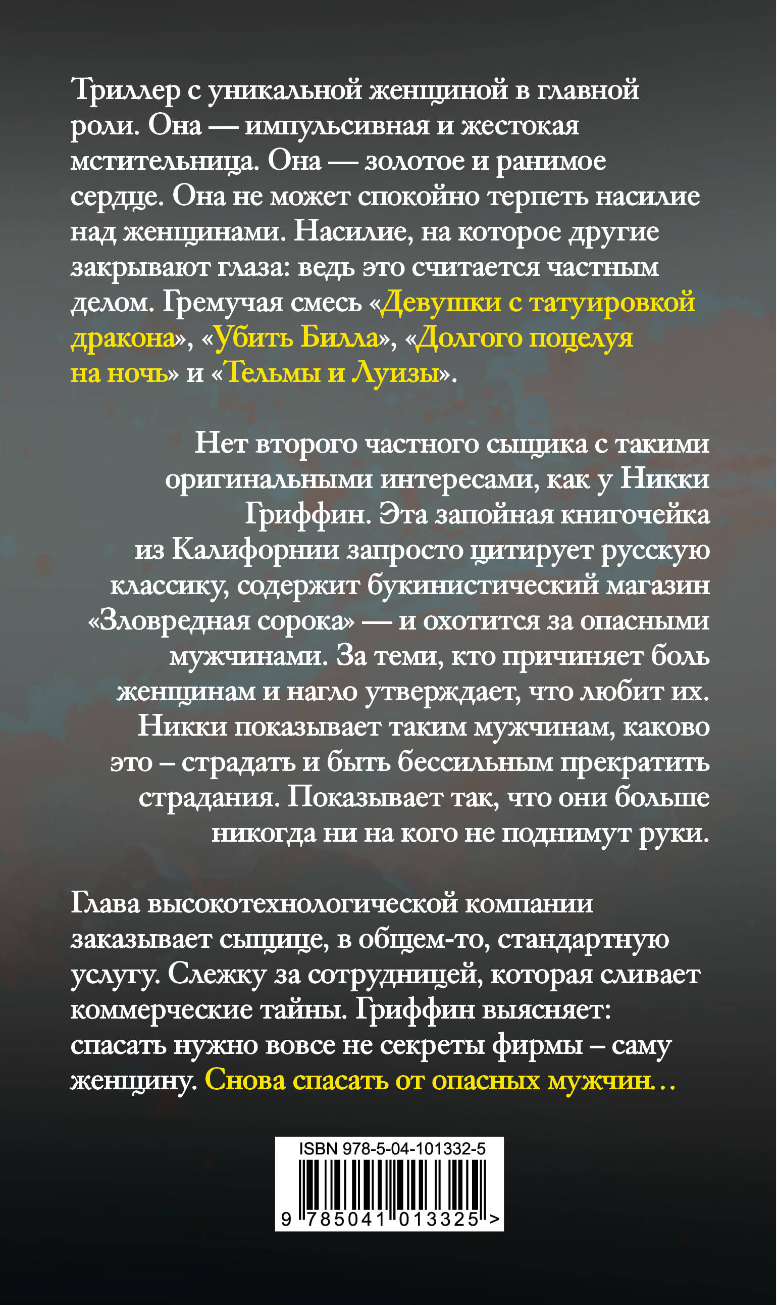 "Нравятся Лисбет Саландер и Джек Ричер? Значит, вы будете просто обожать Никки Гриффин". - Дуглас Престон "Бешеная динамика, остро заточенная фабула. Джек Ричер влюбился бы в Никки". - Ли Чайлд Триллер с уникальной женщиной в главной роли. Она - импульсивная и жестокая мстительница. Она - золотое и ранимое сердце. Она не может спокойно терпеть насилие над женщинами. Насилие, на которое другие закрывают глаза: ведь это считается частным делом. Гремучая смесь «Девушки с татуировкой дракона», «Убить Билла», «Долгого поцелуя на ночь» и «Тельмы и Луизы». Нет второго частного сыщика с такими оригинальными интересами, как у Никки Гриффин. Эта запойная книгочейка из Калифорнии запросто цитирует русскую классику, содержит букинистический магазин «Зловредная сорока» - и охотится за опасными мужчинами. За теми, кто причиняет боль женщинам и нагло утверждает, что любит их. Никки показывает таким мужчинам, каково это - страдать и быть бессильным прекратить страдания. Показывает так, что они больше никогда ни на кого не поднимут руки. Глава высокотехнологической компании заказывает сыщице, в общем-то, стандартную услугу. Слежку за сотрудницей, которая сливает коммерческие тайны. Гриффин выясняет: спасать нужно вовсе не секреты фирмы - саму женщину. Снова спасать от опасных мужчин…| Издательство | ООО "Издательство "Эксмо" |