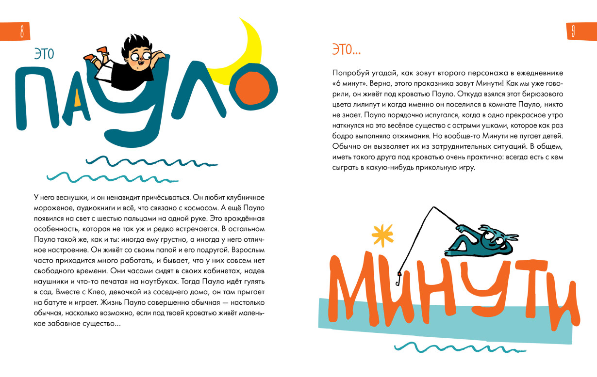 Ежедневник учитывает особенности возрастной психологии детей, поэтому информация подается в игровом формате: заполнение дневниковых записей чередуется с рисованием, ответами на вопросы, интересными фактами и полезной информацией из области психологии. Чтобы ребенку было легче воспринимать материал, на протяжении всего ежедневника его будут сопровождать два героя: мальчик Паоло и его воображаемый друг, проказник Минути.
