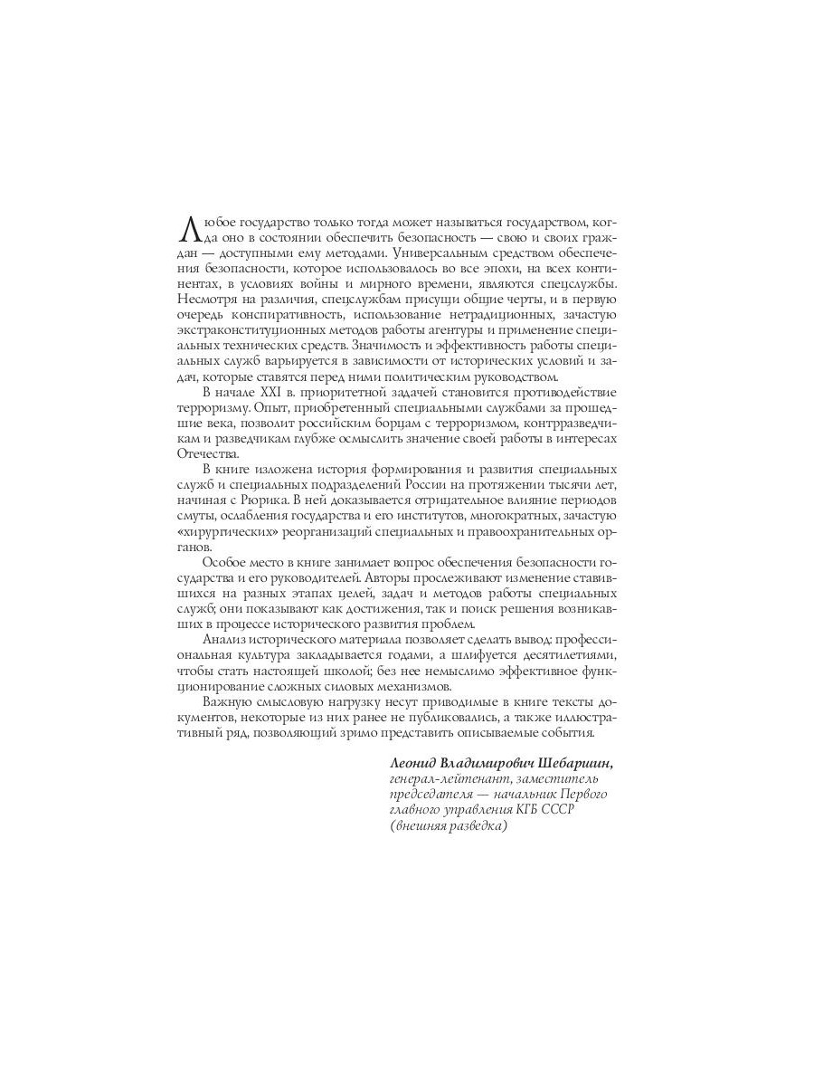 Книга, ставшая результатом продолжительного изучения редких архивных материалов, подробно рассказывает об истоках, формировании и развитии отечественных силовых, разведывательных и контртеррористических подразделений, о методах работы и практическом опыте спецслужб на различных этапах истории российского государства.