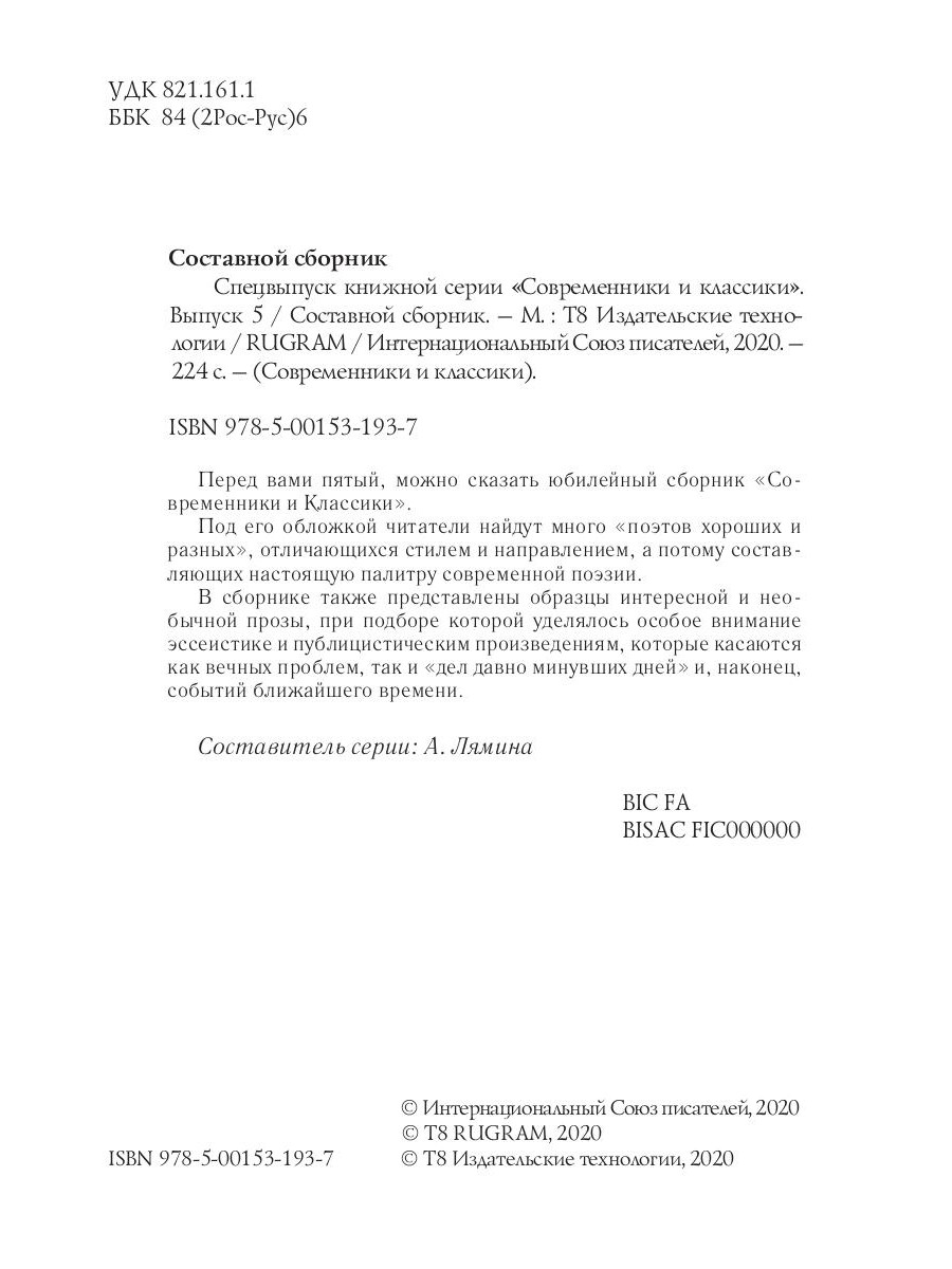 Перед вами пятый, можно сказать юбилейный сборник «Современники и Классики». Под его обложкой читатели найдут много «поэтов хороших и разных», отличающихся стилем и направлением, а потому составляющих настоящую палитру современной поэзии. В сборнике также представлены образцы интересной и необычной прозы, при подборе которой уделялось особое внимание эссеистике и публицистическим произведениям, которые касаются как вечных проблем, так и «дел давно минувших дней» и, наконец, событий ближайшего времени.| Издательство | Т8 RUGRAM |