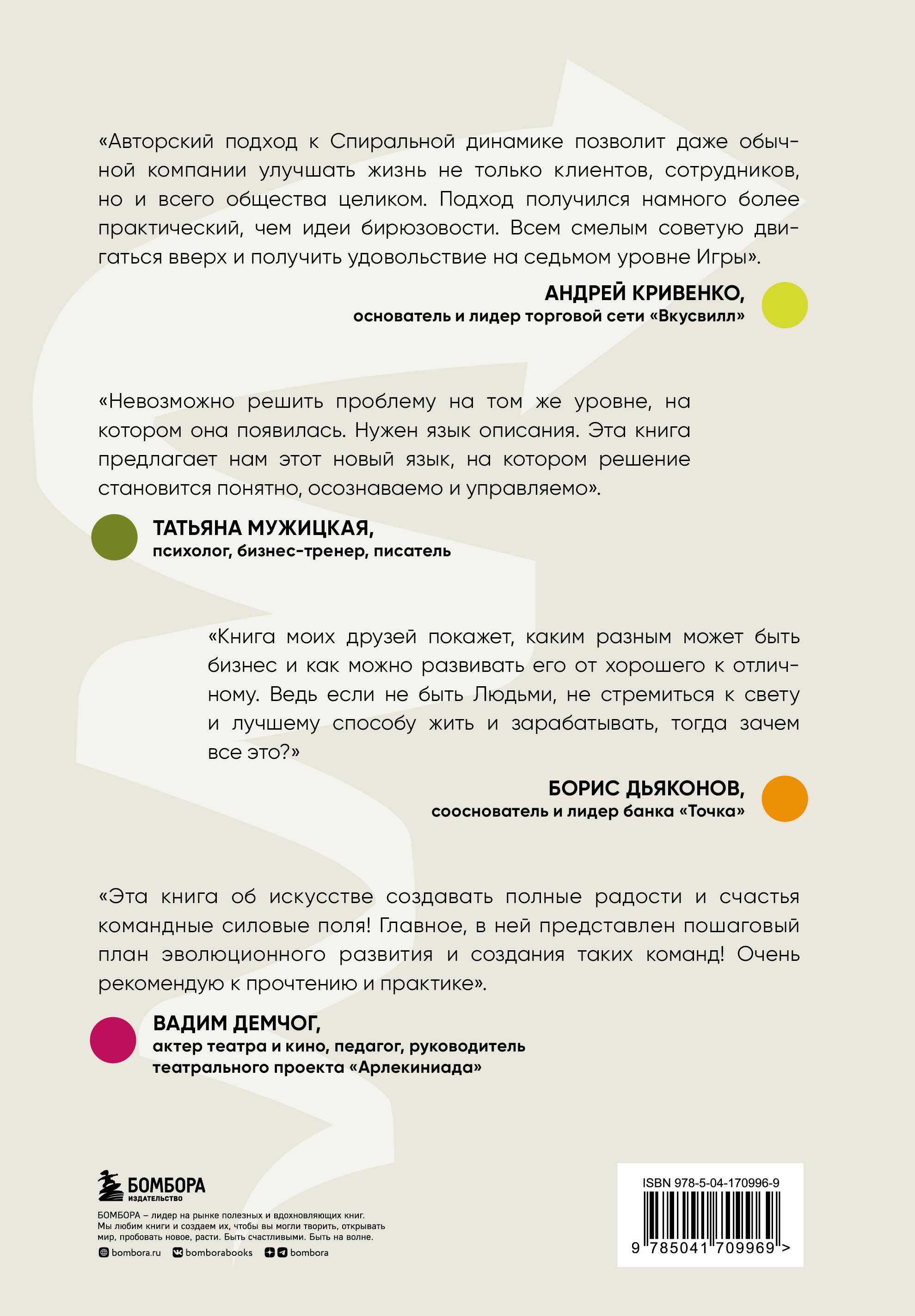 Сергей и Виктория Бехтеревы занимаются спиральной динамикой более девяти лет. Они адаптировали для России и усилили классическую концепцию Дона Бека. На этой основе авторы создали практические инструменты, которые помогли сотням коммерческих и некоммерческих российских и зарубежных организаций. Авторы объясняют, как применение спиральной динамики позволяет успешно справляться с такими болями организаций, как невовлеченность персонала, бюрократия, выгорание лидеров, конфликты между подразделениями, бессмысленность работы и многие другие. В книге описан пошаговый план развития бизнеса в соответствии с теми целями, которых хочет добиться компания. А еще можно узнать, как: • руководить так, чтобы сотрудники сами закрывали зоны безответственности, улучшали процессы и регламенты, предлагали идеи; • менять отношение персонала от саботирующего к вовлеченному; • предотвращать или безболезненно переживать кризисы; • перейти от авторитарного менеджмента к самоуправляемой организации. «Авторский подход к Спиральной динамике позволит даже обычной компании улучшать не только жизнь клиентов, сотрудников, но и целиком всего общества. Подход получился намного более практический, чем идеи бирюзовости. Всем смелым советую двигаться вверх и получить удовольствие на седьмом уровне Игры». - Андрей Кривенко, основатель и лидер торговой сети «Вкусвилл» «Невозможно решить проблему на том же уровне, на котором она появилась. Нужен язык описания. Эта книга предлагает нам этот новый язык, на котором решение становится понятно, осознаваемо и управляемо». Татьяна Мужицкая, психолог, бизнес-тренер, писатель. «Книга моих друзей покажет, каким разным может быть бизнес и как можно развивать его от хорошего к отличному. Ведь если не быть Людьми, не стремиться к свету и лучшему способу жить и зарабатывать, тогда зачем всё это?» - Борис Дьяконов, сооснователь и лидер банка «Точка» «Эта книга об искусстве создавать полные радости и счастья командные силовые поля! Главное, в ней представлен пошаговый план эволюционного развития и создания таких команд! Очень рекомендую к прочтению и практике». - Вадим Демчог, актер театра и кино, педагог, руководитель театрального проекта «Арлекиниада»| Издательство | ООО "Издательство "Эксмо" |