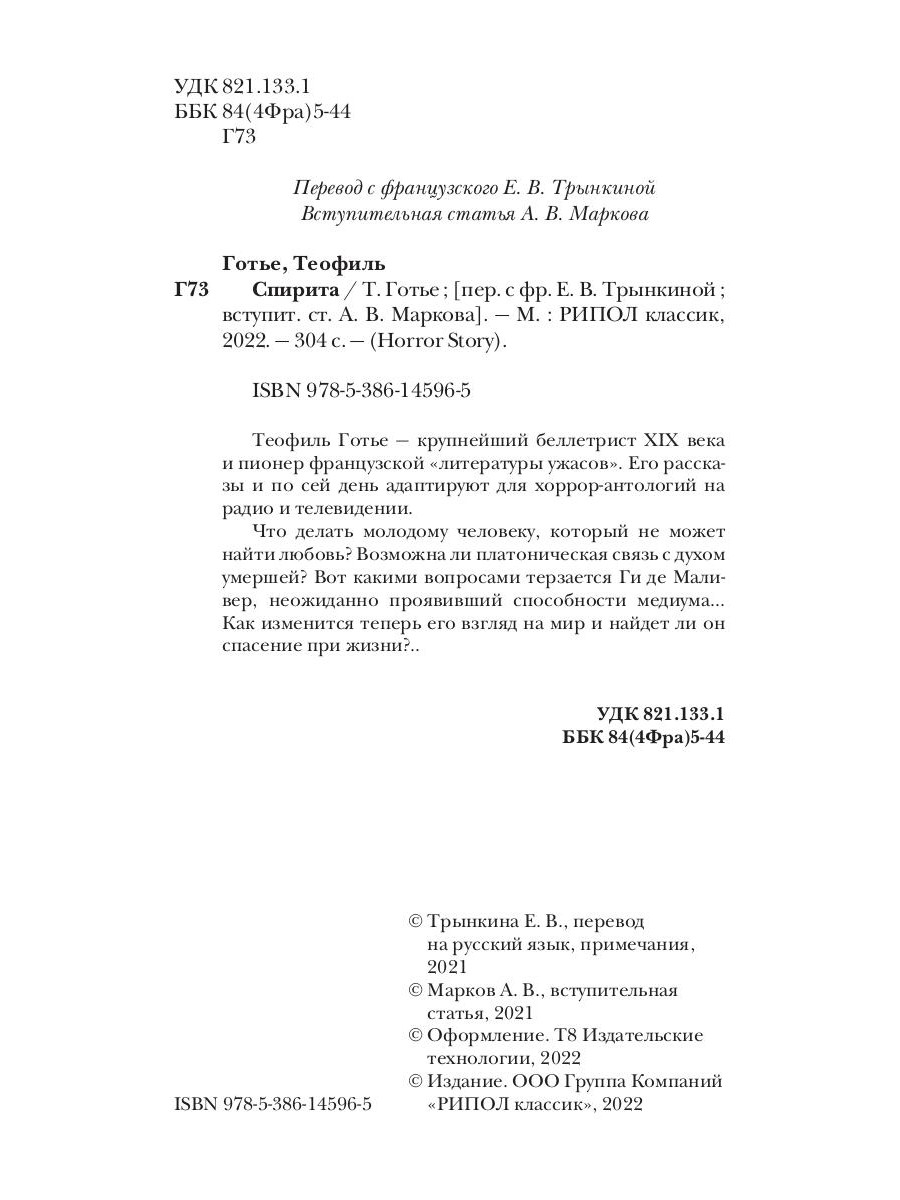 Теофиль Готье - крупнейший беллетрист XIX века и пионер французской «литературы ужасов». Его рассказы и по сей день адаптируют для хоррор-антологий на радио и телевидении. Что делать молодому человеку, который не может найти любовь? Возможна ли платоническая связь с духом умершей? Вот какими вопросами терзается Ги де Маливер, неожиданно для себя сыгравший ключевую роль на модном спиритическом сеансе… Как изменится теперь его взгляд на мир и найдет ли он спасение при жизни?..