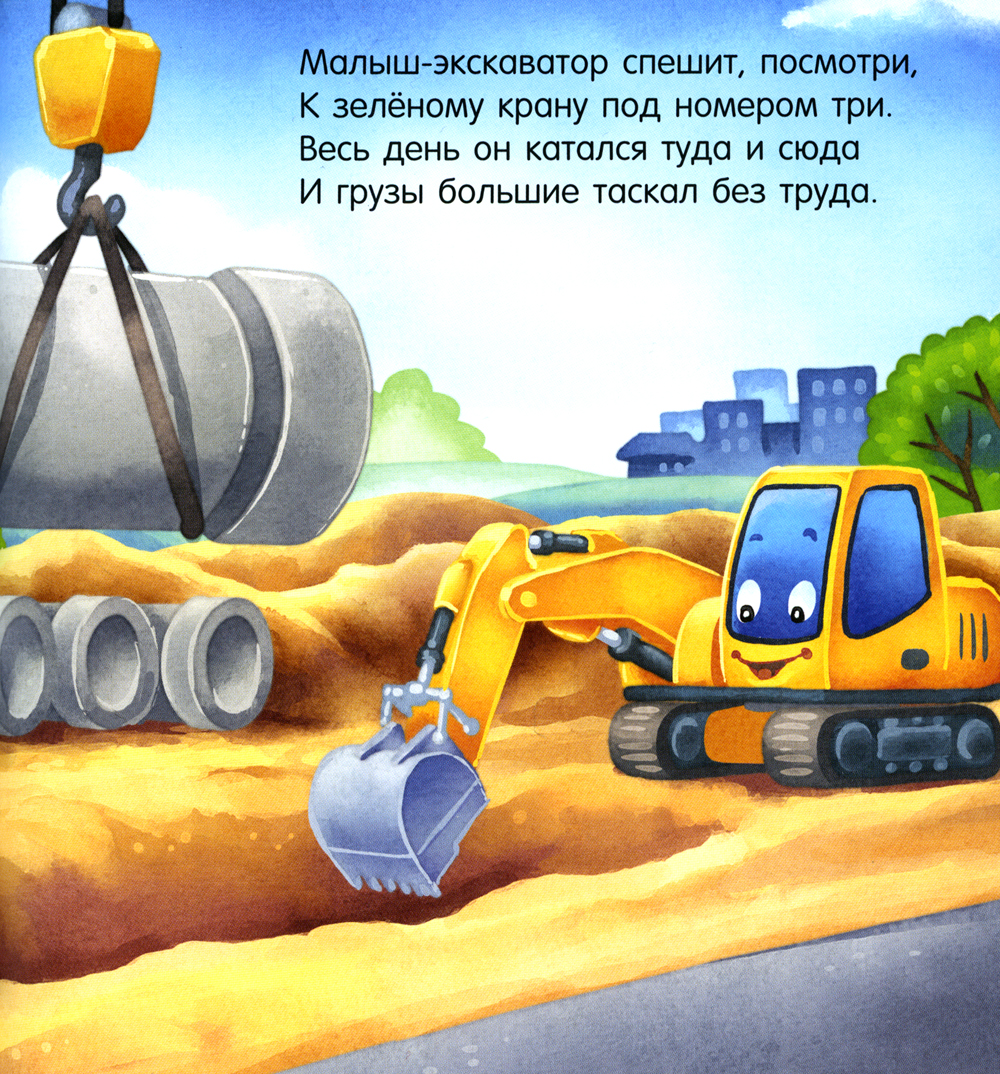 Малыш-экскаватор спешит, посмотри, К зелёному крану под номером три. Весь день он катался туда и сюда И грузы большие таскал без труда! Чудесная история о суматошной стройке, маленьком экскаваторе и его друзьях.| Издательство | Клевер-Медиа-Групп |