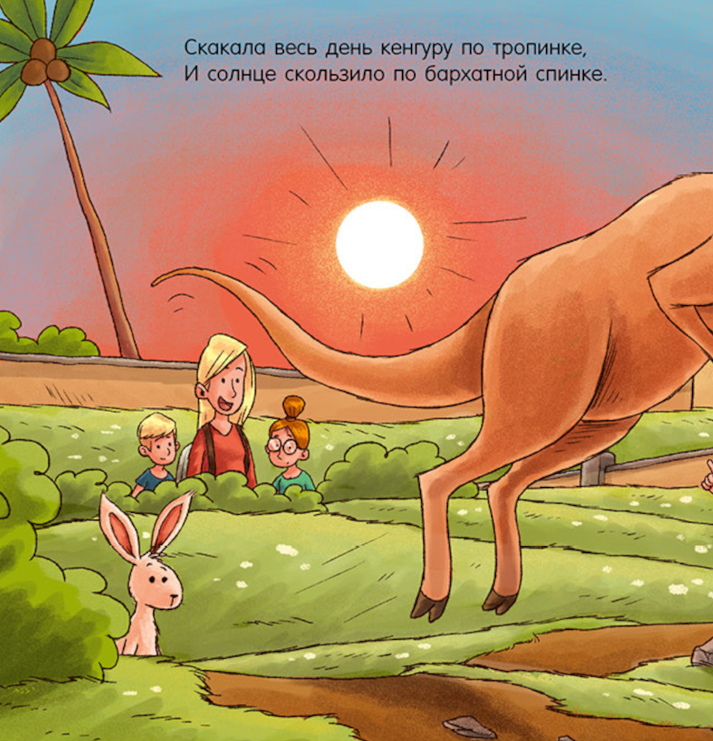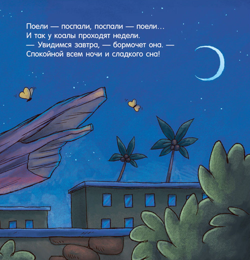 Маленькая коала живет в зоопарке, она только и делает, что ест. А потом спит. А потом снова ест. Ест зеленые листья и спит, уцепившись за ветку дерева. А что делали днем ее друзья? Львята играли и боролись, но вот пришел вечер, мама-львица уложила своих малышей спать. А кенгуру? Она скакала весь день и вот устала и тоже собирается прилечь. Уснули жирафы, бегемоты, зевает уставший слон. И даже шумные мартышки затихли. Луна выглянула на небо и пожелала всем сладких снов: - Увидимся завтра, - бормочет луна. - Спокойной всем ночи и сладкого сна! И детям, и родителям понравится прекрасный перевод в стихах Елены Фельдман. Ее рифмы точны, стихи ритмичны. Чтение позволит малышам тренировать память, развивать речь и чувство ритма.| Издательство | Клевер-Медиа-Групп |