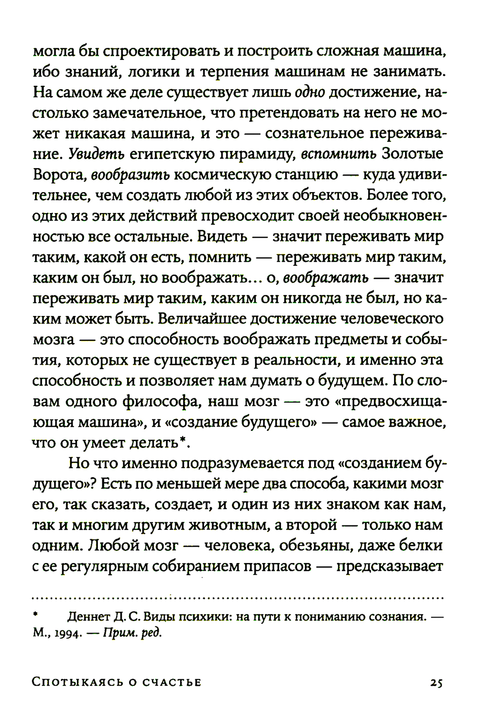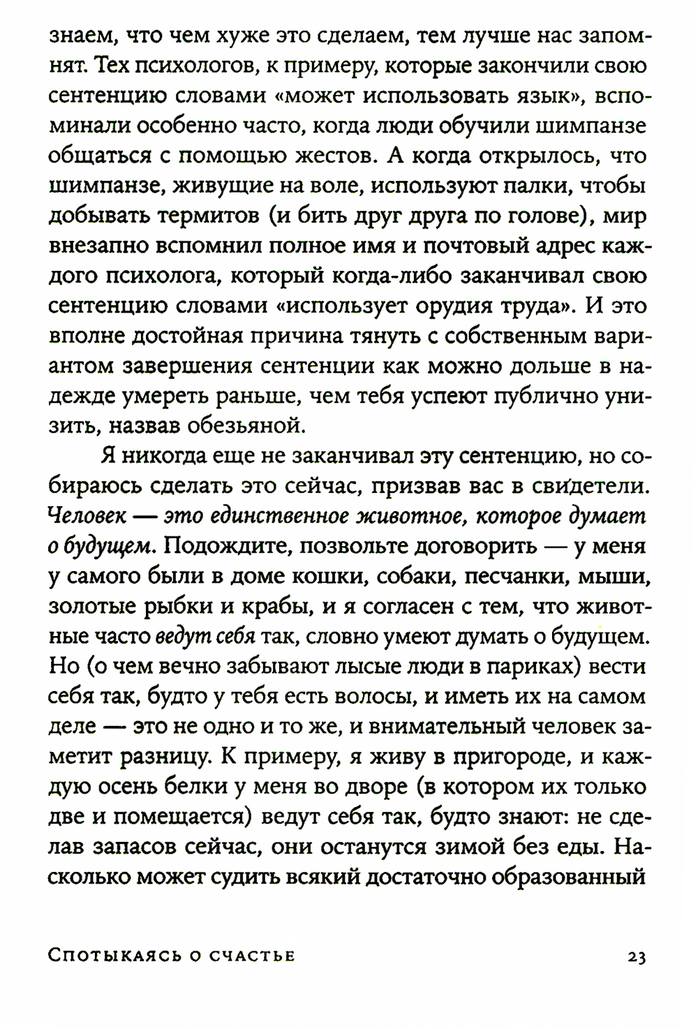 Люди тратят много сил, энергии и ресурсов, чтобы сделать себя счастливыми в будущем: на десятилетия вступают в ипотеку, мечтая о собственном жилье, берут кредиты под грабительские проценты ради комфорта в отремонтированном доме, делают карьеру, надрываясь на работе, чтобы когда-нибудь заработать на все блага жизни. Но в погоне за будущим мы забываем о том, что можно и нужно быть счастливыми в настоящем. В своей замечательной и остроумной книге, ставшей для десятков тысяч людей во всем мире настоящим руководством к действию, известный гарвардский психолог Дэниел Гилберт рассказывает о том, почему наши прогнозы о собственном счастье в будущем не совпадают с реальностью. Опираясь на теории и факты из психологии, когнитивной неврологии, философии и поведенческой экономики, автор доказывает нам, что счастье нужно создавать в настоящем!| Издательство | Альпина Паблишер |