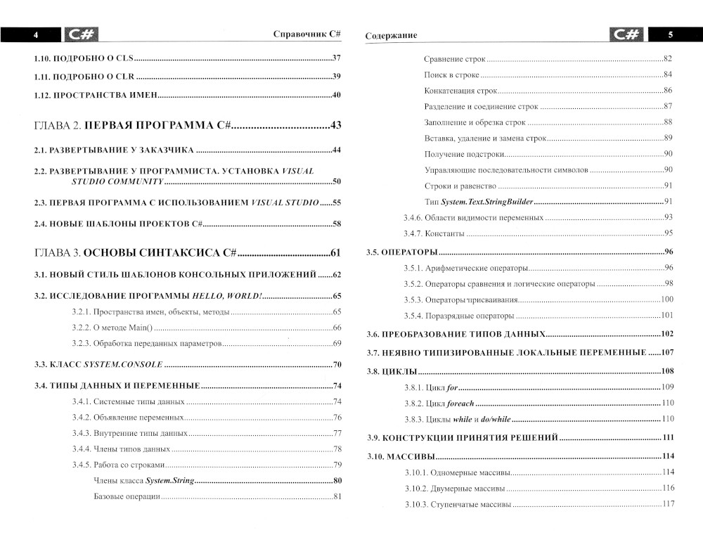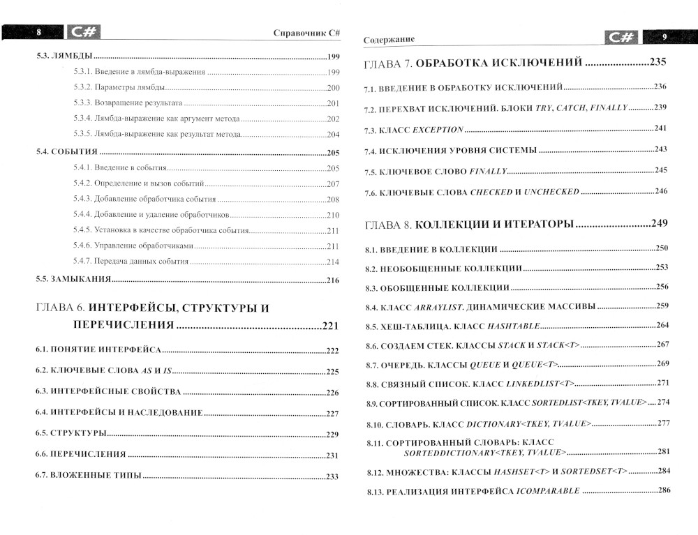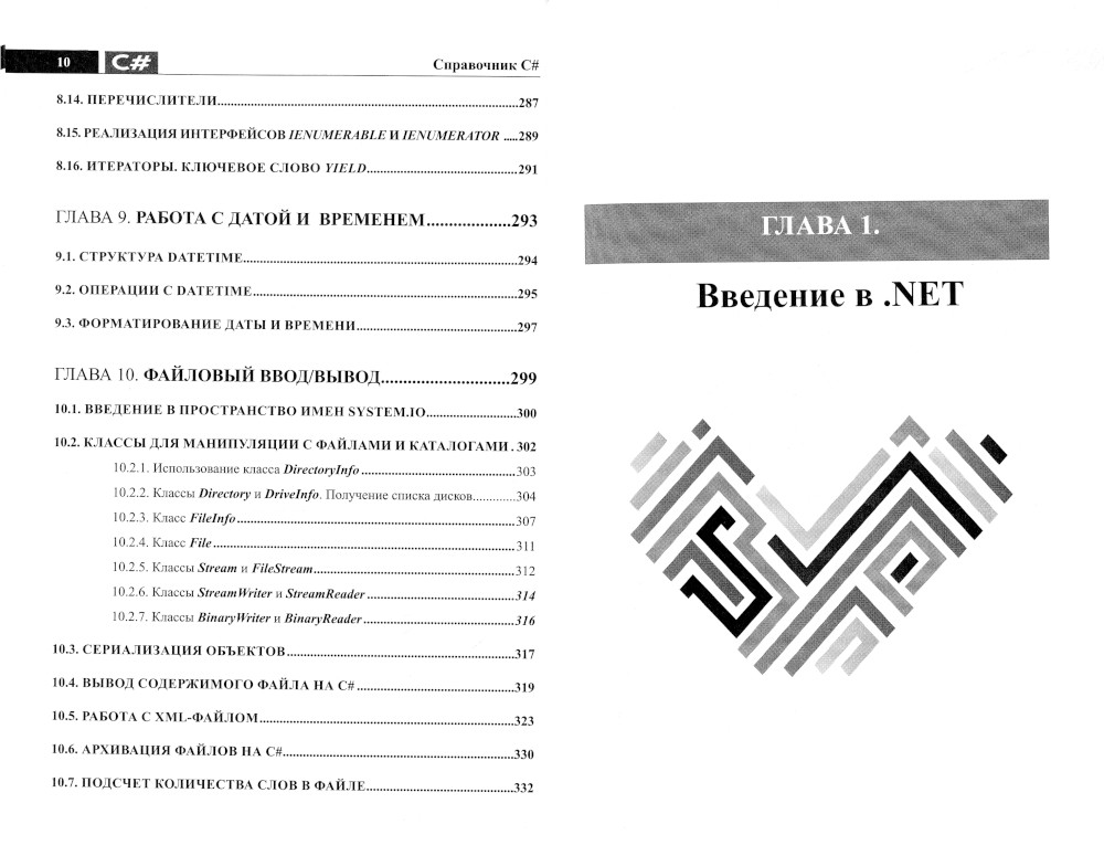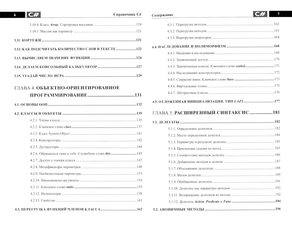 Данный справочник содержит ключевую информацию о C# в удобной и наглядной форме. Структура справочника позволяет быстро и легко находить нужную информацию, получать примеры использования тех или иных элементов и конструкций С#. Рассмотрены основы синтаксиса C# и первые программы на С#. Отдельное внимание уделено внимание таким темам, как: интерфейсы, структуры и перечисления; обработка исключений; коллекции и итераторы; объектно-ориентированное программирование на С#; работа с датой и временем и файловый ввод/вывод. Справочник будет полезен всем, кто использует или изучает С#: от начинающих до профессионалов.