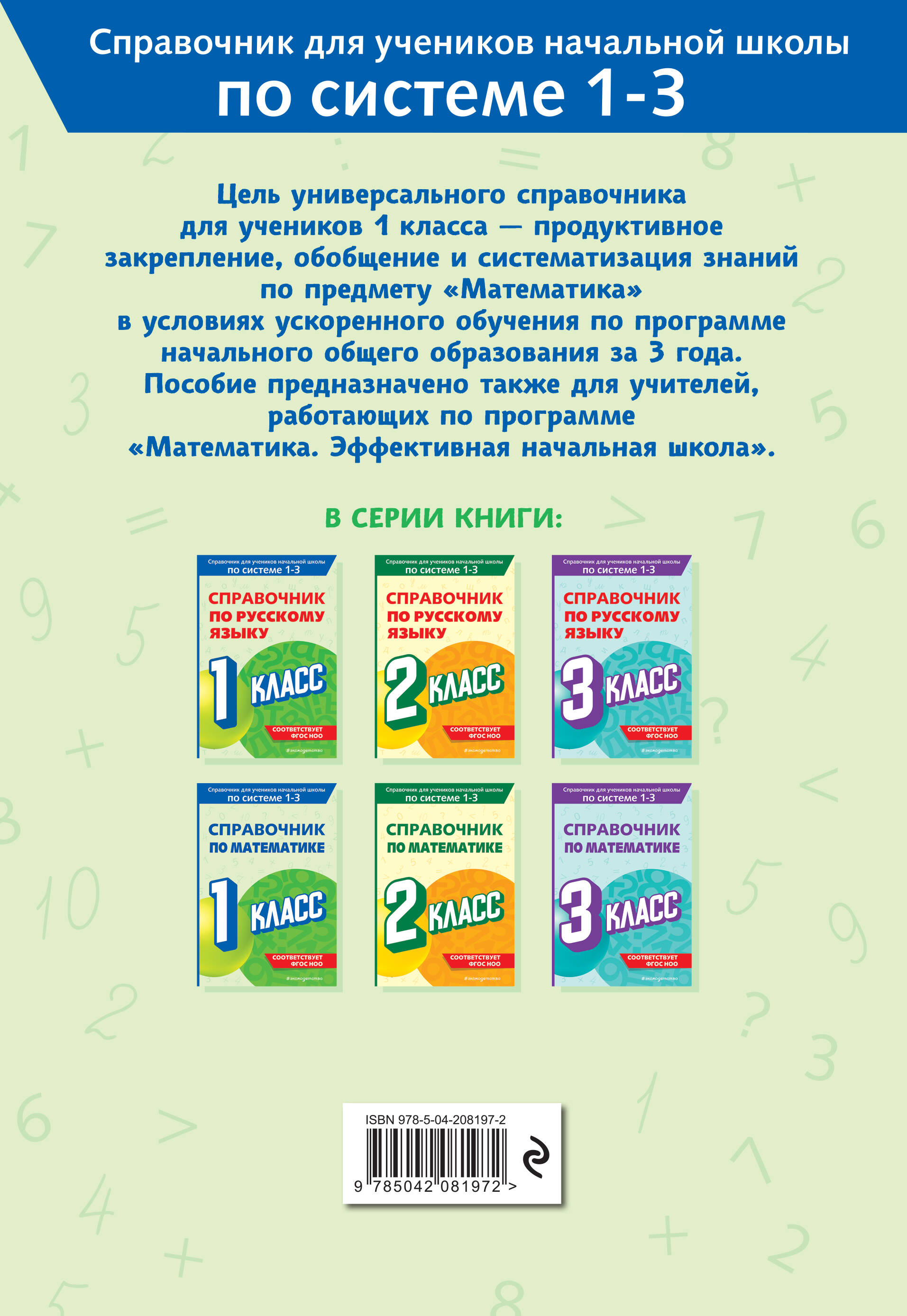 Справочник предназначен для младших школьников, обучающихся по ускоренной трёхлетней программе или по индивидуальному плану, а также для преподавателей, работающих по программе «Эффективная начальная школа». Главное требование к справочникам для учеников начальных классов - краткое и понятное изложение учебного материала. В данном пособии предельно доступно, в виде таблиц, схем, правил и примеров их применения, изложен весь курс математики за 1 класс по программе трёхлетнего обучения. Такая подача материала позволяет быстро найти нужную учебную информацию, основательно повторить и надёжно запомнить её. Современное и удобное в использовании пособие разработано в полном соответствии с требованиями ФГОС начального общего образования.| Издательство | ООО "Издательство "Эксмо" |