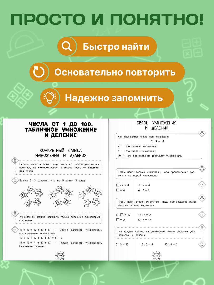 Справочник предназначен для младших школьников, обучающихся по ускоренной трёхлетней программе или по индивидуальному плану, а также для преподавателей, работающих по программе «Эффективная начальная школа». Главное требование к справочникам для учеников начальных классов - краткое и понятное изложение учебного материала. В данном пособии предельно доступно, в виде таблиц, схем, правил и примеров их применения, изложен весь курс математики за 2 класс по программе трёхлетнего обучения. Такая подача материала позволяет быстро найти нужную учебную информацию, основательно повторить и надёжно запомнить её. Современное и удобное в использовании пособие разработано в полном соответствии с требованиями ФГОС начального общего образования.| Издательство | ООО "Издательство "Эксмо" |