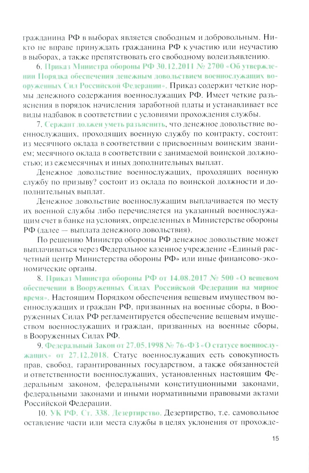 Изложенные материалы базируются на положениях новых уставных требований и предназначены помочь младшему командиру в воспитании и подготовке подчиненного ему личного состава взвода и отделения (расчета, экипажа). Материал подготовлен на основе опыта боевых действий в Афганистане, на Кавказе и в Сирийской Арабской Республике. Содержит рекомендации по обучению и воспитанию личного состава. Широко представлены современные виды вооружения, приборы и техника. Содержит методические советы по проведению занятий младшими командирами с подчиненными. Прошел предварительное тестирование у командиров бригад, командиров полков и командиров батальонов. Соответствует ФГОС ВО последнего поколения. Для студентов военных учебных заведений.| Издательство | КноРус |