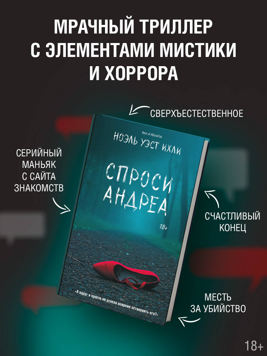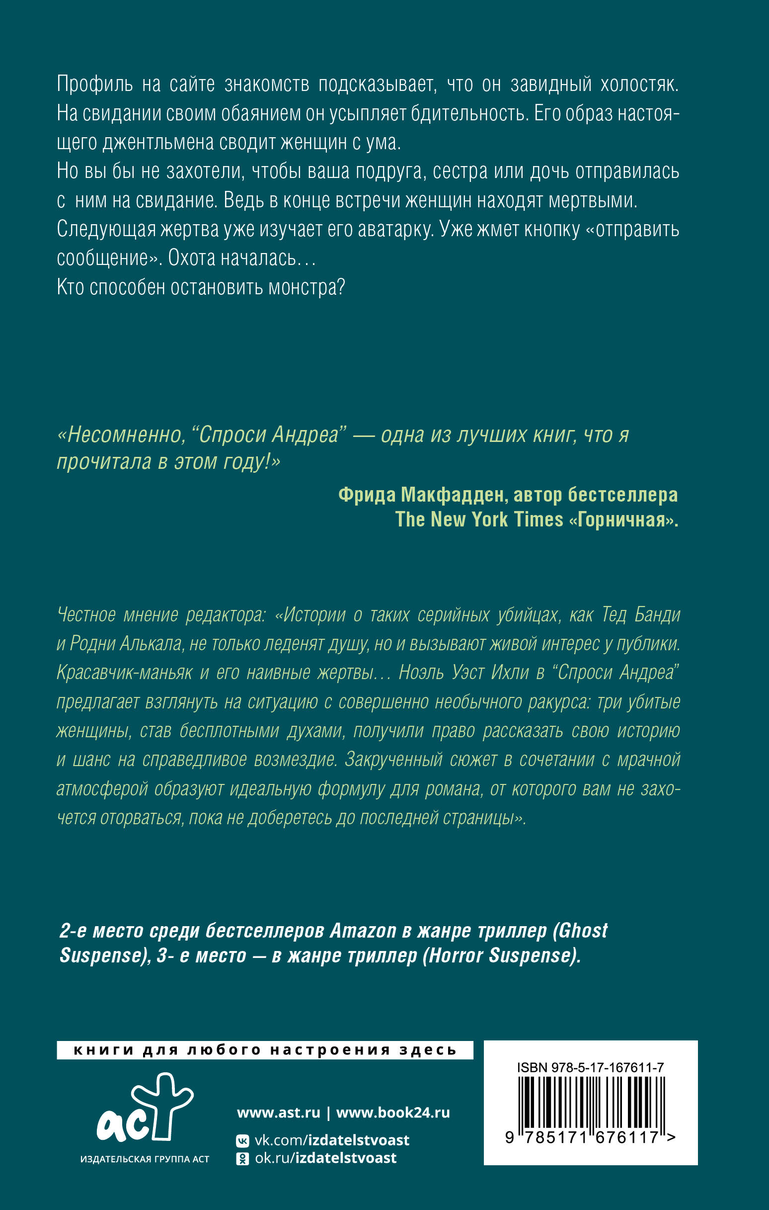 - Бестселлер #1 Amazon в жанре хоррор-саспенса - жуткая история о маньяке с сайта знакомств. - 62+ тысячи высоких оценок на Amazon. - Ноэль Уэст Ихли - мастер нестандартной страшной истории, в которой привычные тропы хоррора и психотриллера играют новыми красками. Ее предыдущий роман, триллер Run on Red, также стал бестселлером. - «Истории о таких серийных убийцах как Тед Банди и Родни Алькала не только леденят душу, но и вызывают живой интерес у публики. Красавчик-маньяк и его наивные жертвы… Ноэль Уэст Ихли в "Спроси Андреа" предлагает взглянуть на ситуацию с совершенно необычного ракурса: три убитые женщины, став бесплотными духами, получили право рассказать свою историю и шанс на справедливое возмездие» - редактор. - Серия «Не оглядывайся».| Издательство | Издательство "АСТ" |