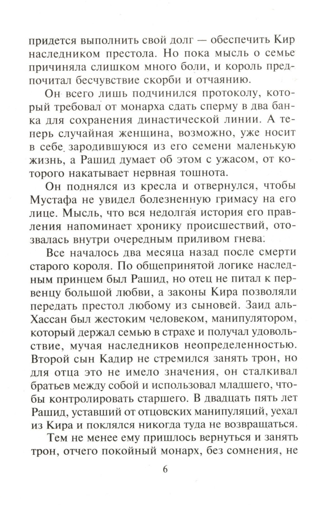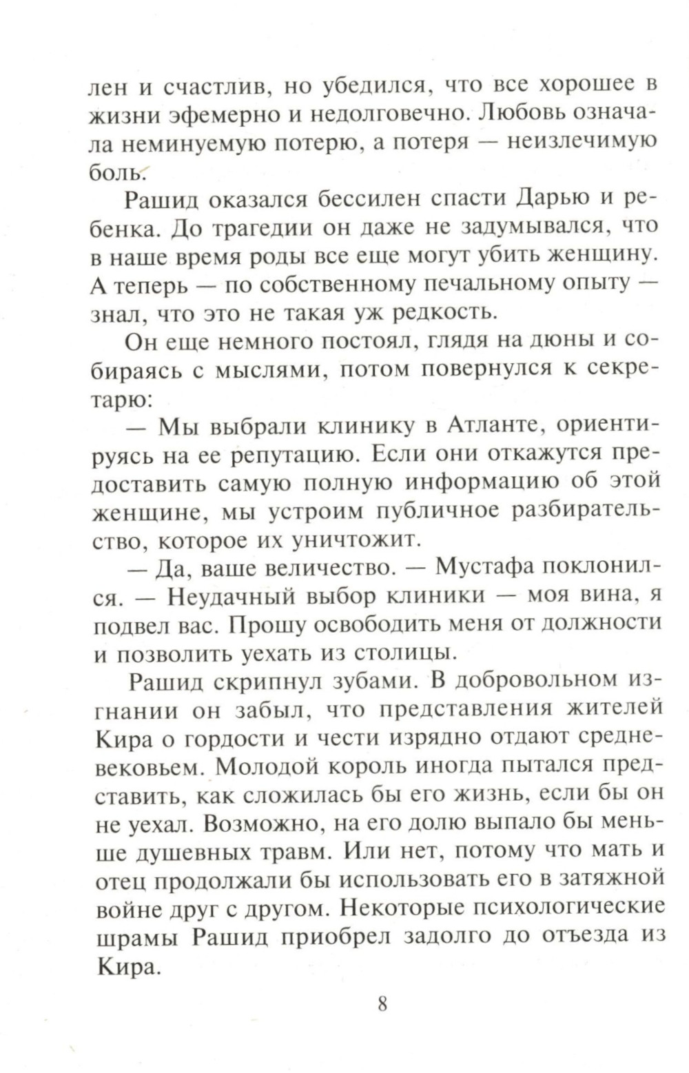 Шеридан Слоан решилась на ЭКО, чтобы родить ребенка для бесплодной сестры. Но из-за ошибки в клинике отцом ее будущего ребенка стал не зять, а король небольшой арабской страны Рашид аль-Хассан. По его воле Шеридан оказалась далеко от дома - замужем за едва знакомым мужчиной, замкнувшимся в себе после семейной трагедии. Сумеют ли Шеридан и Рашид понять, что их связывает нечто большее, чем стечение обстоятельств?..| Издательство | Центрполиграф |