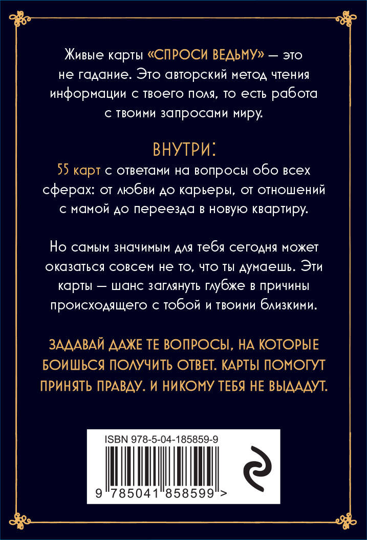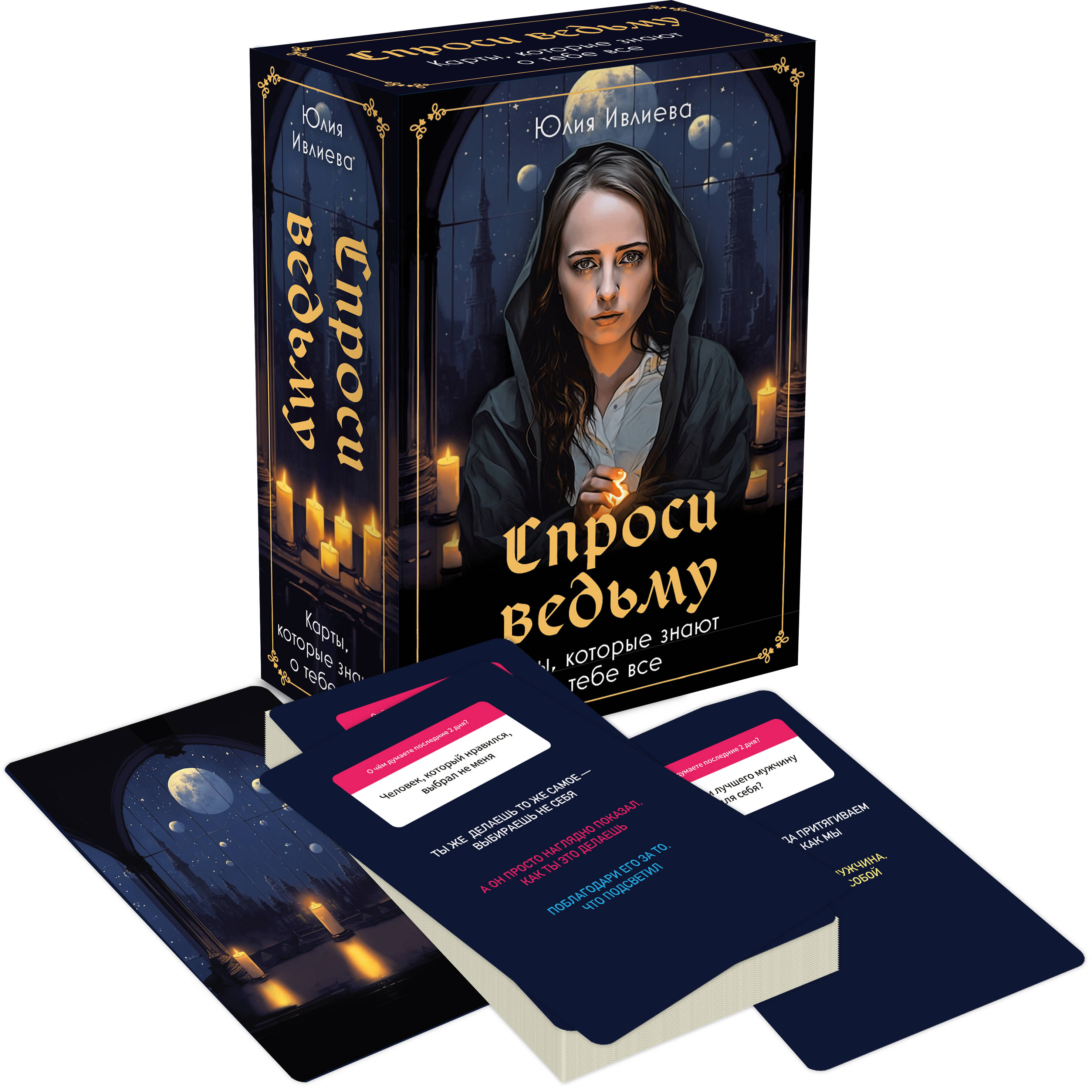ЭТА КОЛОДА - ПОМОЩНИК, КОТОРЫЙ КАЖДЫЙ ДЕНЬ БУДЕТ ГОВОРИТЬ ТЕБЕ ТОЛЬКО ПРАВДУ. Карты Юлии Ивлиевой «Спроси ведьму» - это не гадание. Это способ чтения информации с твоего поля, то есть работа над твоими запросами миру. В колоде 55 карт с ответами на вопросы обо всех сферах, от любви до карьеры, от отношений с мамой до переезда в новую квартиру. Но самым значимым для тебя сегодня может оказаться совсем не то, что ты думаешь. Эти карты - шанс заглянуть глубже в причины происходящего с тобой и твоими близкими. Задавай даже те вопросы, на которые боишься получить ответ. Карты помогут принять правду. И никому тебя не выдадут. Эти карты - живые. Живые вопросы и ответы на них. И эти вопросы Юлии Ивлиевой в течение двух лет задавали реальные люди в социальной сети. А она передавала ответы. Общаться с картами можно разными способами: ⁃ Задать свой вопрос и вытянуть карту. Вопрос на карте может отличаться от твоего. Но ответ - точно будет для тебя. ⁃ Спросить у карт - что для меня сейчас актуально? И вытянуть карту. Вопрос на карте и ответ - это то, что для тебя сейчас важнее всего. Даже если мысли посвящены другому. ⁃ Ты можешь использовать карты в работе с другими людьми и спрашивать у карт - на что мне обратить внимание при контакте с этим человеком? И ответ карты будет о том, что для него сейчас актуально, какая тема в его поле не проявлена. И сразу ответ. Упражняйся каждый день. И карты будут открывать тебе свои новые глубины.| Издательство | ООО "Издательство "Эксмо" |