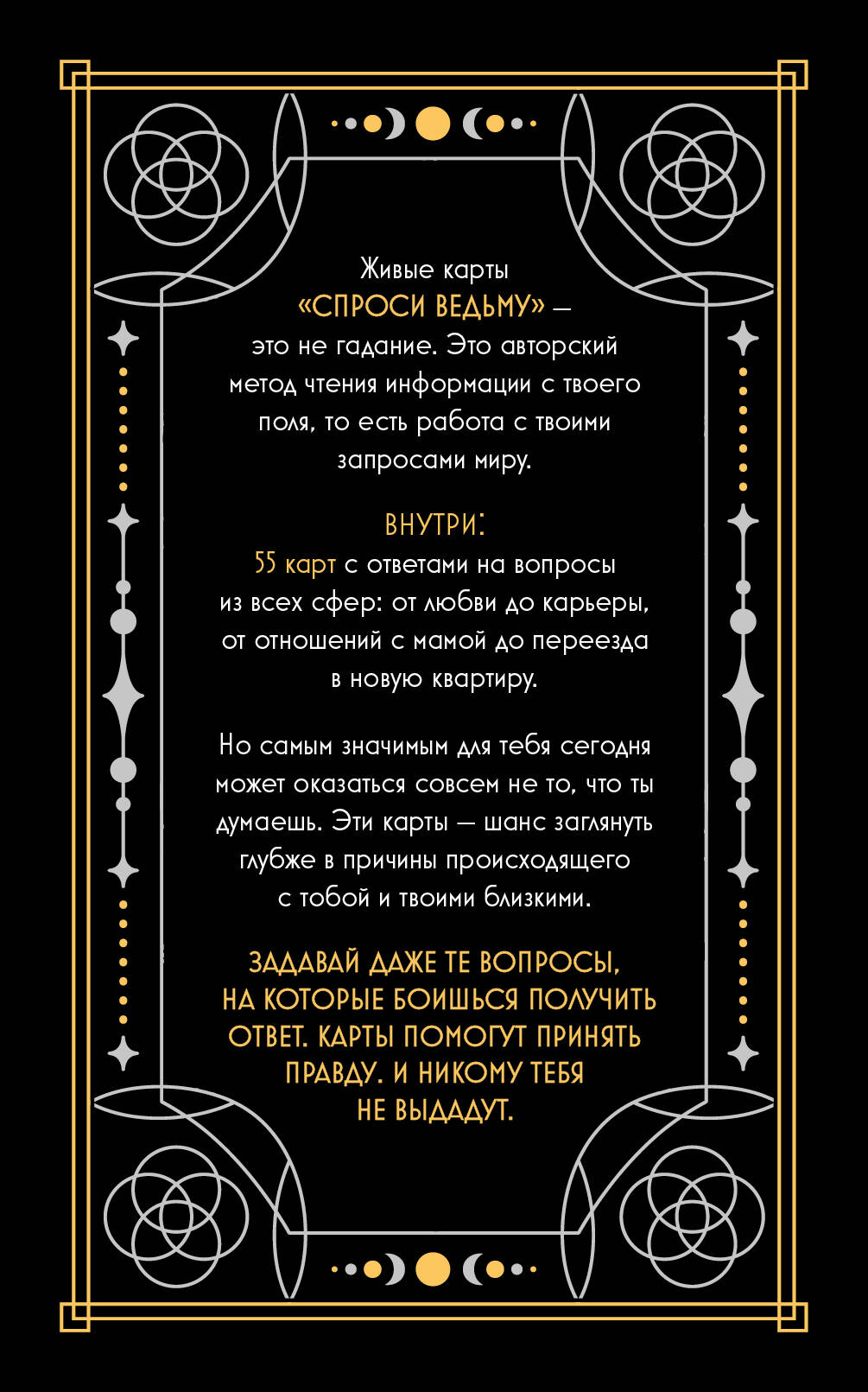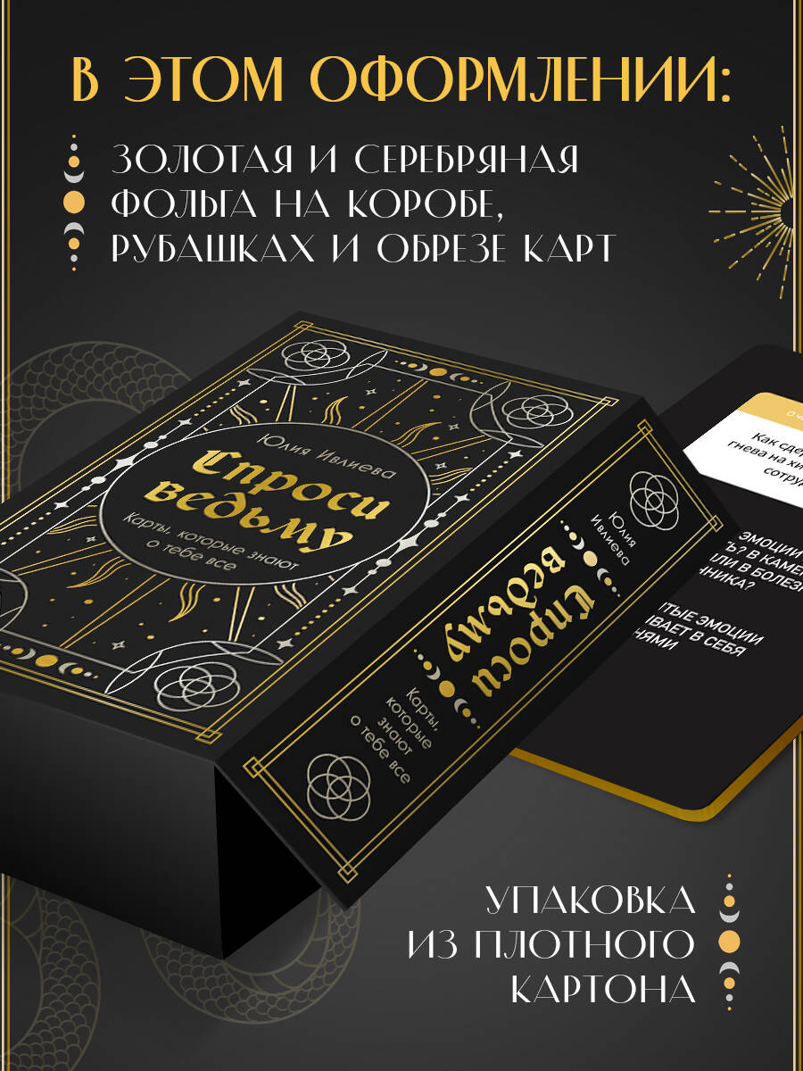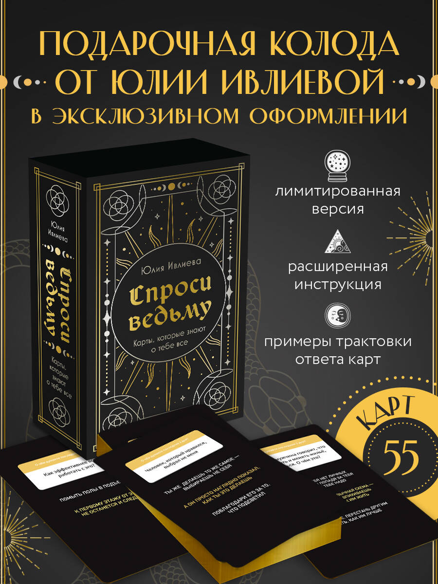 ЭТА КОЛОДА - ПОМОЩНИК, КОТОРЫЙ КАЖДЫЙ ДЕНЬ БУДЕТ ГОВОРИТЬ ТЕБЕ ТОЛЬКО ПРАВДУ. Подарочная колода «Спроси ведьму» от Юлии Ивлиевой - это ключ к разгадке тайн, источник вдохновения и мощный инструмент для самопознания. Живые карты «Спроси ведьму» - это не гадание. Это авторский метод чтения информации с твоего поля, то есть работа с твоими запросами миру. В колоде 55 карт с ответами на вопросы обо всех сферах, от любви до карьеры, от отношений с мамой до переезда в новую квартиру. Уникальный дизайн, глубокие смыслы и неиссякаемый потенциал для творчества сделают эту колоду верным спутником каждого твоего дня. Задавай даже те вопросы, на которые боишься получить ответ. Карты помогут принять правду. И никому тебя не выдадут. Эти карты - живые. Живые вопросы и ответы на них. И эти вопросы Юлии Ивлиевой в течение двух лет задавали реальные люди в социальной сети. А она передавала ответы. Общаться с картами можно разными способами: ⁃ Задать свой вопрос и вытянуть карту. Вопрос на карте может отличаться от твоего. Но ответ - точно будет для тебя. ⁃ Спросить у карт - что для меня сейчас актуально? И вытянуть карту. Вопрос на карте и ответ - это то, что для тебя сейчас важнее всего. Даже если мысли посвящены другому. ⁃ Ты можешь использовать карты в работе с другими людьми и спрашивать у карт - на что мне обратить внимание при контакте с этим человеком? И ответ карты будет о том, что для него сейчас актуально, какая тема в его поле не проявлена. И сразу ответ. В этой лимитированной подарочной версии - расширенная инструкция по работе с картами, с примерами трактовки ответа карт. Упражняйся каждый день. И карты будут открывать тебе свои новые глубины.