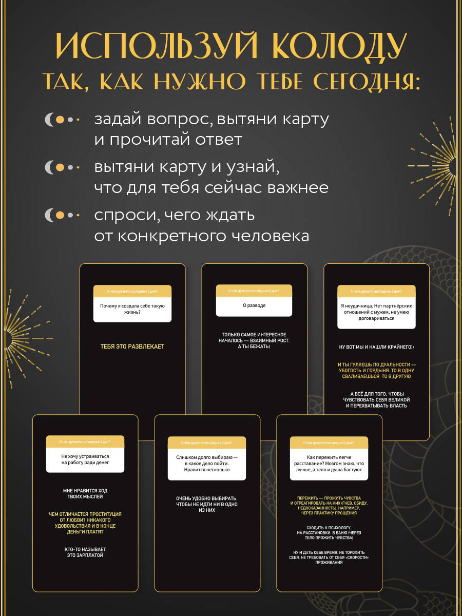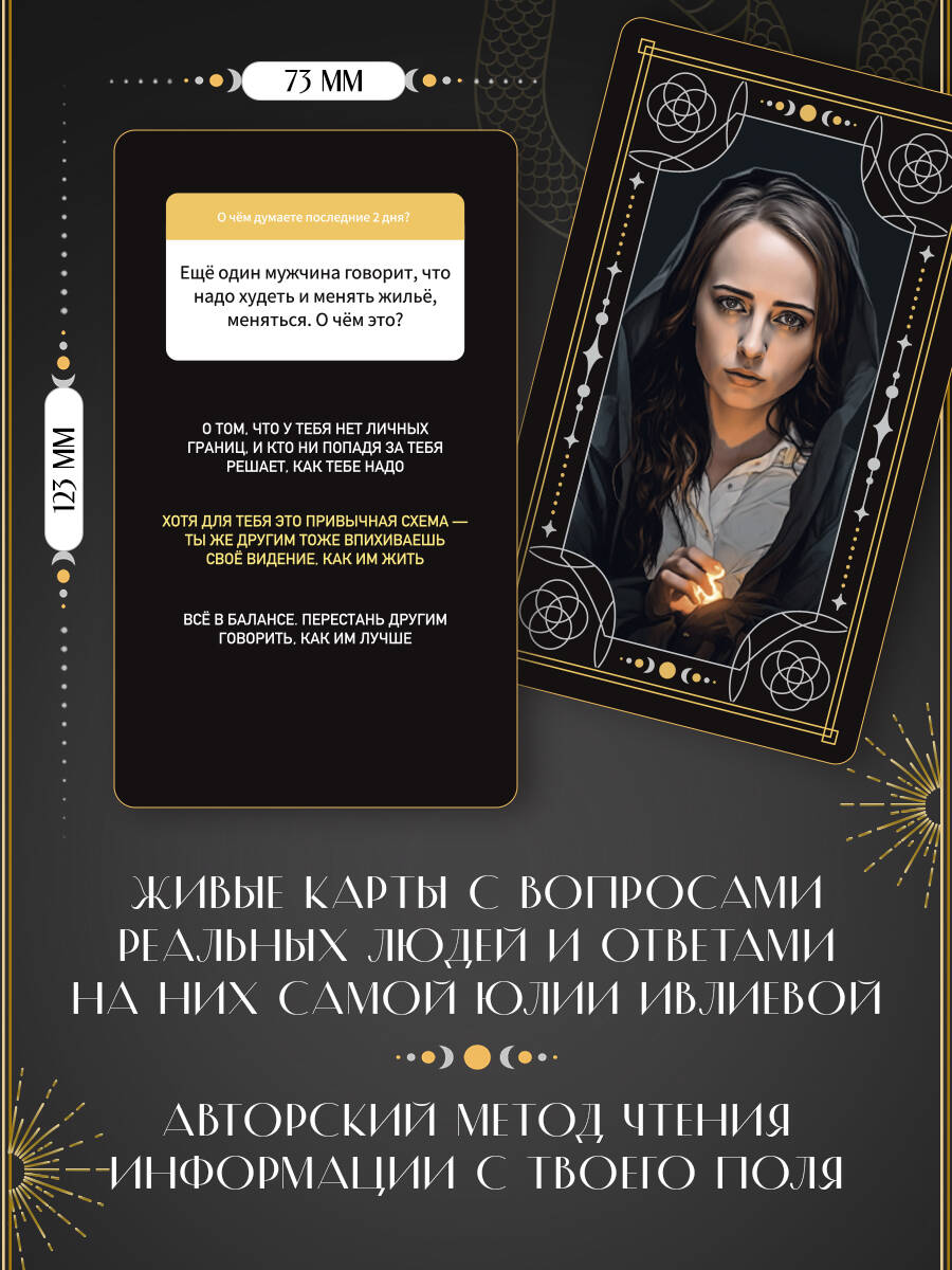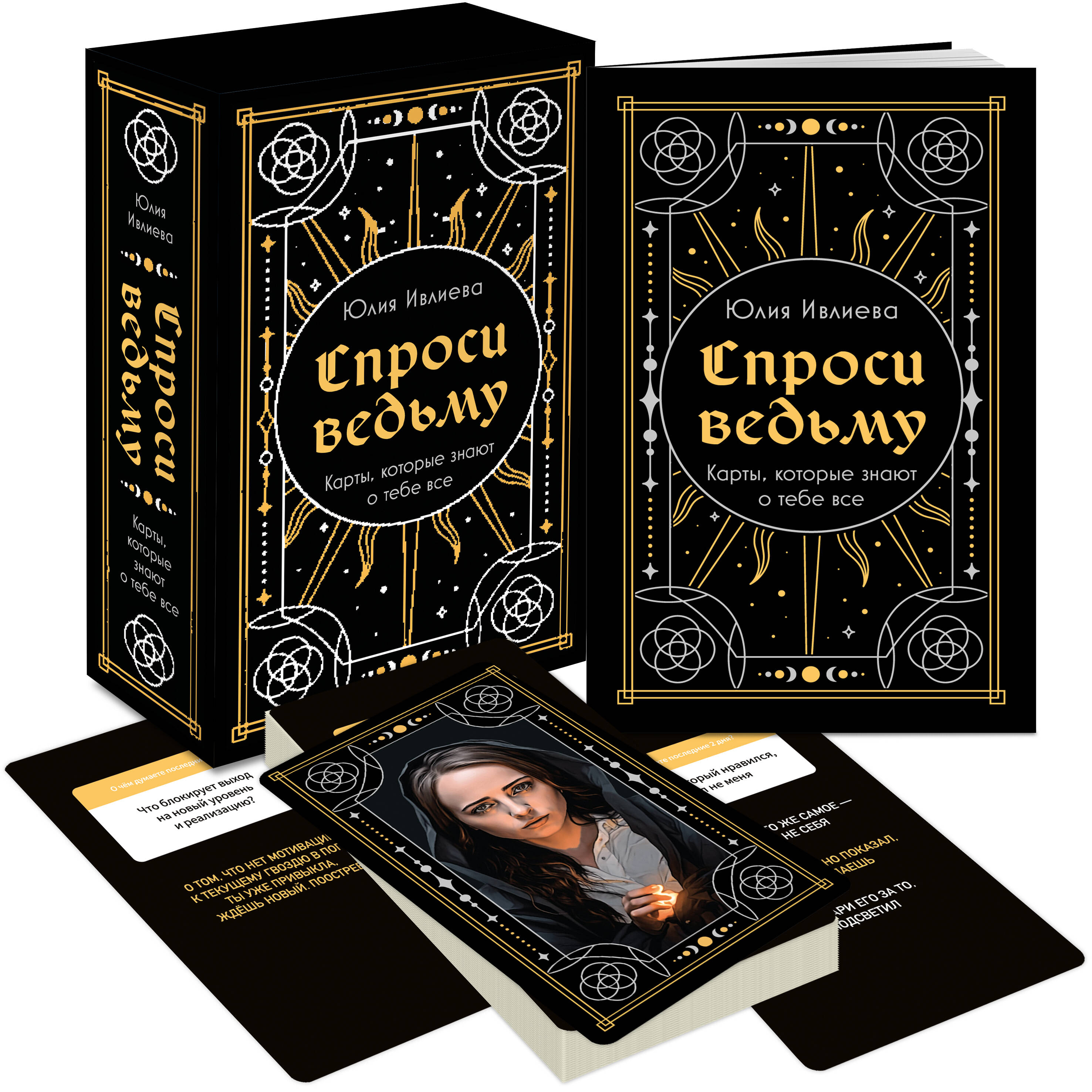 ЭТА КОЛОДА - ПОМОЩНИК, КОТОРЫЙ КАЖДЫЙ ДЕНЬ БУДЕТ ГОВОРИТЬ ТЕБЕ ТОЛЬКО ПРАВДУ. Подарочная колода «Спроси ведьму» от Юлии Ивлиевой - это ключ к разгадке тайн, источник вдохновения и мощный инструмент для самопознания. Живые карты «Спроси ведьму» - это не гадание. Это авторский метод чтения информации с твоего поля, то есть работа с твоими запросами миру. В колоде 55 карт с ответами на вопросы обо всех сферах, от любви до карьеры, от отношений с мамой до переезда в новую квартиру. Уникальный дизайн, глубокие смыслы и неиссякаемый потенциал для творчества сделают эту колоду верным спутником каждого твоего дня. Задавай даже те вопросы, на которые боишься получить ответ. Карты помогут принять правду. И никому тебя не выдадут. Эти карты - живые. Живые вопросы и ответы на них. И эти вопросы Юлии Ивлиевой в течение двух лет задавали реальные люди в социальной сети. А она передавала ответы. Общаться с картами можно разными способами: ⁃ Задать свой вопрос и вытянуть карту. Вопрос на карте может отличаться от твоего. Но ответ - точно будет для тебя. ⁃ Спросить у карт - что для меня сейчас актуально? И вытянуть карту. Вопрос на карте и ответ - это то, что для тебя сейчас важнее всего. Даже если мысли посвящены другому. ⁃ Ты можешь использовать карты в работе с другими людьми и спрашивать у карт - на что мне обратить внимание при контакте с этим человеком? И ответ карты будет о том, что для него сейчас актуально, какая тема в его поле не проявлена. И сразу ответ. В этой лимитированной подарочной версии - расширенная инструкция по работе с картами, с примерами трактовки ответа карт. Упражняйся каждый день. И карты будут открывать тебе свои новые глубины.