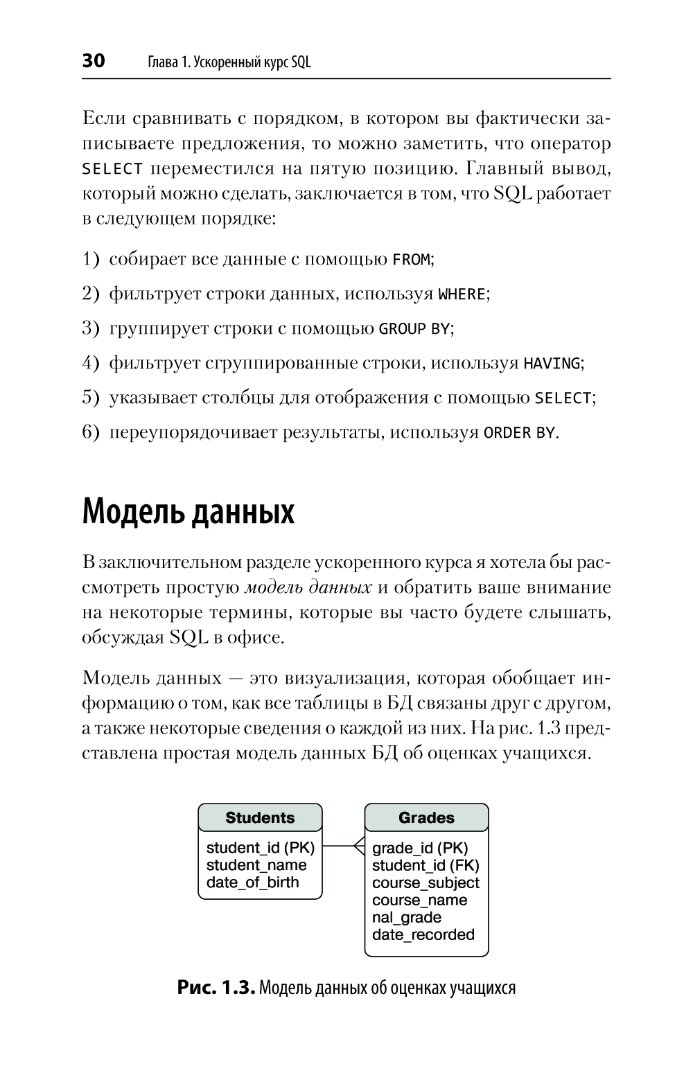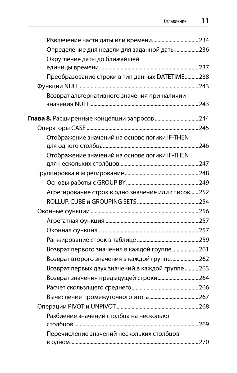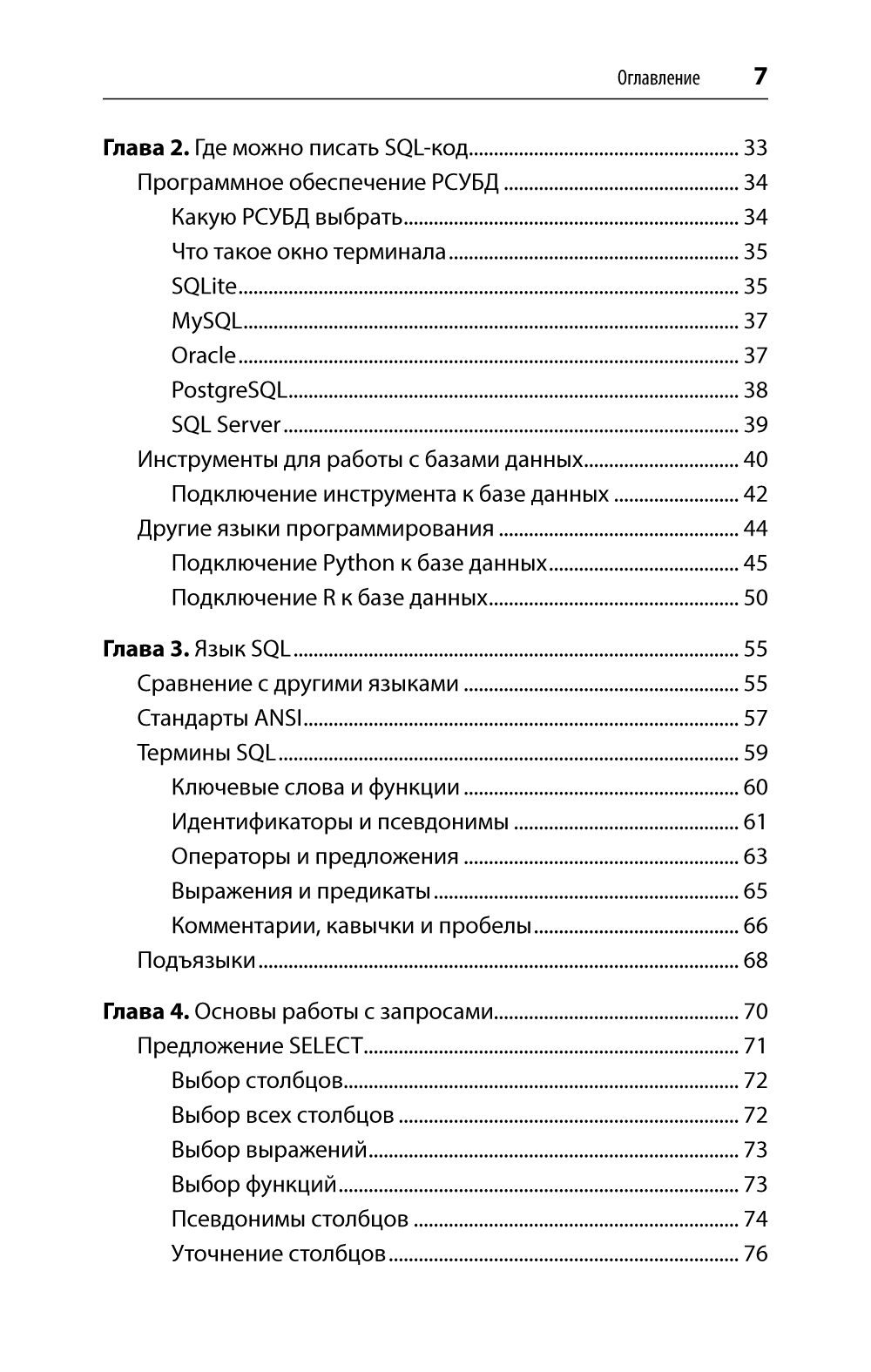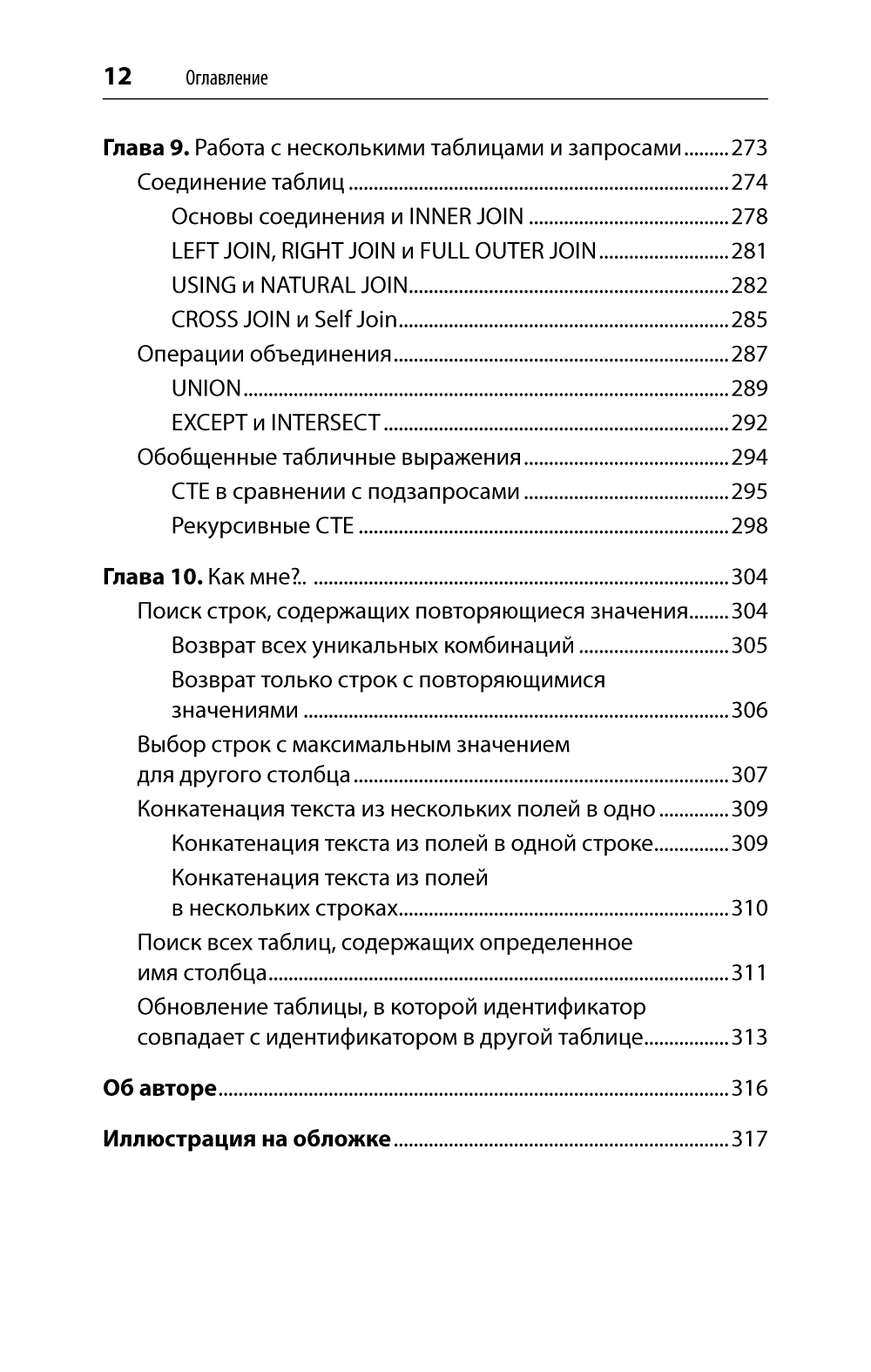 Если вы аналитик или инженер по обработке данных и используете SQL, популярный карманный справочник станет для вас идеальным помощником. Найдите множество примеров, раскрывающих все сложности языка, а также ключевые аспекты SQL при его использовании в Microsoft SQL Server, MySQL, Oracle Database, PostgreSQL и SQLite. В обновленном издании Элис Жао описывает, как в этих СУБД используется SQL для формирования запросов и внесения изменений в базу. Получите подробную информацию о типах данных и их преобразованиях, синтаксисе регулярных выражений, оконных функциях, операторах PIVOT и UNPIVOT и многом другом.| Издательство | Спринт Бук |