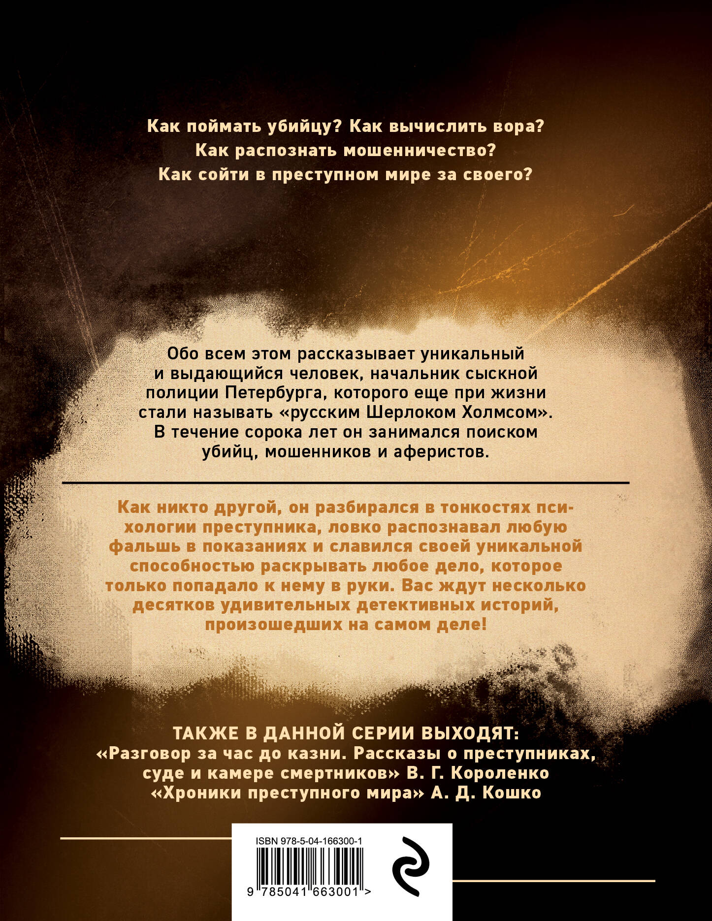 Первого начальника сыскной полиции Петербурга еще при жизни стали называть «Русским Шерлоком Холмсом». Он был поистине легендарной личностью. О нем писали романы и очерки, а впоследствии снимали фильмы и сериалы. За сорок лет работы он раскрыл сотни преступлений, многие из которых стали резонансными. О самых интересных, ловких и остроумных преступлениях он рассказывает на страницах своих воспоминаний. В легкой и увлекательной манере классического детективного романа начала XX века он рассказывает об устройстве преступного мира, с горькой печалью повествует о сложных судьбах грабителей и убийц и с сочувствием рассказывает о жертвах преступлений. Вам предстоит уникальное путешествие в преступный мир Петербурга конца XIX и начала XX века. Из воспоминаний великого русского юриста А. Кони: «Начальник петербургской сыскной полиции Иван Дмитриевич Путилин был одной из тех даровитых личностей, которых умел искусно выбирать и, тем не менее, искусно держать в руках старый петербургский градоначальник Ф. Ф. Трепов. По природе своей Путилин был чрезвычайно даровит и как бы создан для своей должности. Необыкновенно тонкое внимание и чрезвычайная наблюдательность, в которой было какое-то особое чутьё, заставлявшее его вглядываться в то, мимо чего все проходят безучастно, соединялись в нём со спокойной сдержанностью, большим юмором и своеобразным лукавым добродушием. В Петербурге в первой половине 70-х годов не было ни одного большого и сложного уголовного дела, в розыск по которому Путилин не вложил бы своего труда. Мне наглядно пришлось ознакомиться с его удивительными способностями для исследования преступлений в январе 1873 года, когда в Александро-Невской лавре было обнаружено убийство иеромонаха Иллариона… Поздно вечером, в тот же день, мне дали знать, что убийца арестован».| Издательство | ООО "Издательство "Эксмо" |