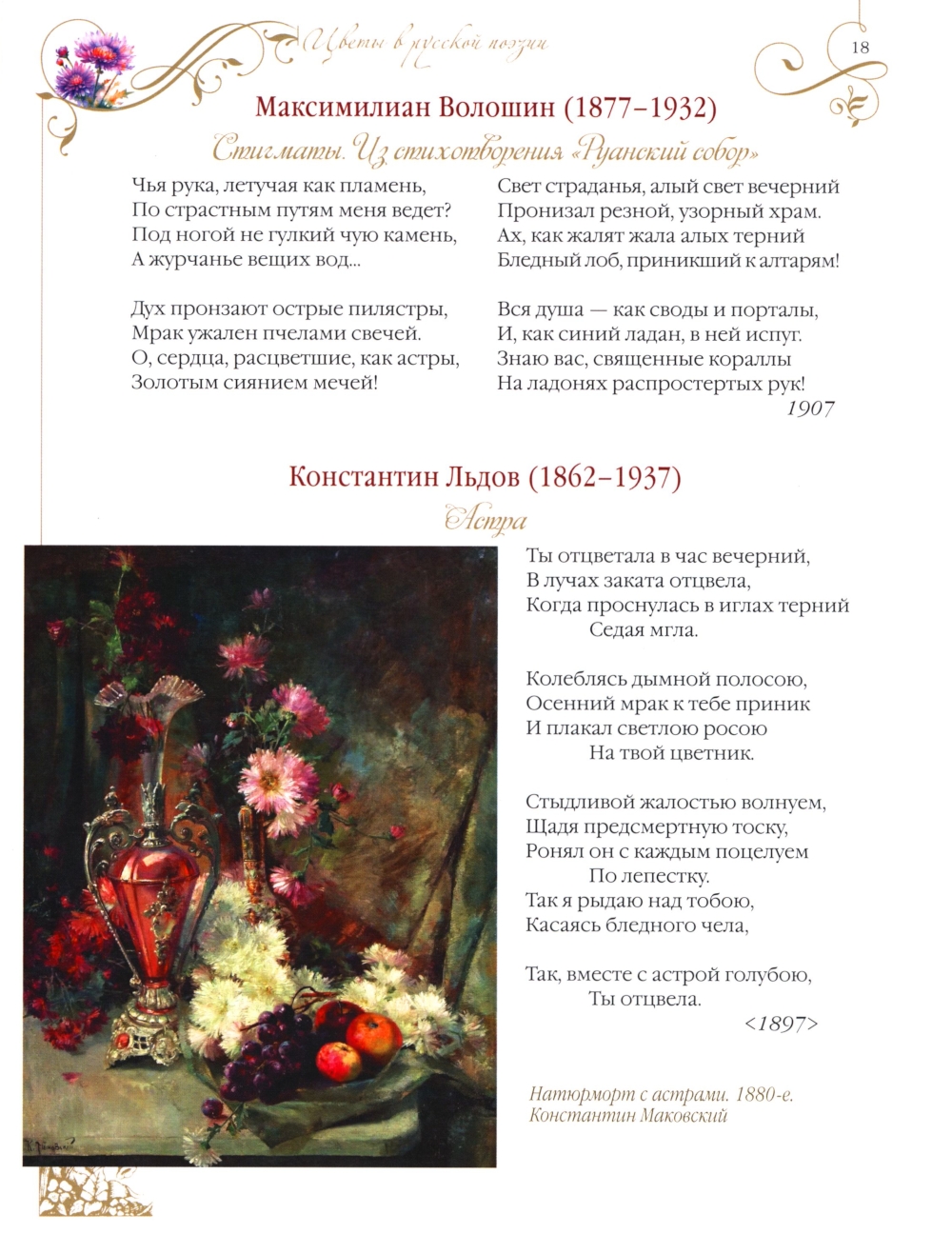 Редкая книга может стать прекрасным подарком одновременно для любителей поэзии и прекрасной флоры! Почти 400 произведений сотни русских поэтов представлены здесь не по эпохам или именам авторов, а - по «героям» этих стихов, цветам. Главы книги - как удивительные по красоте портреты трех десятков цветов - «беззвучной музыки земли»: от пионов, роз и гвоздик до жасмина, лотоса и черемухи. Эту музыку вы расслышите благодаря мастерству поэтов разных эпох - от пушкинской поры до начала XX века, через классицизм и романтизм к модернизму и авангарду. Стихи великих русских поэтов и впечатляющие живописные полотна отечественных художников образуют симбиоз, открывая новые грани восприятия природы и человеческих чувств. Отправляйтесь в путешествие по страницам истории культуры, в котором каждый цветок - ключ к пониманию глубины русской души.| Издательство | Просвещение-Союз |