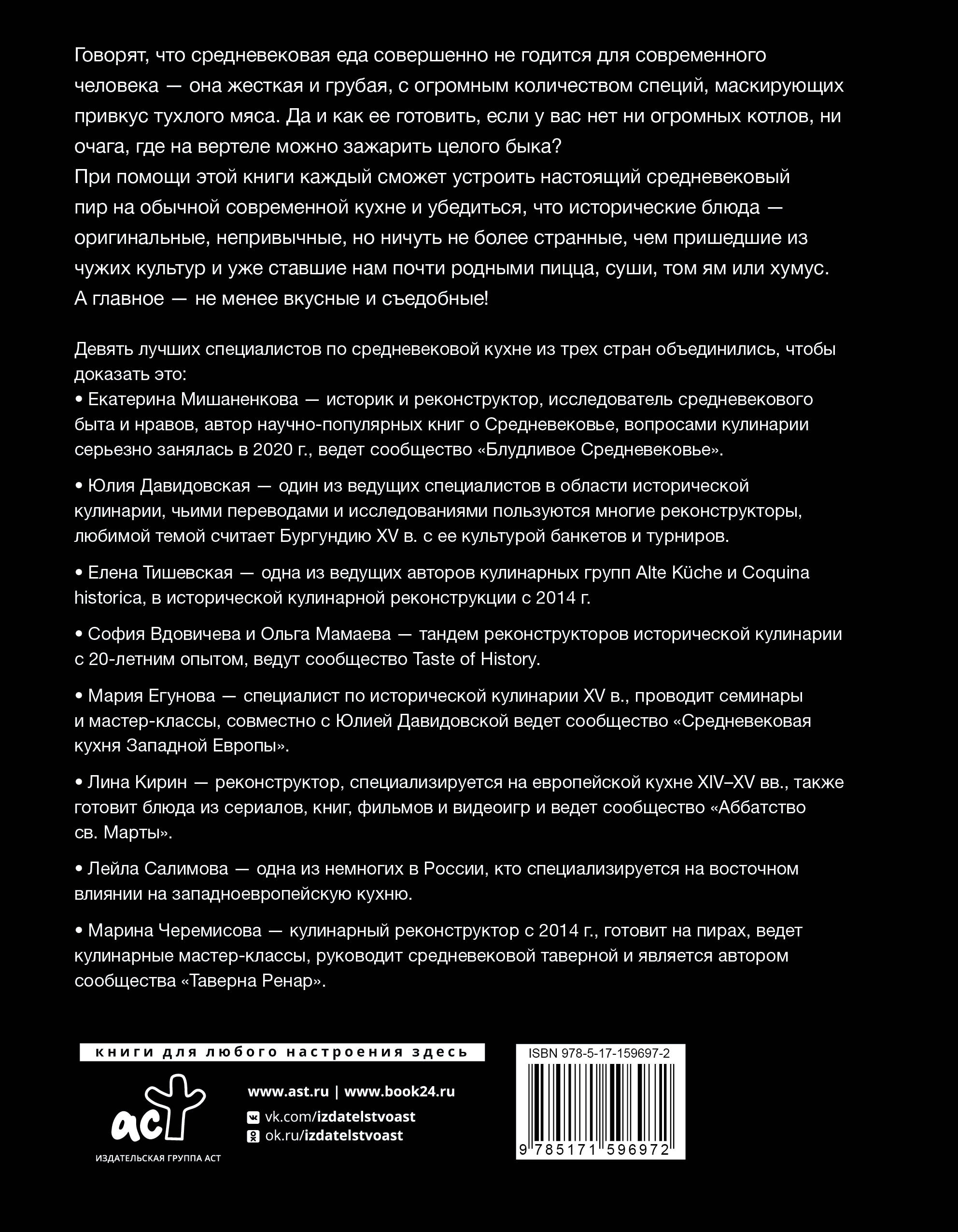 Говорят, что средневековая еда совершенно не годится для современного человека - она жесткая и грубая, с огромным количеством специй, маскирующих привкус тухлого мяса. Да и как ее готовить, если у вас нет ни огромных котлов, ни очага, где на вертеле можно зажарить целого быка? При помощи этой книги каждый сможет устроить настоящий средневековый пир на обычной современной кухне и убедиться, что исторические блюда - оригинальные, непривычные, но ничуть не более странные, чем пришедшие из чужих культур и уже ставшие нам почти родными пицца, суши, том ям или хумус. А главное - не менее вкусные и съедобные! Девять лучших специалистов по средневековой кухне из трех стран объединились, чтобы доказать это: • Екатерина Мишаненкова - историк и реконструктор, исследователь средневекового быта и нравов, автор научно-популярных книг о Средневековье, вопросами кулинарии серьезно занялась в 2020 г., ведет сообщество "Блудливое Средневековье". • Юлия Давидовская - один из ведущих специалистов в области исторической кулинарии, чьими переводами и исследованиями пользуются многие реконструкторы, любимой темой считает Бургундию XV в. с ее культурой банкетов и турниров. • Елена Тишевская - одна из ведущих авторов кулинарных групп Alte Küche и Coquina historica, в исторической кулинарной реконструкции с 2014 г. • София Вдовичева и Ольга Мамаева - тандем реконструкторов исторической кулинарии с 20-летним опытом, ведут сообщество Taste of History. • Мария Егунова - специалист по исторической кулинарии XV в., проводит семинары и мастер-классы, совместно с Юлией Давидовской ведет сообщество "Средневековая кухня Западной Европы". • Лина Кирин - реконструктор, специализируется на европейской кухне XIV-XV вв., также готовит блюда из сериалов, книг, фильмов и видеоигр и ведет сообщество "Аббатство св. Марты". • Лейла Салимова - одна из немногих в России, кто специализируется на восточном влиянии на западноевропейскую кухню. • Марина Черемисова - кулинарный реконструктор с 2014 г., готовит на пирах, ведет кулинарные мастер-классы, руководит средневековой таверной и является автором сообщества "Таверна Ренар".