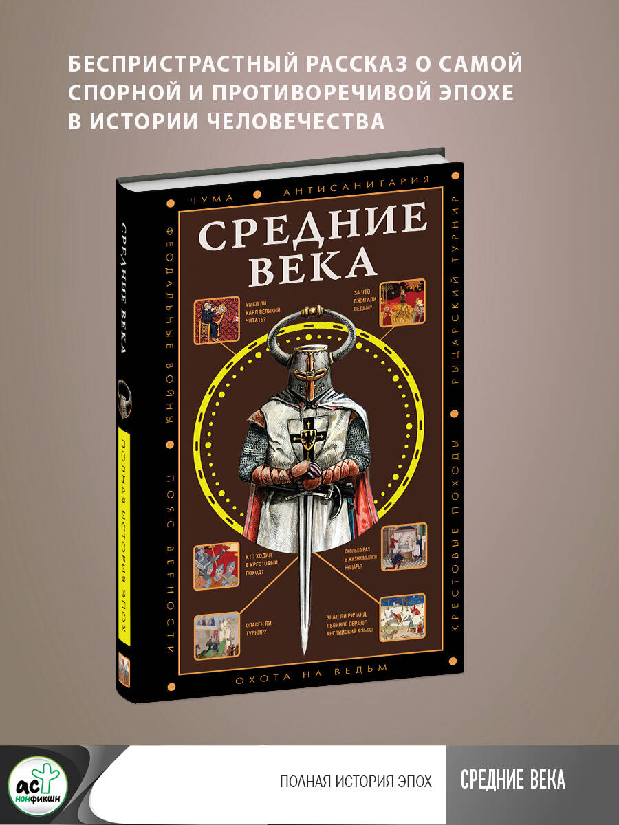 Средневековье. Самая спорная и противоречивая эпоха в истории человечества. Одни воспринимают ее как времена прекрасных дам и благородных рыцарей, менестрелей и скоморохов, когда ломались копья, шумели пиры, пелись серенады и звучали проповеди. Для других же Средневековье - это время фанатиков и палачей, костров инквизиции, вонючих городов, эпидемий, жестоких обычаев, антисанитарии, всеобщей темноты и дикости. Неужели правда, что рыцари и вообще люди в Средние века были маленького роста -не выше полутора метров, а те, кто достигал нынешних средних 175 см считались чуть ли не гигантами? И в Средневековье на самом деле никто кроме монахов не умел читать и писать, мылись всего два раза в жизни - после рождения и перед смертью, жутко воняли и кишели блохами? И меч весил 20 кг, а доспехи все 100, поэтому рыцаря поднимали на коня с помощью лебедки, и в туалет ему ходить приходилось прямо в доспехи, потому что их было просто не снять? Новая книга серии "Полная история эпох" поможет разобраться, что к чему.| Издательство | ИЗДАТЕЛЬСТВО "АСТ" |