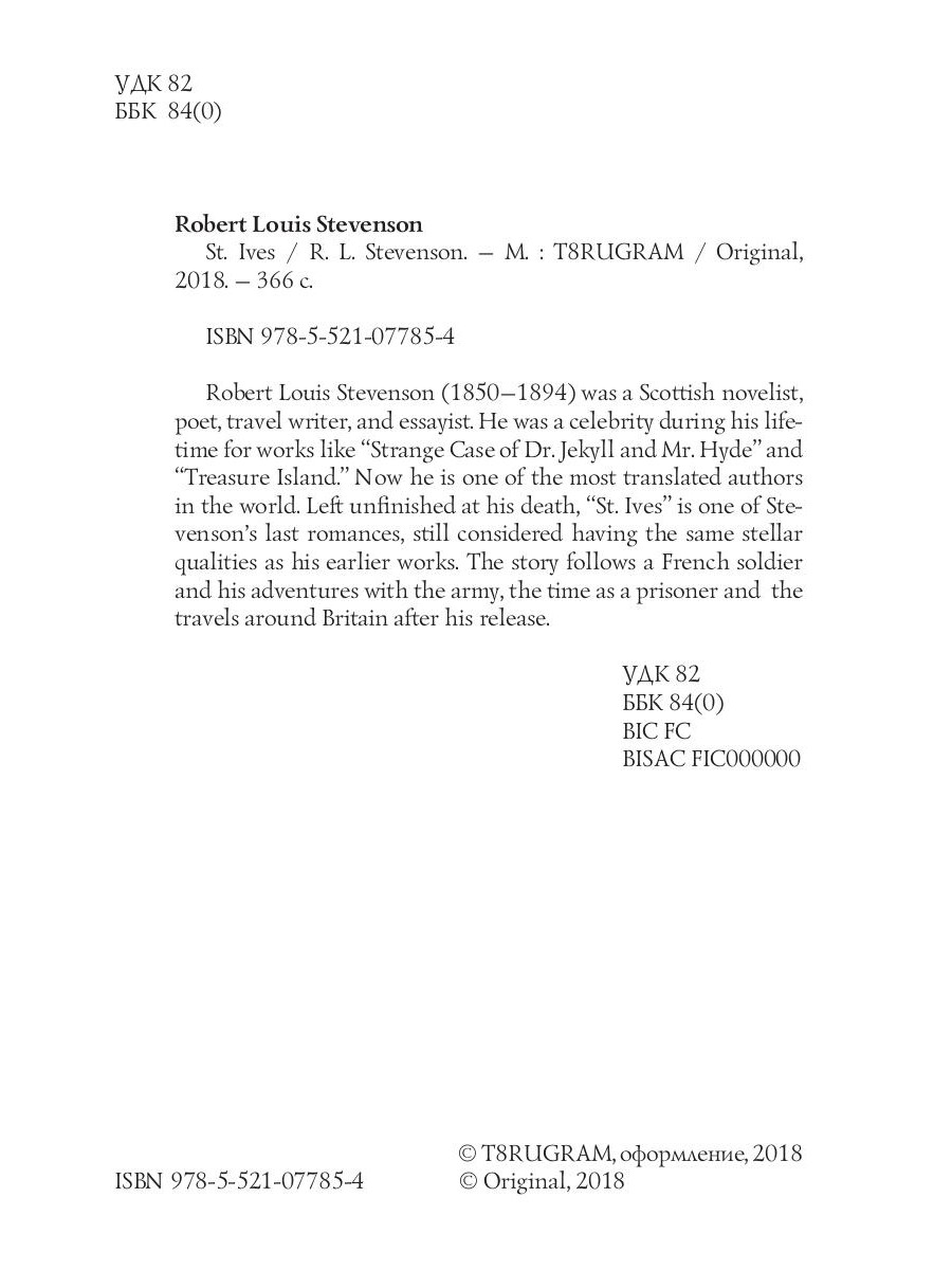 Robert Louis Stevenson (1850-1894) was a Scottish novelist, poet, travel writer, and essayist. He was a celebrity during his lifetime for works like "Strange Case of Dr. Jekyll and Mr. Hyde" and "Treasure Island." Now he is one of the most translated authors in the world. Left unfinished at his death, "St. Ives" is one of Stevenson's last romances, still considered having the same stellar qualities as his earlier works. The story follows a French soldier and his adventures with the army, the time as a prisoner and the travels around Britain after his release.| Издательство | Т8 RUGRAM |