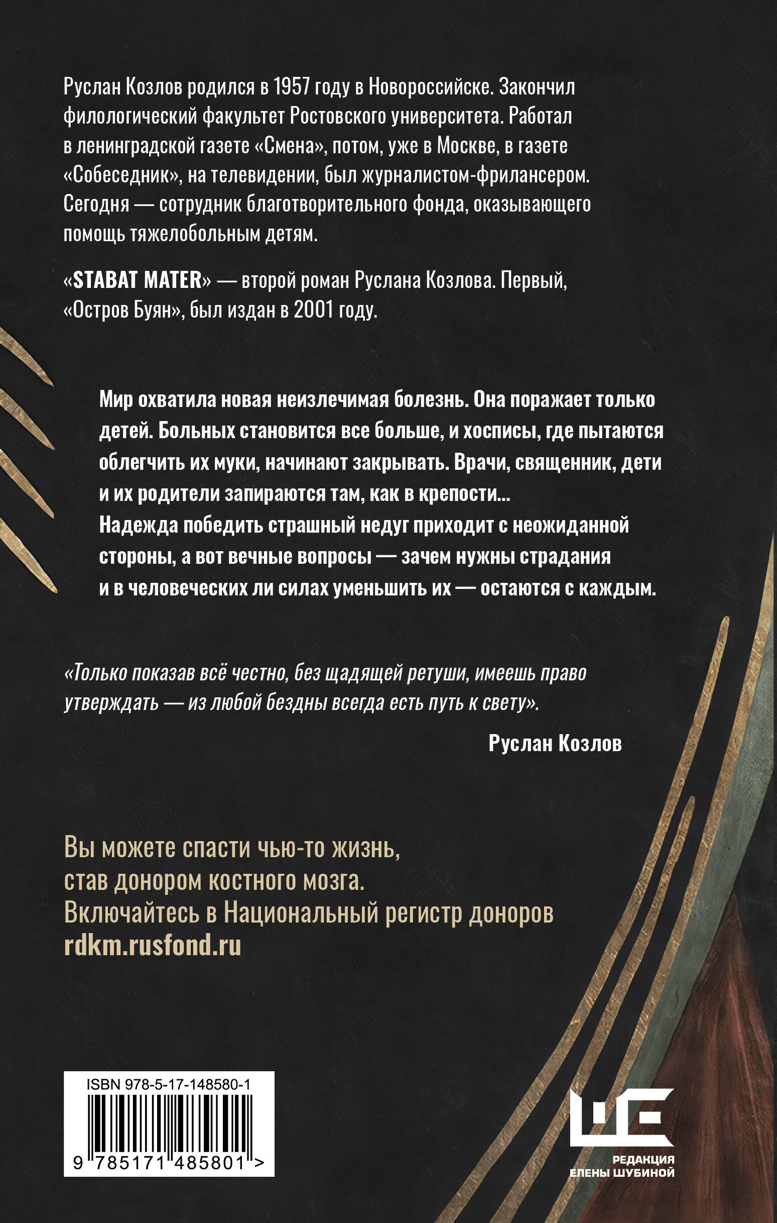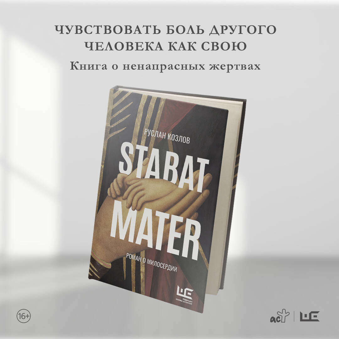 Книга «Stabat Mater» продолжает серию «Большая проза». По словам Дмитрия Быкова, это «совершенно грандиозное произведение», которое навсегда изменит читателя. Роман о милосердии и жизни в высшем её проявлении, о любви и нежности, пробивающихся сквозь тьму и безысходность. По глубине и многослойности напоминает одновременно булгаковские тексты и культовый «Дом, в котором…». «Stabat Mater» - «Матерь скорбящая», молитвенная песнь, написанная на латыни в Средние века. В ее двадцати куплетах говорится о душевных муках Богородицы, видящей страдания распятого Иисуса. Роман Руслана Козлова - такой же сложно устроенный, напряженный, но все же прославляющий жизнь, ведущий к свету героев и читателей. Этот умный и дерзкий, учитывая зашитые между строк смыслы, текст рассказывает о милосердии и жизни в высшем ее проявлении - он о подлинной человечности и способности чувствовать боль другого человека как свою.| Издательство | АСТ |