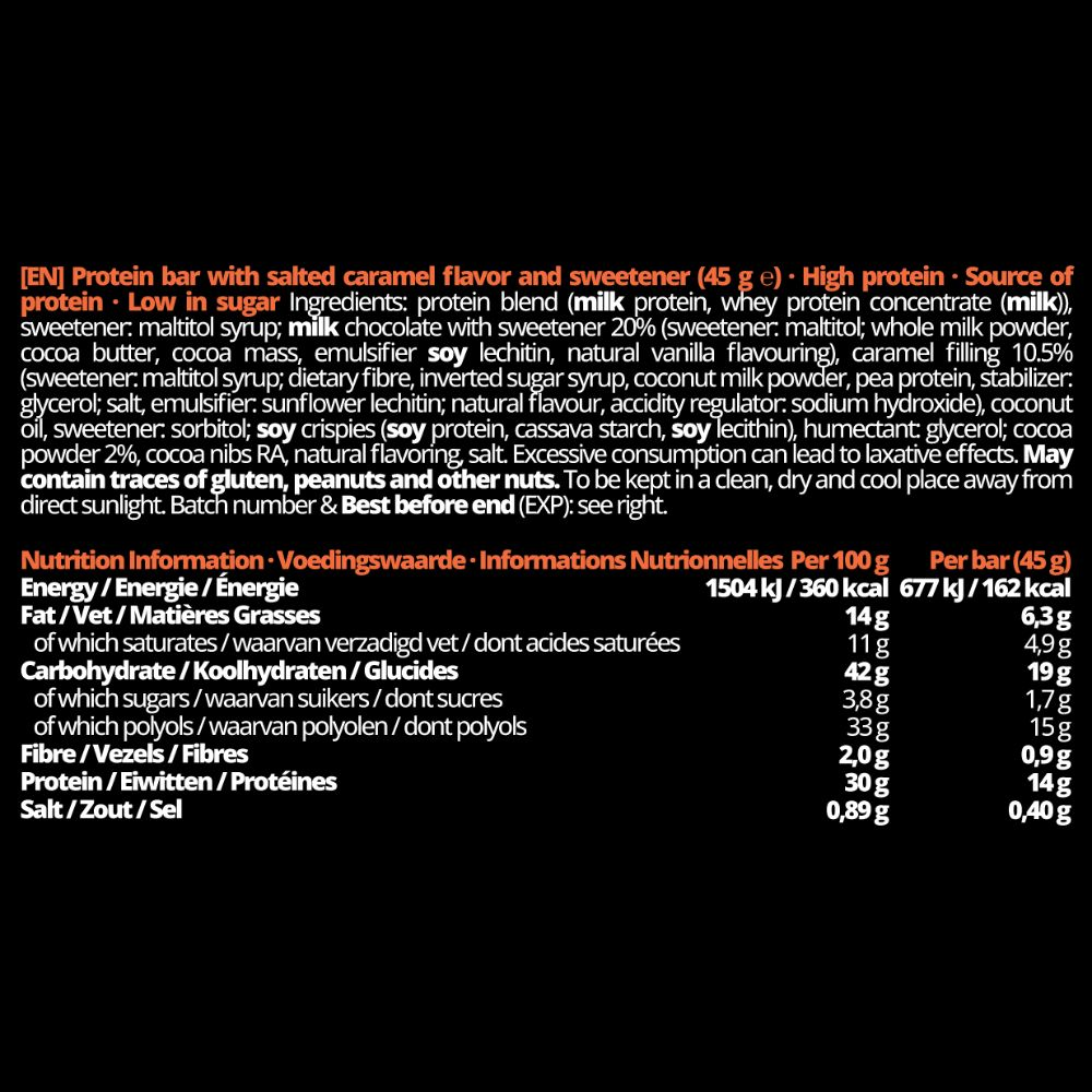 Ингредиенты: Белковая смесь (белок MILK, концентрат сывороточного белка (MILK)), подсластитель: сироп мальтитола; шоколад MILK с подсластителем 20% (подсластитель: мальтитол; порошок цельного MILK, какао-масло, какао тертое, эмульгатор: SOY лецитин, натуральный ванильный ароматизатор), карамельная начинка 10% (подсластитель: мальтитный сироп; пищевые волокна, инвертный сахарный сироп, порошок COCONUT MILK, гороховый белок, стабилизатор: глицерин; соль, эмульгатор: подсолнечный лецитин; натуральный ароматизатор, регулятор кислотности: гидроксид натрия), кокосовое масло, подсластитель: сорбит; чипсы SOY (белок SOY, крахмал маниоки, лецитин SOY), увлажнитель: глицерин; соль, натуральный ароматизатор, натуральный краситель.