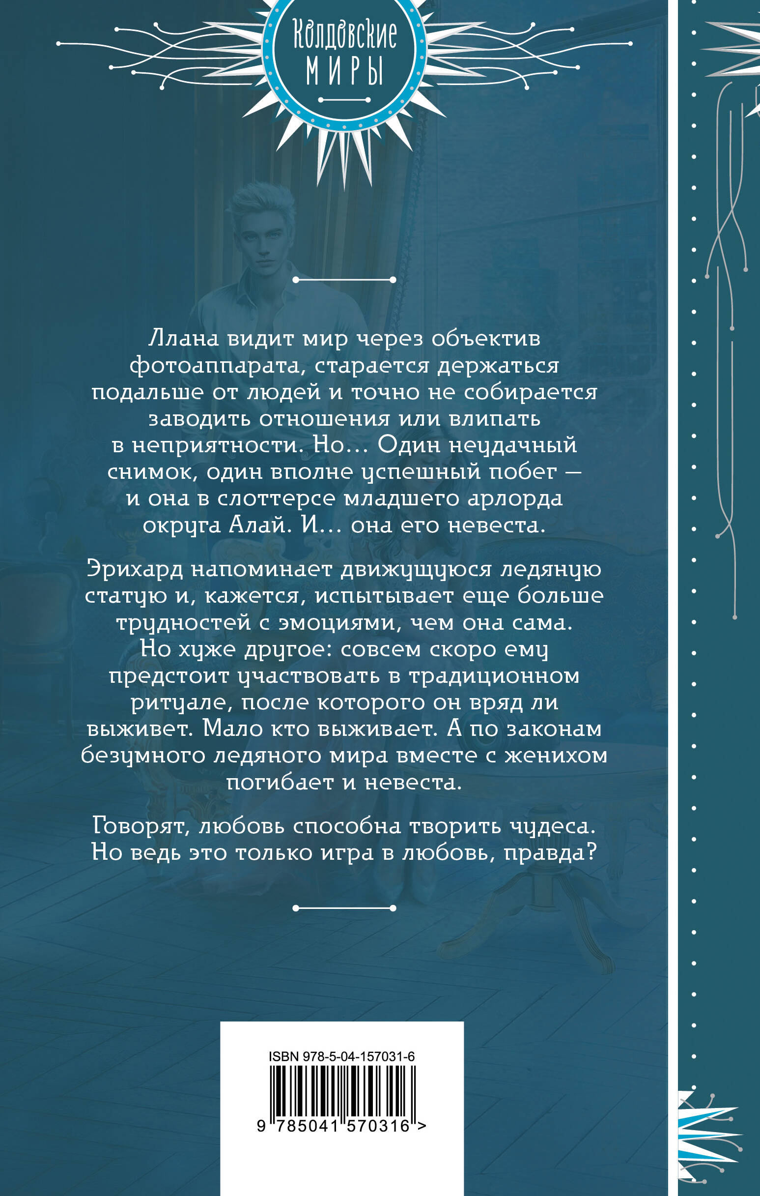 Ллана видит мир через объектив фотоаппарата, старается держаться подальше от людей и точно не собирается заводить отношения или влипать в неприятности. Но… Один неудачный снимок, один вполне успешный побег - и она в слоттерсе младшего арлорда округа Алай. И… она его невеста. Эрихард напоминает движущуюся ледяную статую и, кажется, испытывает еще больше трудностей с эмоциями, чем она сама. Но хуже другое: совсем скоро ему предстоит участвовать в традиционном ритуале, после которого он вряд ли выживет. Мало кто выживает. А по законам безумного ледяного мира, вместе с женихом погибает и невеста. Говорят, любовь способна творить чудеса. Но ведь это только игра в любовь, правда? 1) Книга понравится любителям зимних историй и атмосферы снежной сказки. 2) Идеально подходит для тихого вечера, когда хочется почитать, помечтать и немного попереживать. 3) История переносит читателя в мир, где магия сосуществует с техническим прогрессом. 4) Динамичное повествование, много романтики и приключений. 5) Героям предстоит пройти непростой путь друг к другу и к самим себе.| Издательство | ООО "Издательство "Эксмо" |