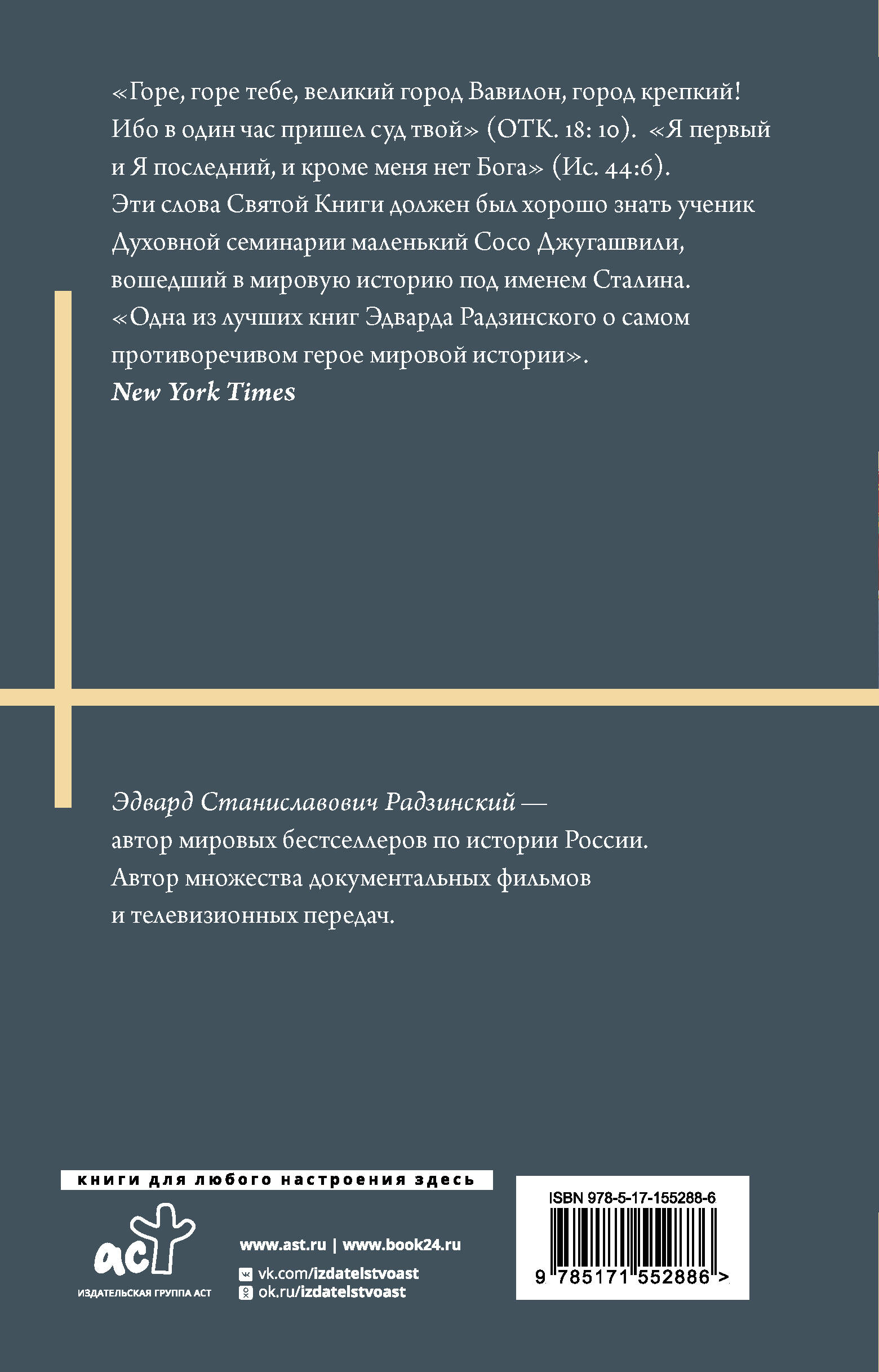 "Горе, горе тебе, великий город Вавилон, город крепкий! Ибо в один час пришел суд твой" (ОТК. 18: 10). "Я первый и Я последний, и кроме меня нет Бога" (Ис. 44:6). Эти слова Святой Книги должен был хорошо знать ученик Духовной семинарии маленький Сосо Джугашвили, вошедший в мировую историю под именем Сталина. Одна из лучших книг Эдварда Радзинского о самом противоречивом герое мировой истории в новой серии "Бестселлеры Эдварда Радзинского".| Издательство | ИЗДАТЕЛЬСТВО "АСТ" |