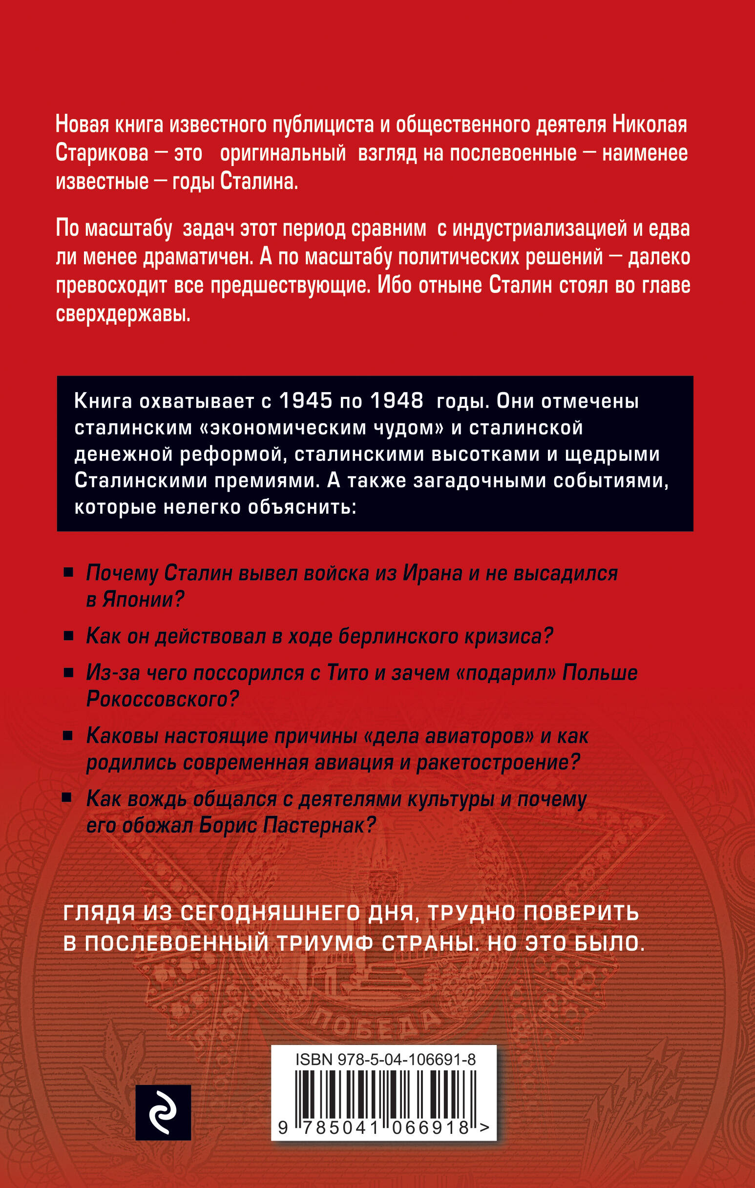 Сталин, без сомнения, стоит в ряду величайших исторических фигур. Однако несмотря на непреходящий интерес исследователей, в биографии его остались периоды, малоизвестные читателю. Прежде всего - послевоенный. По масштабу задач он вполне сравним с индустриализацией и едва ли менее драматичен. А по масштабу политических решений - далеко превосходит все предшествующие, так как отныне СССР являлся сверхдержавой, и за действиями Сталина следил весь мир. Его поражали сталинское "экономическое чудо" и сталинская денежная реформа, сталинские высотки и Сталинские премии.