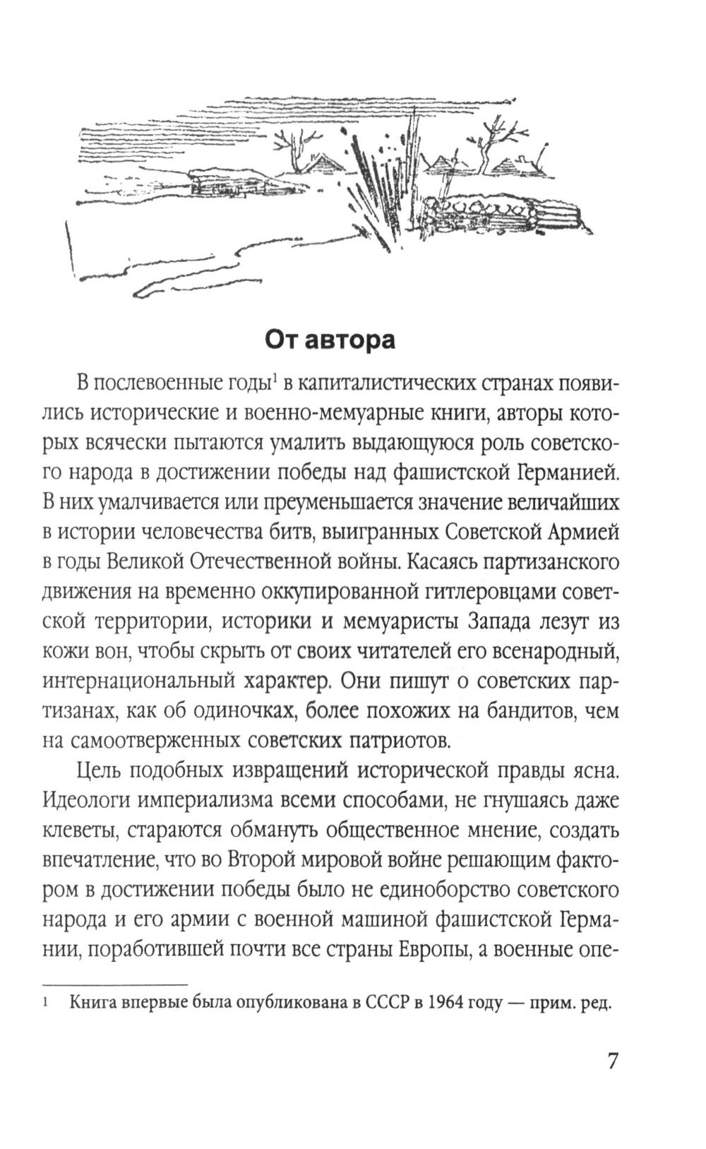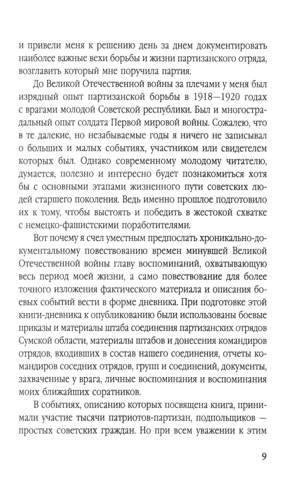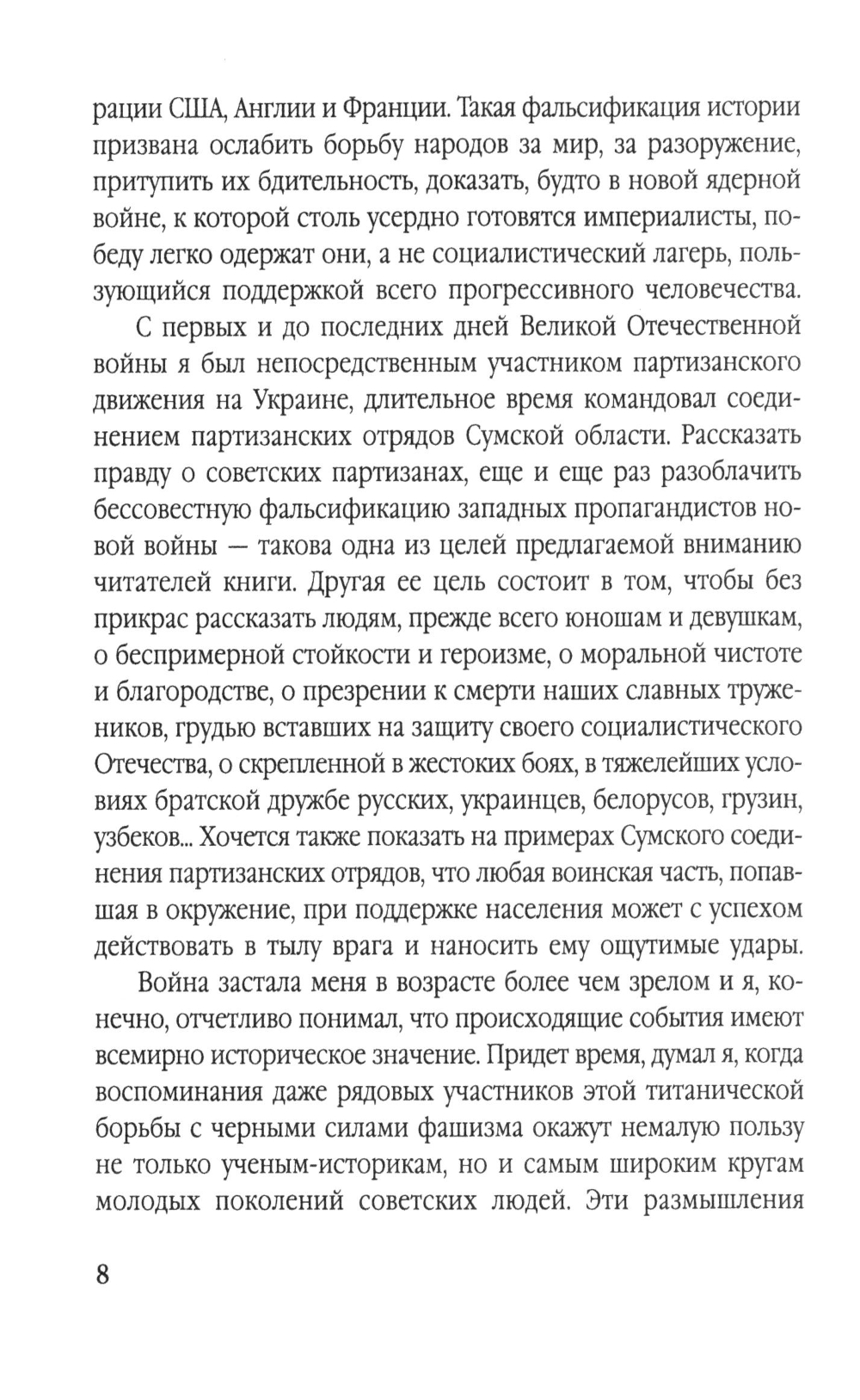 Сидор Артемьевич Ковпак (1887-1967) - советский военный и государственный деятель. Генерал-майор (1943). Дважды Герой Советского Союза (1942, 1944). В годы Великой Отечественной войны - один из организаторов партизанского движения на Украине. Сторонник рейдовой тактики партизанской борьбы. Командовал партизанским отрядом в Спадщанском лесу, объединённым Путивльским партизанским отрядом и соединением партизанских отрядов Сумской области. Совершил два похода по северным районам Сумской области, рейды на Правобережную Украину и в Карпаты. В своей книге подробно и откровенно рассказывает об организации партизанской борьбы на Украине.