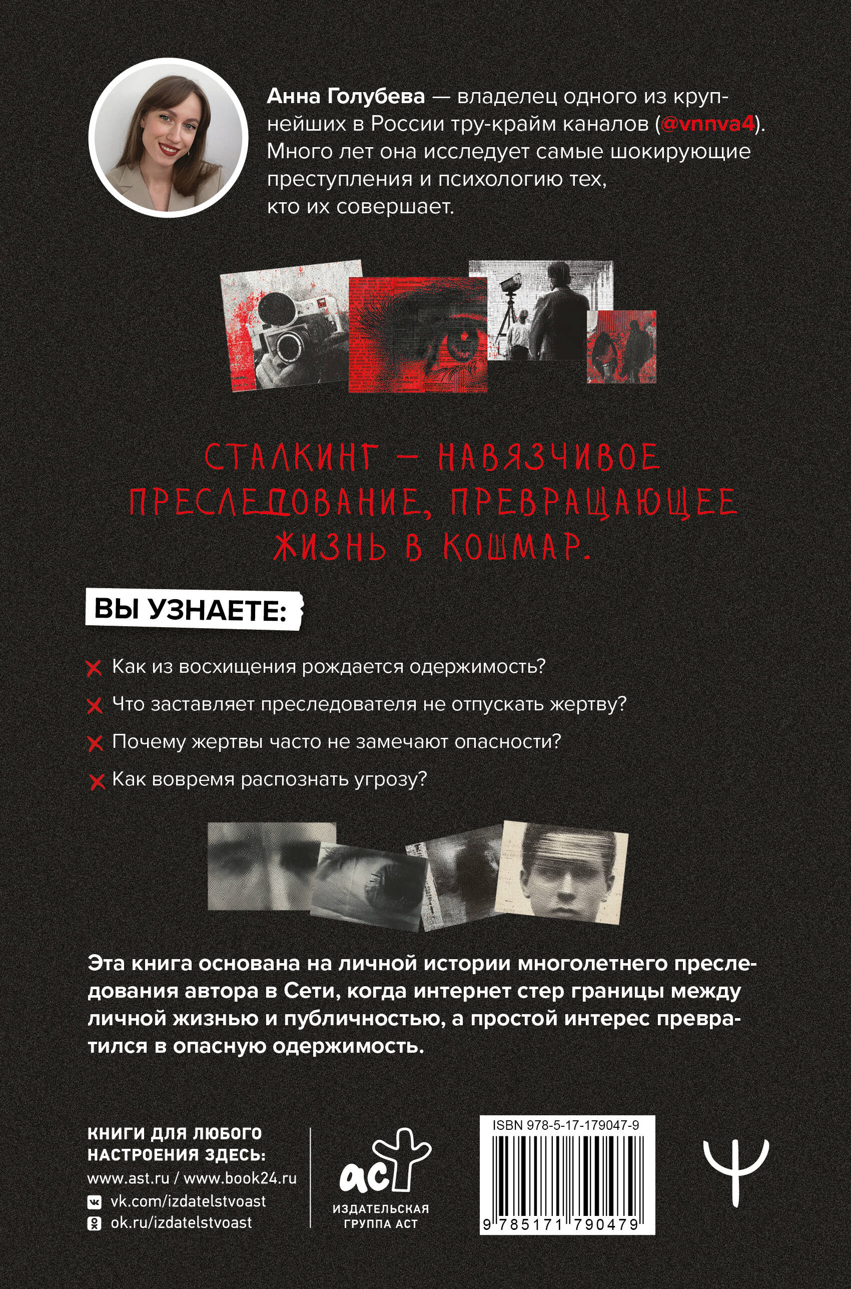 Он всегда оказывается с вами в одном кафе. Его сообщения в соцсетях становятся все страннее. Ночные звонки с незнакомого номера и навязчивые комментарии к вашим фото… Это не романтика, а сталкинг - опасное преследование, которое может разрушить жизнь. Автор этой книги - один из самых популярных тру-крайм-блогеров России с миллионами просмотров. Много лет она исследовала феномен сталкинга и сейчас впервые рассказывает о том, что значит жить в роли жертвы преследователя. Перед вами полноценное исследование навязчивой одержимости. Вы узнаете, что заставляет преследователя действовать, почему жертва не сразу осознает опасность, как распознать сигналы преследования и защитить себя. Захватывающее чтение для каждого, кто хочет понимать природу насилия, которое начинается не с удара, а с одного-единственного восхищенного взгляда.| Издательство | Издательство "АСТ" |