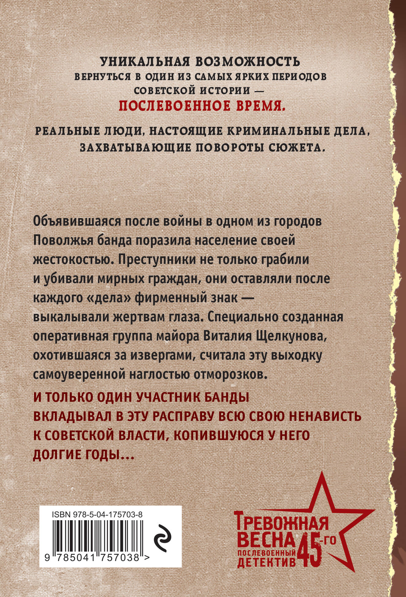 Объявившаяся после войны в одном из городов Поволжья банда поразила население своей жестокостью. Преступники не только грабили и убивали мирных граждан, они оставляли после каждого «дела» «фирменный знак» - выкалывали жертвам глаза. Специально созданная оперативная группа майора Виталия Щелкунова, охотившаяся за извергами, считала эту выходку самоуверенной наглостью отморозков. И только один участник банды вкладывал в эту расправу всю свою ненависть к Советской власти, копившуюся у него долгие годы… Уникальная возможность вернуться в один из самых ярких периодов советской истории - в послевоенное время. Реальные люди, настоящие криминальные дела, захватывающие повороты сюжета. Персонажи, похожие на культовые образы фильма «Место встречи изменить нельзя». Дух времени, трепетно хранящийся во многих семьях. Необычно и реалистично показанная «кухня» повседневной работы советской милиции.| Издательство | ООО "Издательство "Эксмо" |