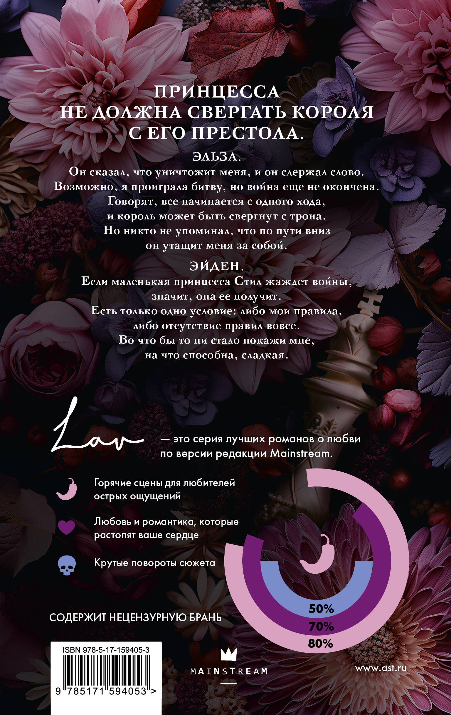 ТЫ КОРОЛЕВА, А НЕ ПЕШКА. ПРИНЦЕССА НЕ ДОЛЖНА СВЕРГАТЬ КОРОЛЯ С ЕГО ПРЕСТОЛА. ЭЛЬЗА. Он сказал, что уничтожит меня, и он сдержал слово. Возможно, я проиграла битву, но война еще не окончена. Говорят, все начинается с одного хода, и король может быть свергнут с трона. Но никто не упоминал, что по пути вниз он утащит меня за собой. ЭЙДЕН. Если маленькая принцесса Стил жаждет войны, значит, она ее получит. Есть только одно условие: либо мои правила, либо отсутствие правил вовсе. Во что бы то ни стало покажи мне, на что способна, сладкая.| Издательство | Издательство "АСТ" |