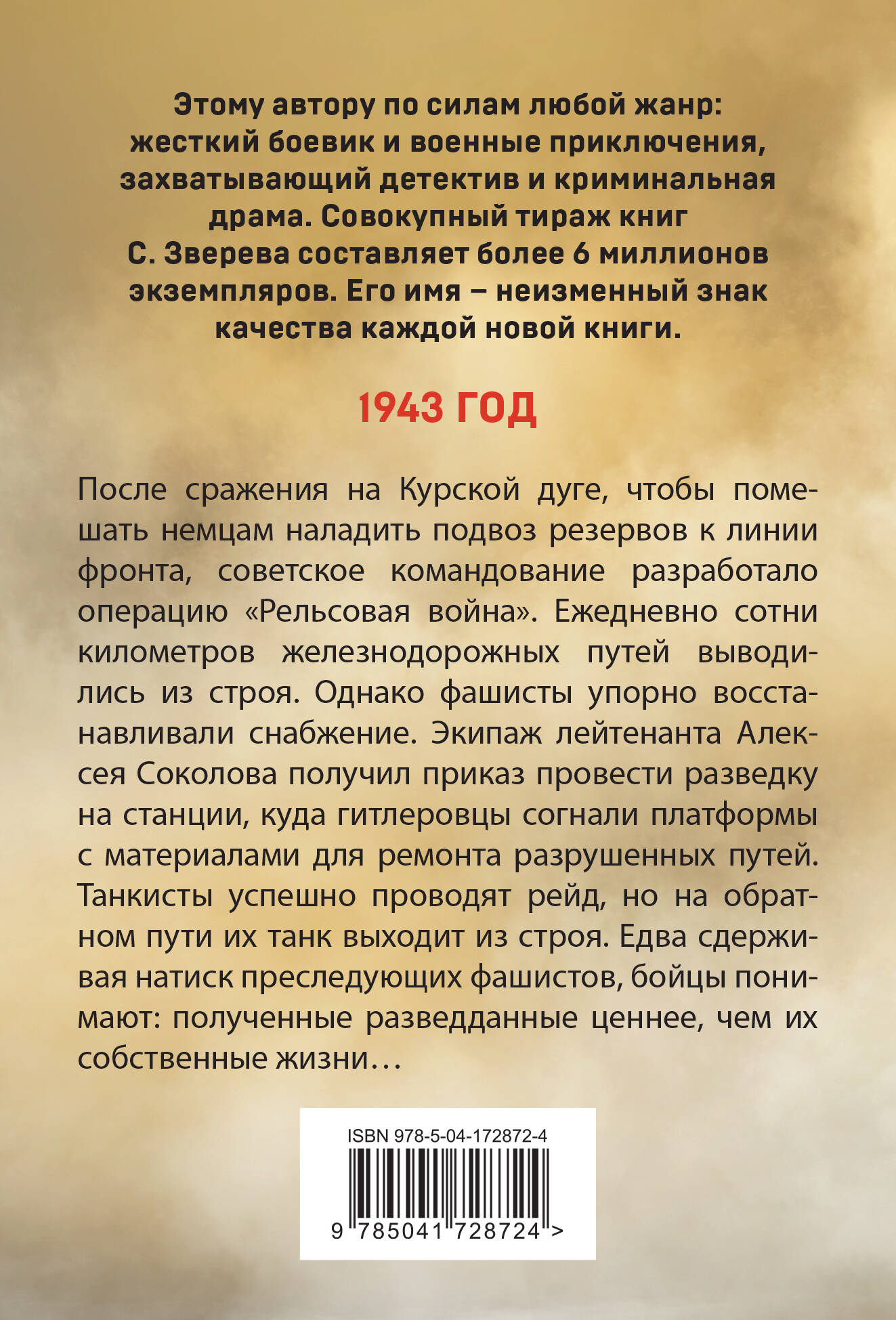 Этому автору по силам любой жанр: жесткий боевик и военные приключения, захватывающий детектив и криминальная драма. Совокупный тираж книг С. Зверева составляет более 6 миллионов экземпляров. Его имя - неизменный знак качества каждой новой книги. После сражения на Курской дуге, чтобы помешать немцам наладить подвоз резервов к линии фронта, советское командование разработало операцию «Рельсовая война». Ежедневно сотни километров железнодорожных путей выводилось из строя. Однако фашисты упорно восстанавливали снабжение. Экипаж лейтенанта Алексея Соколова получил приказ провести разведку на станции, куда гитлеровцы согнали платформы с материалами для ремонта разрушенных путей. Танкисты успешно проводят рейд, но на обратном пути их танк выходит из строя. Едва сдерживая натиск преследующих фашистов, бойцы понимают: полученные разведданные ценнее, чем их собственные жизни…| Издательство | ООО "Издательство "Эксмо" |