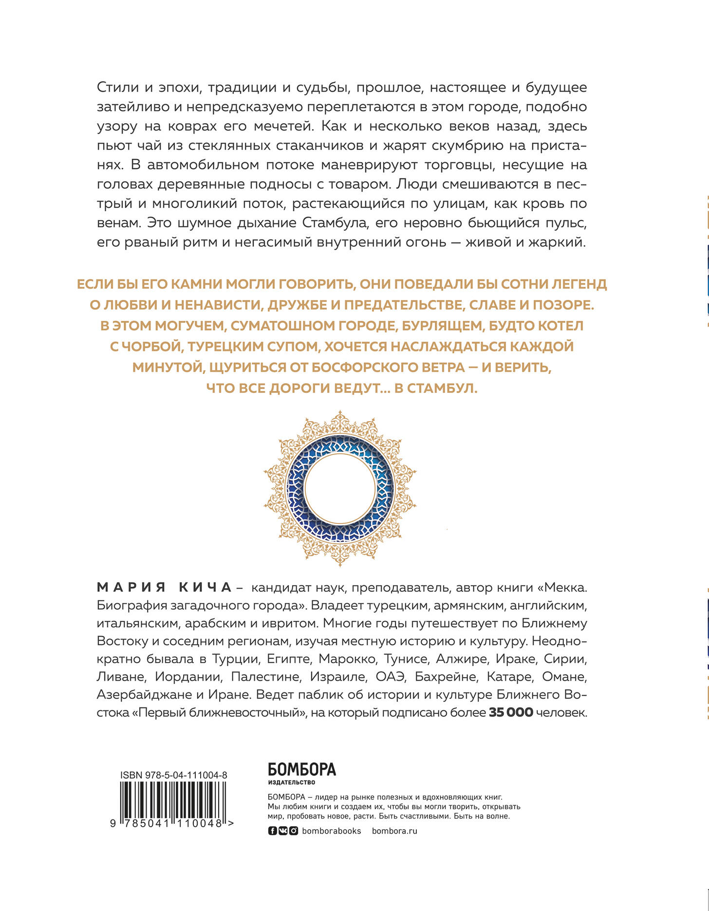 «Стили и эпохи, традиции и судьбы, прошлое, настоящее и будущее затейливо переплетаются в этом городе, подобно узору на коврах его мечетей. Как и несколько веков назад, здесь пьют чай из стеклянных стаканчиков и жарят скумбрию на пристанях. Торговцы несут на головах деревянные подносы с товаром. Люди смешиваются в пестрый и многоликий поток, растекающийся по улицам, как кровь по венам. Это - шумное дыхание Стамбула, его неровно бьющийся пульс, его рваный ритм и негасимый внутренний огонь - живой и жаркий». Мария Кича - кандидат наук, преподаватель, владеет турецким, армянским, английским, итальянским, арабским и ивритом. Многие годы путешествует по Ближнему Востоку и соседним регионам, изучая местную историю и культуру. Неоднократно бывала в Турции, Египте, Марокко, Тунисе, Алжире, Ираке, Сирии, Ливане, Иордании, Палестине, Израиле, ОАЭ, Бахрейне, Катаре, Омане, Азербайджане и Иране. Ведет паблик о культуре и истории Ближнего Востока, на который подписано более 35 000 человек.| Издательство | ООО "Издательство "Эксмо" |