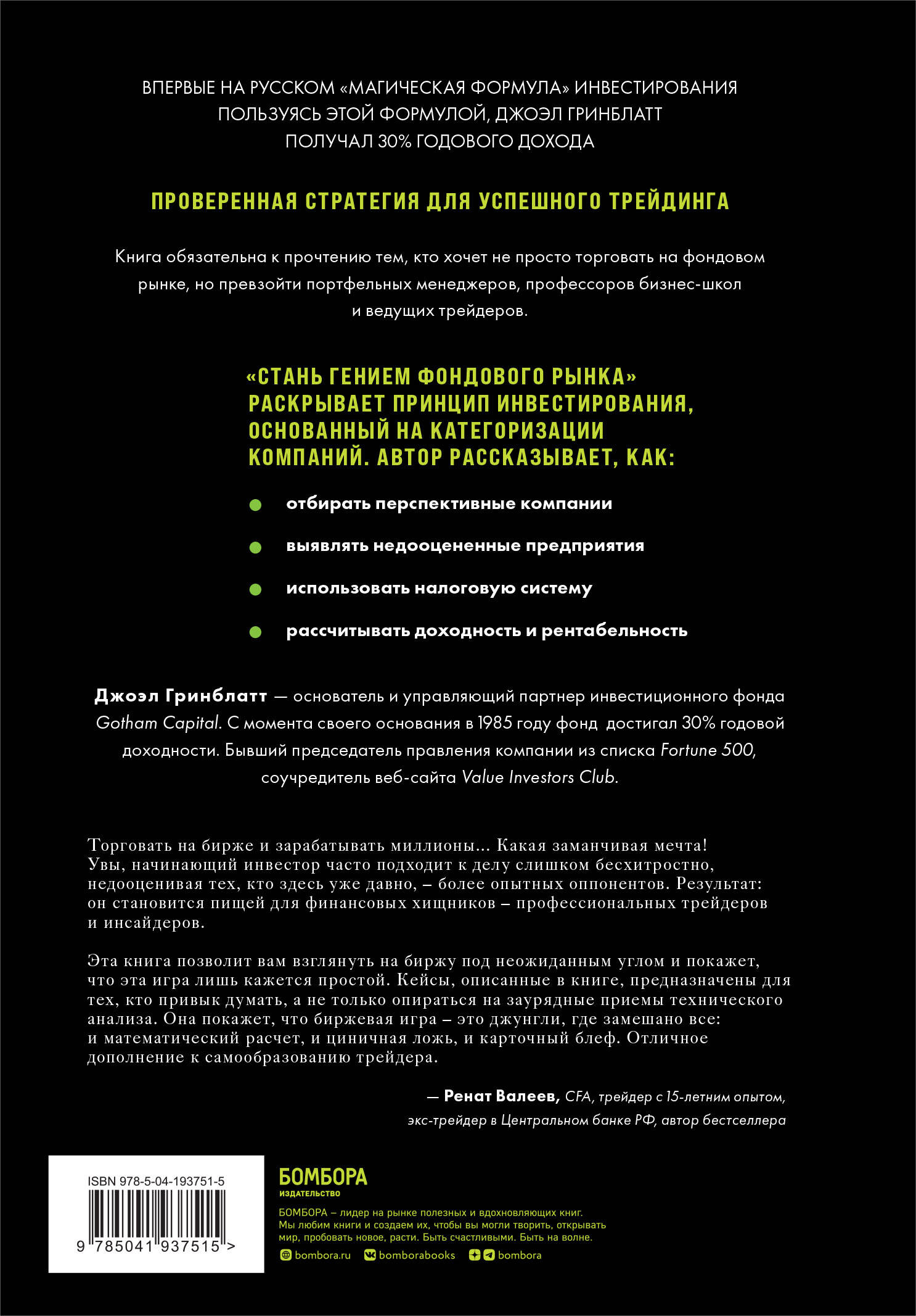 ВПЕРВЫЕ НА РУССКОМ «МАГИЧЕСКАЯ ФОРМУЛА» ИНВЕСТИРОВАНИЯ! ПОЛЬЗУЯСЬ ЭТОЙ ФОРМУЛОЙ, ДЖОЭЛ ГРИНБЛАТТ ПОЛУЧАЛ 30% ГОДОВОГО ДОХОДА. ПРОВЕРЕННАЯ СТРАТЕГИЯ ДЛЯ УСПЕШНОГО ТРЕЙДИНГА. Книга обязательна к прочтению тем, кто хочет не просто торговать на фондовом рынке, но превзойти портфельных менеджеров, профессоров бизнес-школ и ведущих трейдеров. «Стань гением фондового рынка» раскрывает принцип инвестирования, основанный на категоризации компаний. Автор рассказывает, как: - отбирать перспективные с точки зрения инвестирования компании; - выявлять недооцененные предприятия; - использовать налоговую систему в свою пользу; - рассчитывать доходность компаний и их рентабельность. Джоэл Гринблатт - основатель и управляющий партнер инвестиционного фонда Gotham Capital. С момента своего основания в 1985 году фонд достигал 30% годовой доходности. Бывший председатель правления компании из списка Fortune 500, соучредитель веб-сайта Value Investors Club. «Торговля на бирже - непростое дело, особенно когда вы недооцениваете соперников - других трейдеров и инвесторов, работающих по ту сторону монитора. Эта книга позволит взглянуть на биржевое дело под другим углом, порой весьма неожиданным, и превозмочь типичную ошибку инвестора-обывателя - слишком упрощенный подход данному ремеслу». - Ренат Валеев, CFA, трейдер с 15-летним опытом, экс-трейдер в Центральном Банке РФ, автор бестселлера| Издательство | ООО "Издательство "Эксмо" |