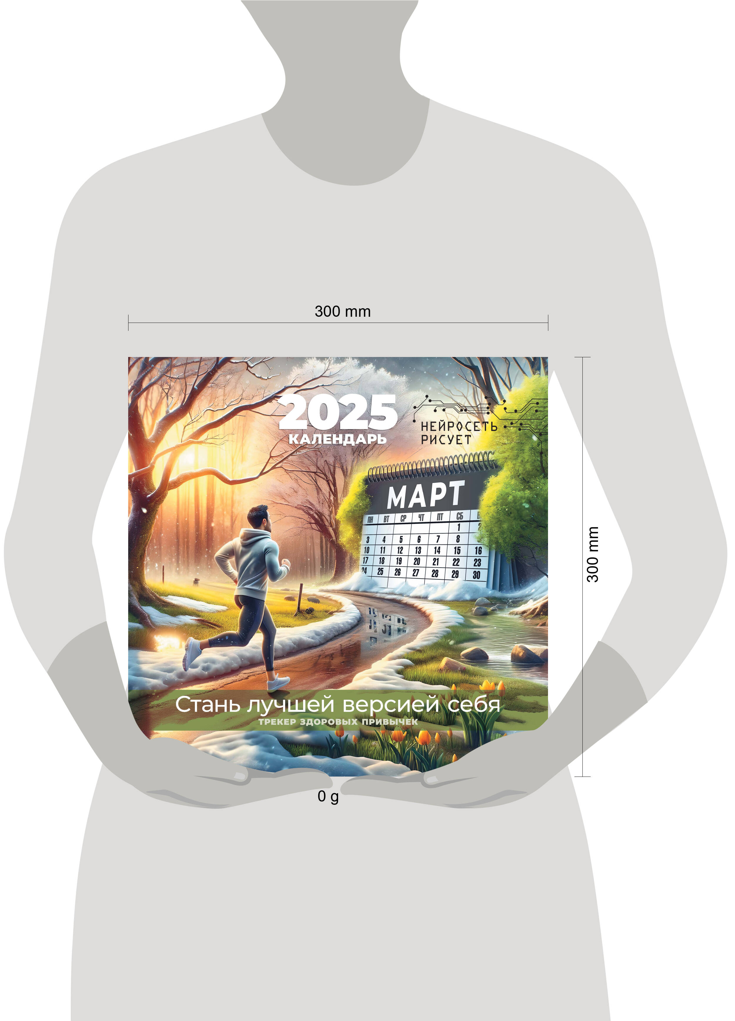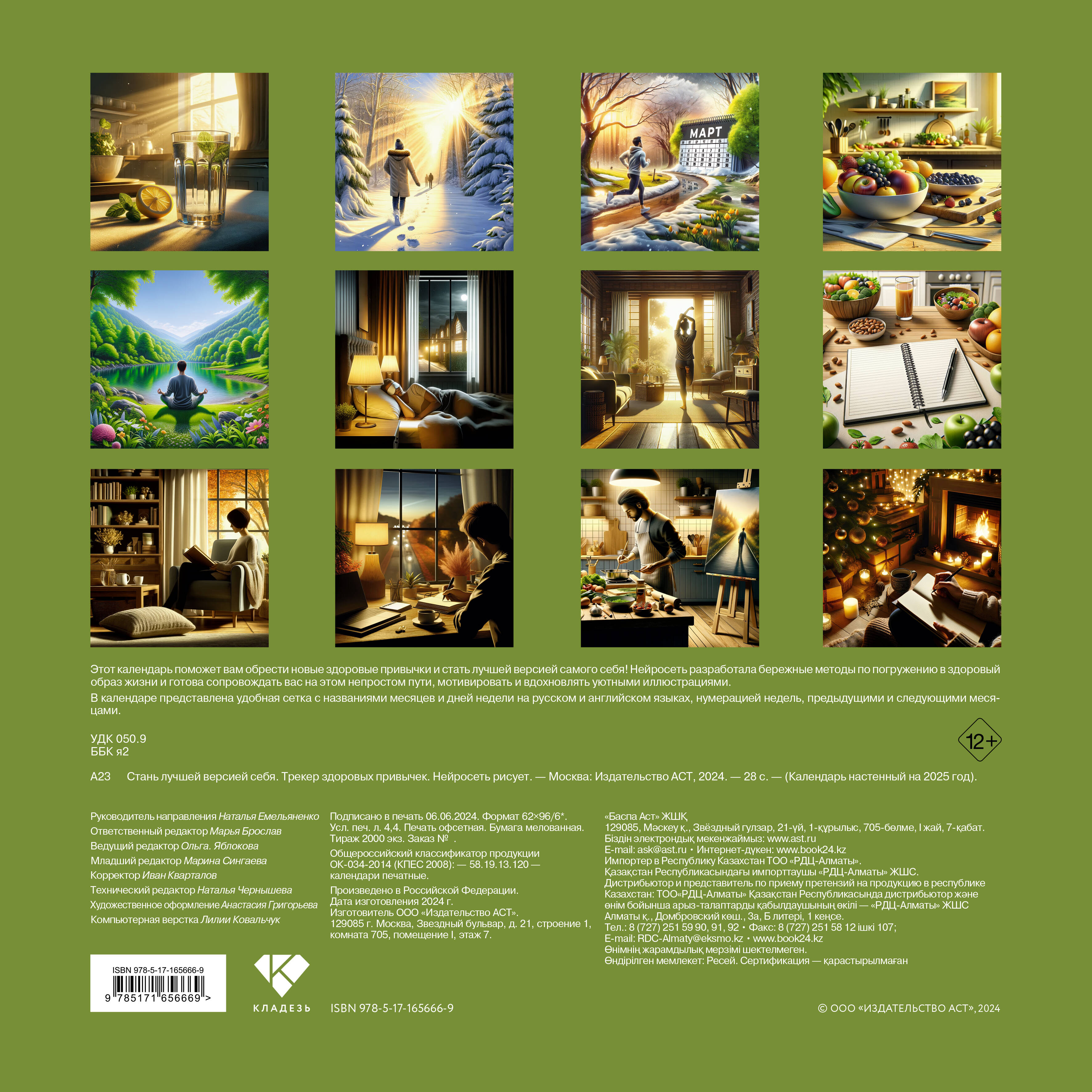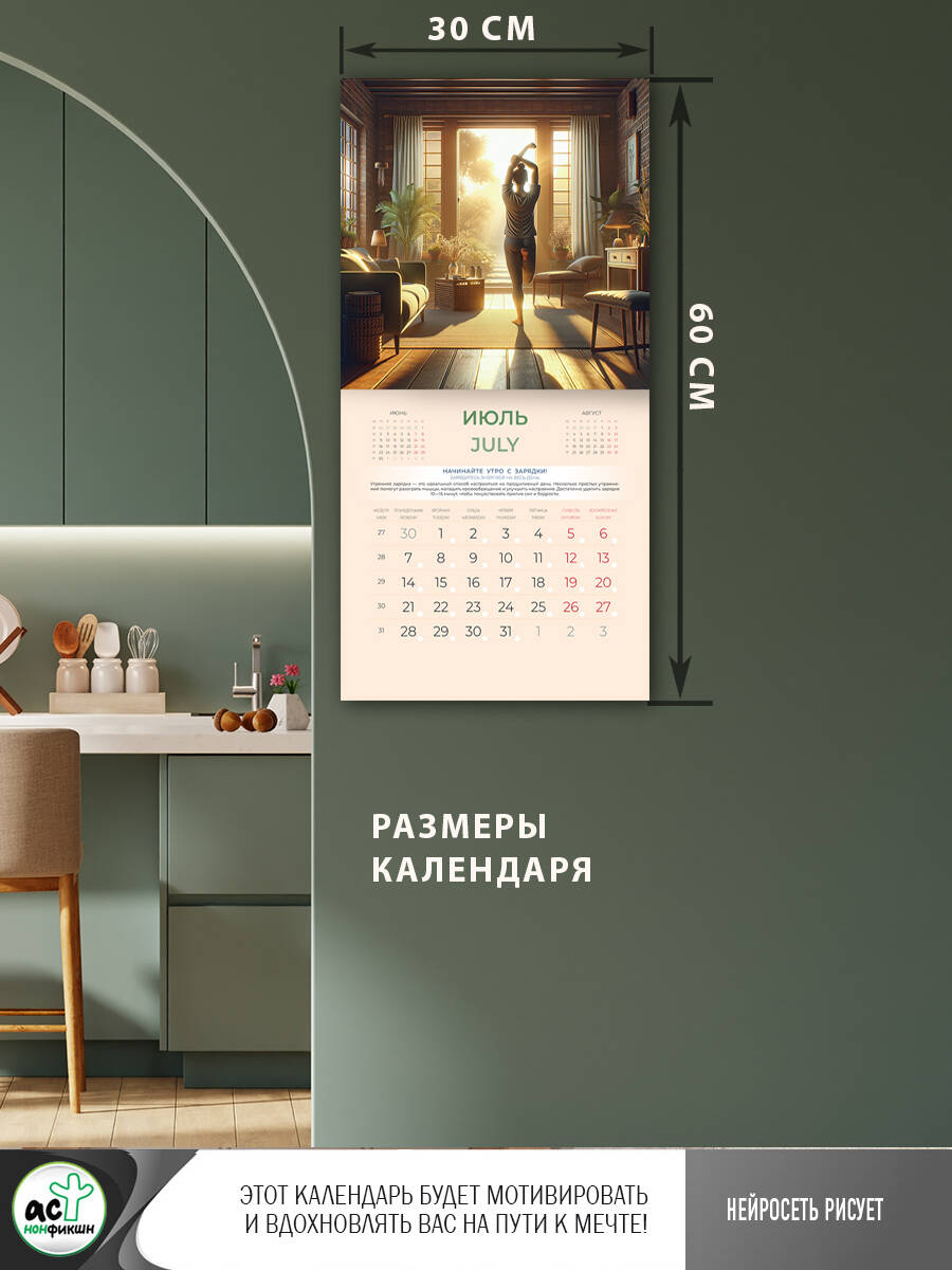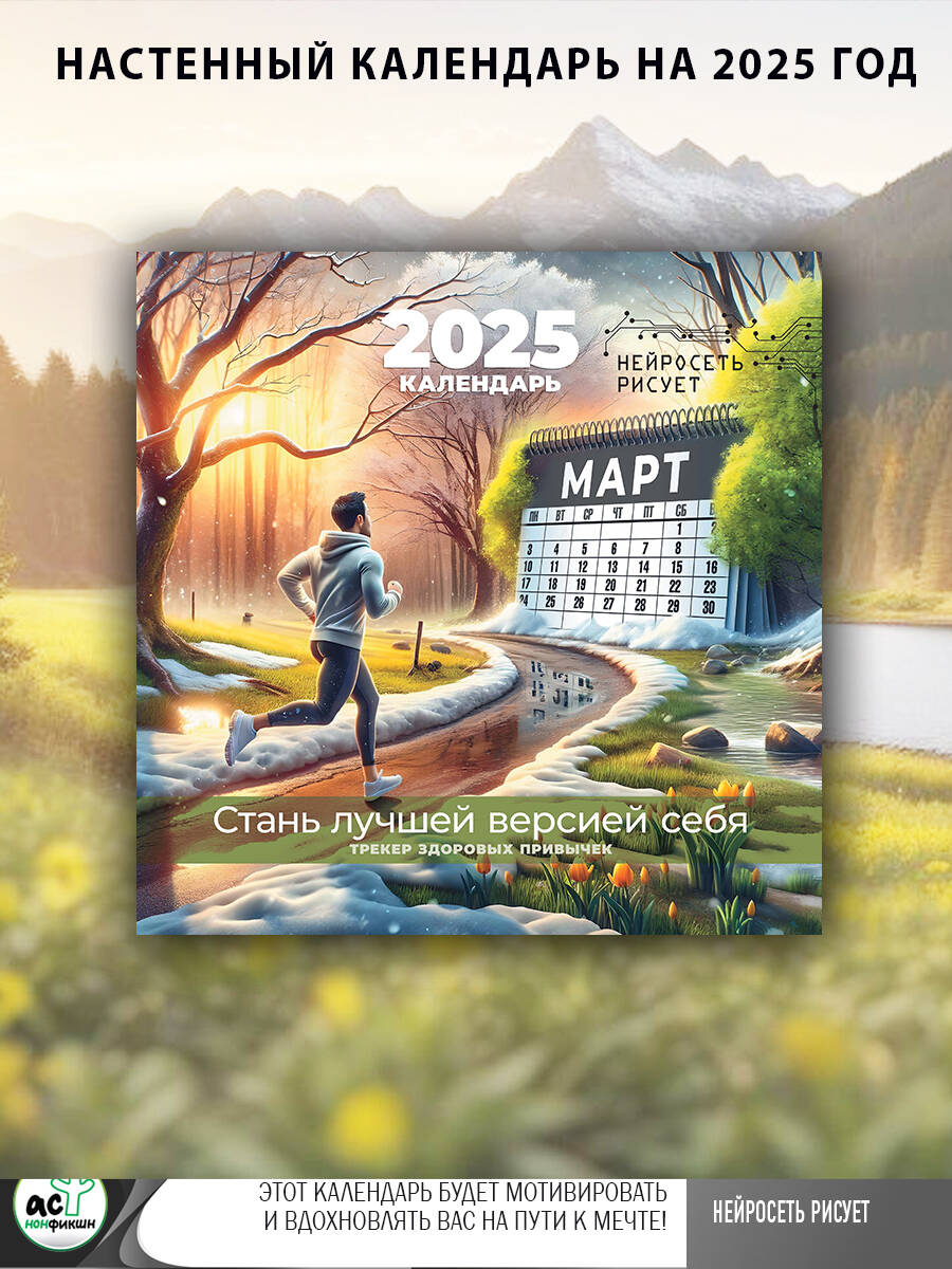 Этот календарь поможет вам обрести новые здоровые привычки и стать лучшей версией самого себя! Нейросеть разработала бережные методы по погружению в здоровый образ жизни и готова сопровождать вас на этом непростом пути, мотивировать и вдохновлять уютными иллюстрациями. В календаре представлена удобная сетка с названиями месяцев и дней недели на русском и английском языках, нумерацией недель, предыдущими и следующими месяцами.| Издательство | Издательство "АСТ" |