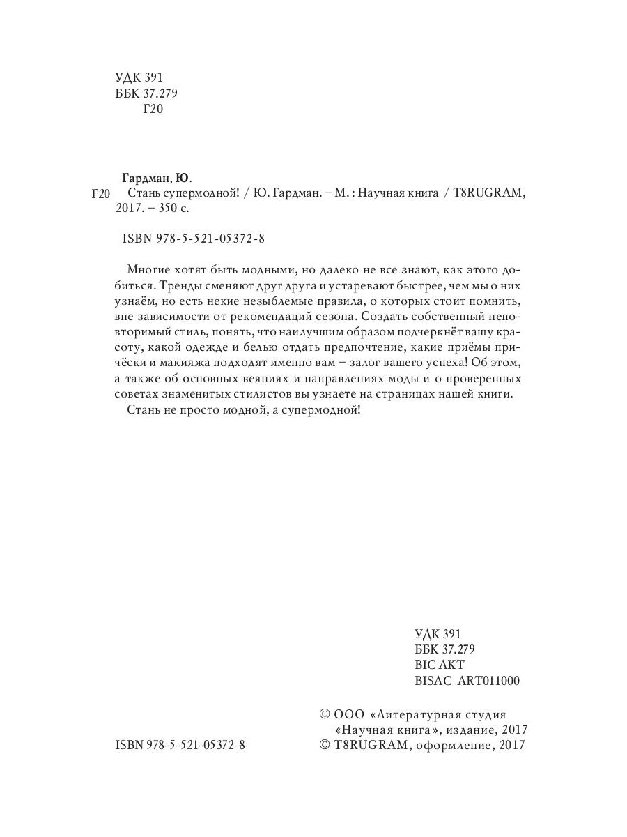 Многие хотят быть модными, но далеко не все знают, как этого добиться. Тренды сменяют друг друга и устаревают быстрее, чем мы о них узнаём, но есть некие незыблемые правила, о которых стоит помнить, вне зависимости от рекомендаций сезона. Создать собственный неповторимый стиль, понять, что наилучшим образом подчеркнёт вашу красоту, какой одежде и белью отдать предпочтение, какие приёмы причёски и макияжа подходят именно вам - залог вашего успеха! Об этом, а также об основных веяниях и направлениях моды и о проверенных советах знаменитых стилистов вы узнаете на страницах нашей книги. Стань не просто модной, а супермодной!| Издательство | Т8 RUGRAM |