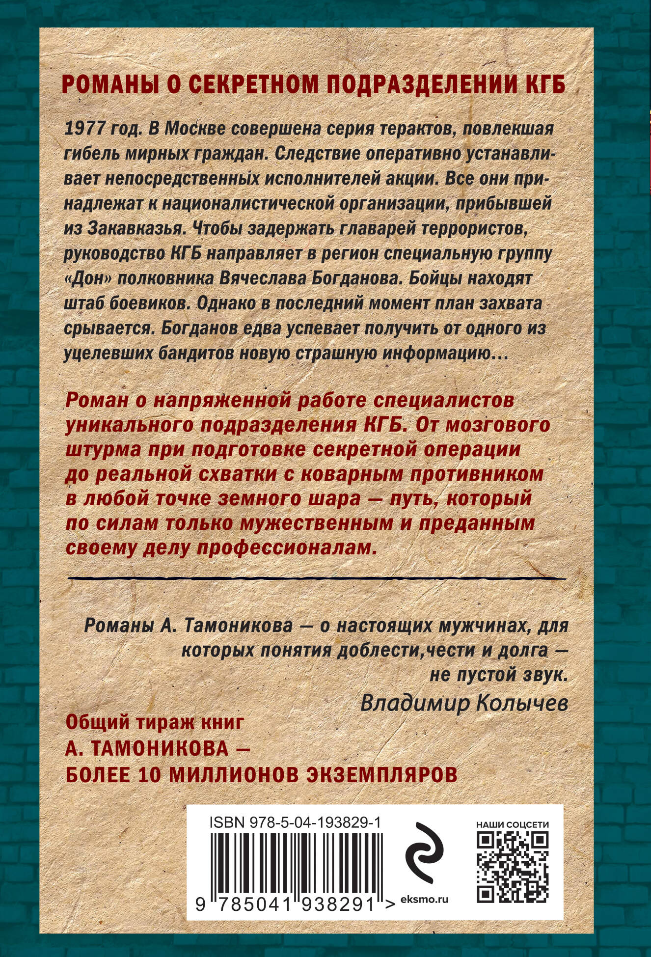 Роман о напряженной работе специалистов уникального подразделения КГБ. От мозгового штурма при подготовке секретной операции до реальной схватки с коварным противником в любой точке земного шара - путь, который по силам только мужественным и преданным своему делу профессионалам. 1977 год. В Москве совершена серия терактов, повлекшая гибель мирных граждан. Следствие оперативно устанавливает непосредственных исполнителей акции. Все они принадлежат к националистической организации, прибывшей из Закавказья. Чтобы задержать главарей террористов, руководство КГБ направляет в регион специальную группу «Дон» полковника Вячеслава Богданова. Бойцы находят штаб боевиков. Однако в последний момент план захвата срывается. Богданов едва успевает получить от одного из уцелевших бандитов новую страшную информацию… «Романы А. Тамоникова - о настоящих мужчинах, для которых понятия доблести, чести и долга - не пустой звук». - В. Колычев Общий тираж книг А. Тамоникова - более 10 миллионов экземпляров.| Издательство | ООО "Издательство "Эксмо" |