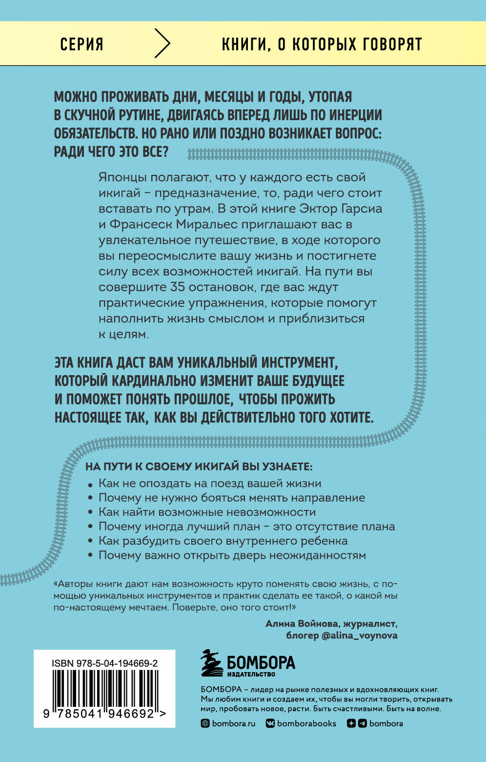 Эктор Гарсиа (Кирай) - журналист и переводчик, проживший в Японии 12 лет и полюбивший эту страну всей душой. Франсеск Миральес - популярный испанский писатель и путешественник, прожил в Японии более 15 лет. Можно проживать дни, месяцы и годы, утопая в скучной рутине, двигаясь вперед лишь по инерции обязательств. Но рано или поздно возникает вопрос: ради чего это все? Японцы полагают, что у каждого есть свой икигай - предназначение, то, ради чего стоит вставать по утрам. В этой книге Эктор Гарсиа и Франсеск Миральес приглашают вас в увлекательное путешествие, в ходе которого вы переосмыслите вашу жизнь и постигнете силу всех возможностей икигай. На пути вы совершите 35 остановок, где вас ждут практические упражнения, которые помогут наполнить жизнь смыслом и приблизиться к целям. Эта книга даст вам уникальный инструмент, который кардинально изменит ваше будущее и поможет понять прошлое, чтобы прожить настоящее так, как вы действительно того хотите. На пути к своему икигай вы узнаете: • Как не опоздать на поезд вашей жизни? • Почему не нужно бояться менять направление? • Как найти возможные невозможности? • Почему иногда лучший план - это отсутствие плана? • Как разбудить своего внутреннего ребенка? • Почему меньше значит больше? • Как добавить поэзии повседневности в вашу жизнь? • Почему важно открыть дверь неожиданностям? «Авторы книги дают нам возможность круто поменять свою жизнь, с помощью уникальных инструментов и практик сделать ее такой, о какой по-настоящему мечтаем. Поверьте, оно того стоит!» - Алина Войнова, журналист, блогер @alina_voynova