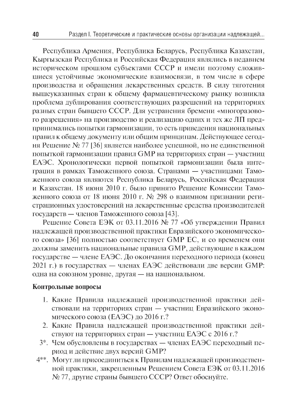 Учебно-методическое пособие, созданное на основе учебной программы и федерального государственного образовательного стандарта в области производства лекарственных средств и контроля качества лекарственных средств, может служить в качестве начального руководства по организации фармацевтического производства в соответствии с Правилами GMP (Good Manufacturing Practicе), Правилами надлежащей производственной практики. В нем даны теоретические и практические основы организации надлежащей производственной практики на предприятии, конкретные примеры организации фармацевтического производства с учетом Правил GMP, структурные схемы к каждой теме, способствующие запоминанию, а также образцы внутренних документов, перечней, бланков и форм, используемых при соблюдении на практике Правил GMP Евразийского экономического союза. Издание предназначено студентам и преподавателям фармацевтических факультетов медицинских вузов, а также руководителям и уполномоченным лицам фармацевтических предприятий.| Издательство | ГЭОТАР-Медиа |
