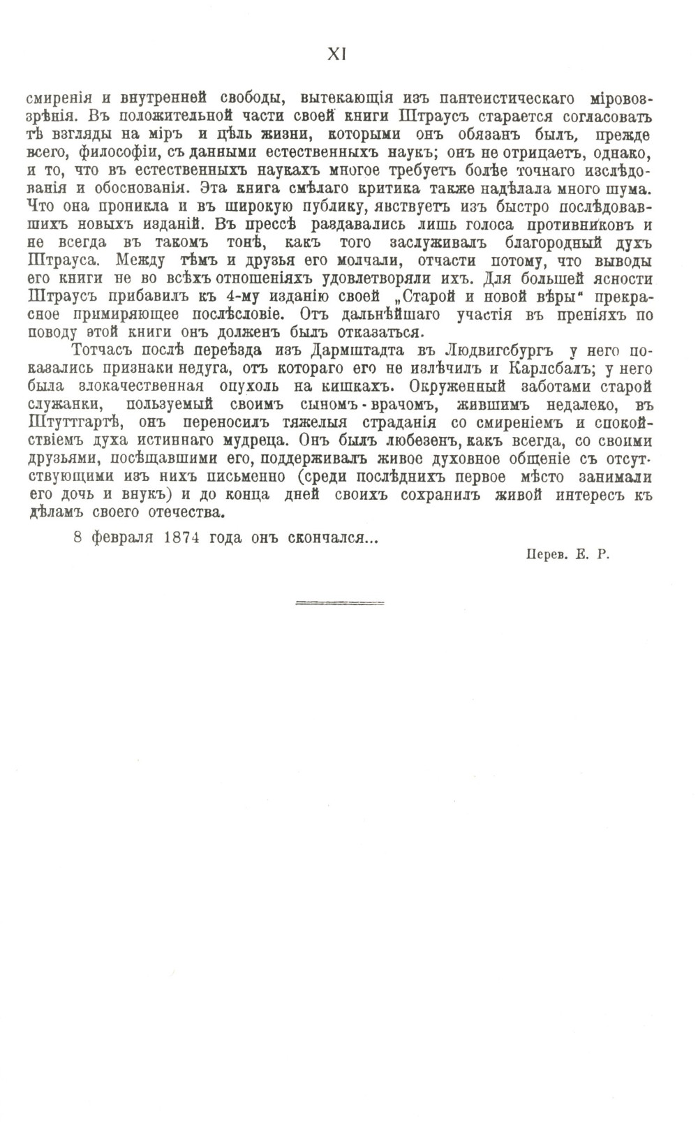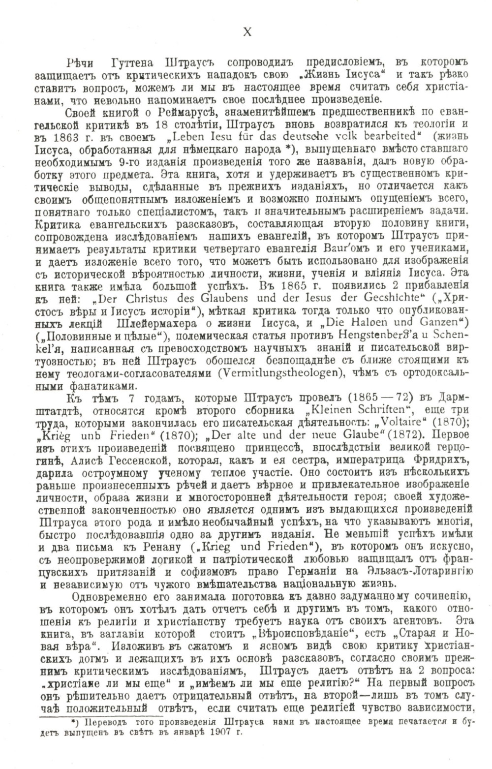 Вниманию читателей предлагается книга известного немецкого философа, историка, теолога и публициста Давида Штрауса (1808-1874), в которой он излагает критику христианских догм и ставит два основных вопроса: "Христиане ли мы еще?" и "Имеем ли мы еще религию?" На первый вопрос он дает однозначно отрицательный ответ; на второй - ответ только в том случае положительный, если считать религией чувство зависимости, смирения и внутренней свободы, вытекающие из пантеистического мировоззрения. Изложение нового миросозерцания распадается у Штрауса на две части. Во-первых, он показывает, в чем заключается это миросозерцание, на какие аргументы оно опирается, каковы его характерные черты, отличающие его от старых церковных воззрений; во-вторых, он пытается выяснить, оказывает ли это современное ему мировоззрение своим приверженцам такую же службу, как приверженцам старой веры - их христианская доктрина, лучше или хуже оно в этом отношении, и в какой степени оно может служить фундаментом для истинно человеческой, то есть нравственной и, следовательно, счастливой жизни. В конце работы содержится два приложения, в которых автор излагает свой взгляд на творчество великих немецких поэтов и композиторов, анализируя ту тесную связь, которая, по его мнению, существует между искусством и религией. Книга также включает биографию Давида Фридриха Штрауса, составленную немецким историком Э.Целлером. Книга рекомендуется философам, историкам, религиоведам, культурологам, всем заинтересованным читателям.