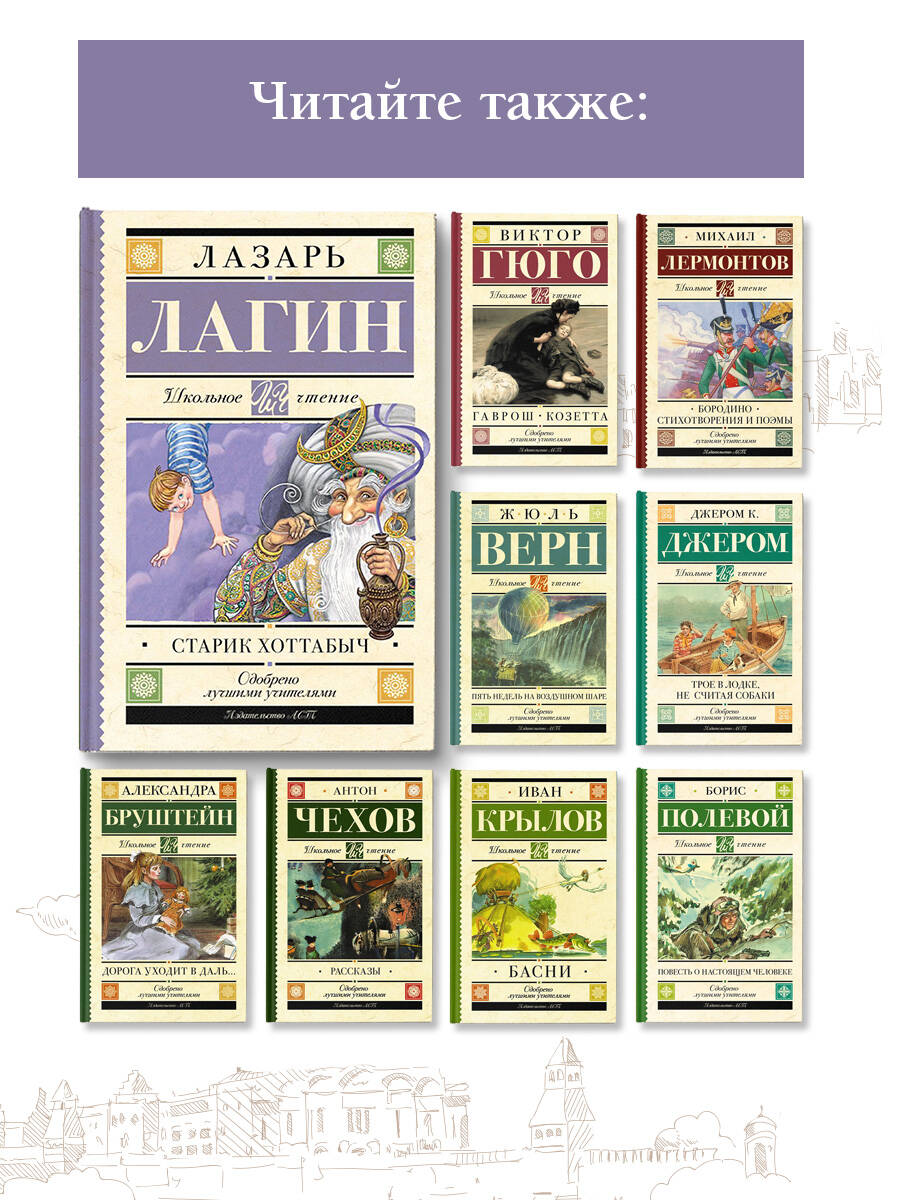 Лазарь Иосифович Лагин (1903 - 1979) - советский писатель и поэт. Повесть-сказка "Старик Хоттабыч" (1938) печаталась по частям сначала в газете"Пионерская правда", а затем в журнале "Пионер". Московский школьник Волька Костыльков, купаясь в речке, находит таинственную бутылку. Удивлению Вольки не было предела, когда вместо клада, он нашел в старинной бутылке джинна. Старый джинн по имени Гассан Абдурахман ибн Хоттаб за свое освобождение пообещал преданно служить Вольке и выполнять все его пожелания. Но пионеру Костылькову не нужны дворцы и несметные богатства Хоттабыча. Волька учит старика грамоте, устраивает на работу в цирк, "делает из него настоящего человека". Хоттабыч в свою очередь помогает Вольке научиться ценить дружбу и отвечать за свои поступки. Для детей среднего школьного возраста.| Издательство | ИЗДАТЕЛЬСТВО "АСТ" |
