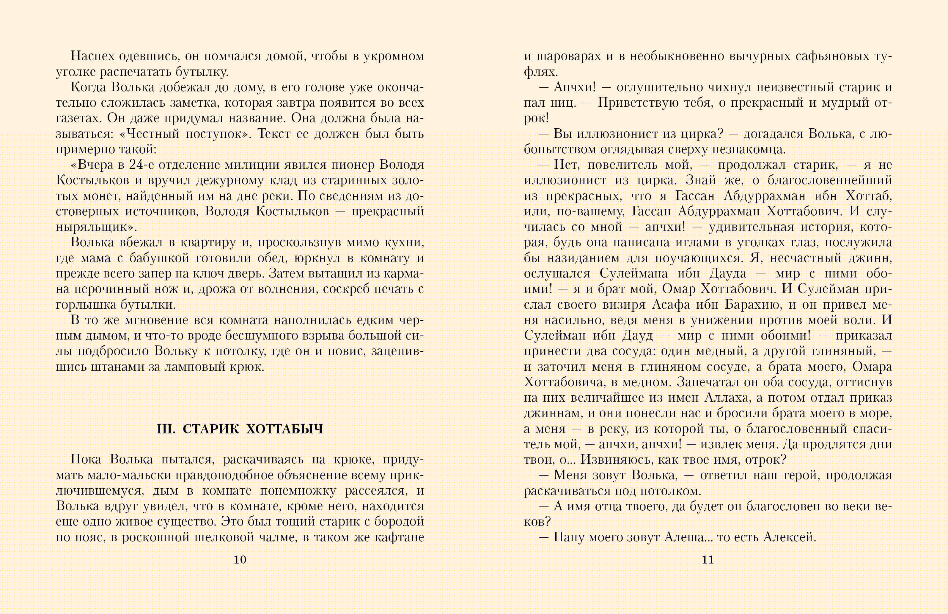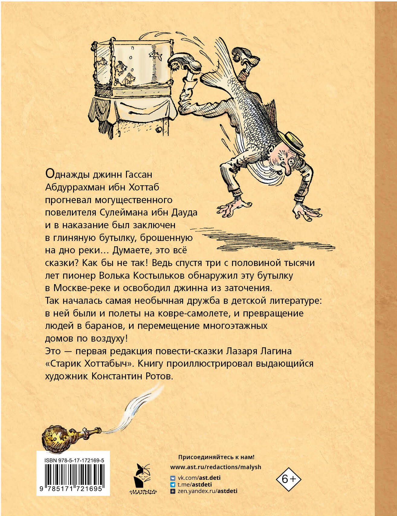 В 1938 году Лазарь Лагин написал детскую повесть-сказку "Старик Хоттабыч" о дружбе двенадцатилетнего мальчика Вольки Костылькова с тысячелетним джинном Хоттабычем. Отдельной книгой повесть впервые опубликовали спустя два года, и вышла она с иллюстрациями выдающегося художника Константина Ротова. Книга имеет три редакции, но чаще всего переиздается оригинальное издание 1940 года. Для среднего школьного возраста.| Издательство | Издательство "АСТ" |