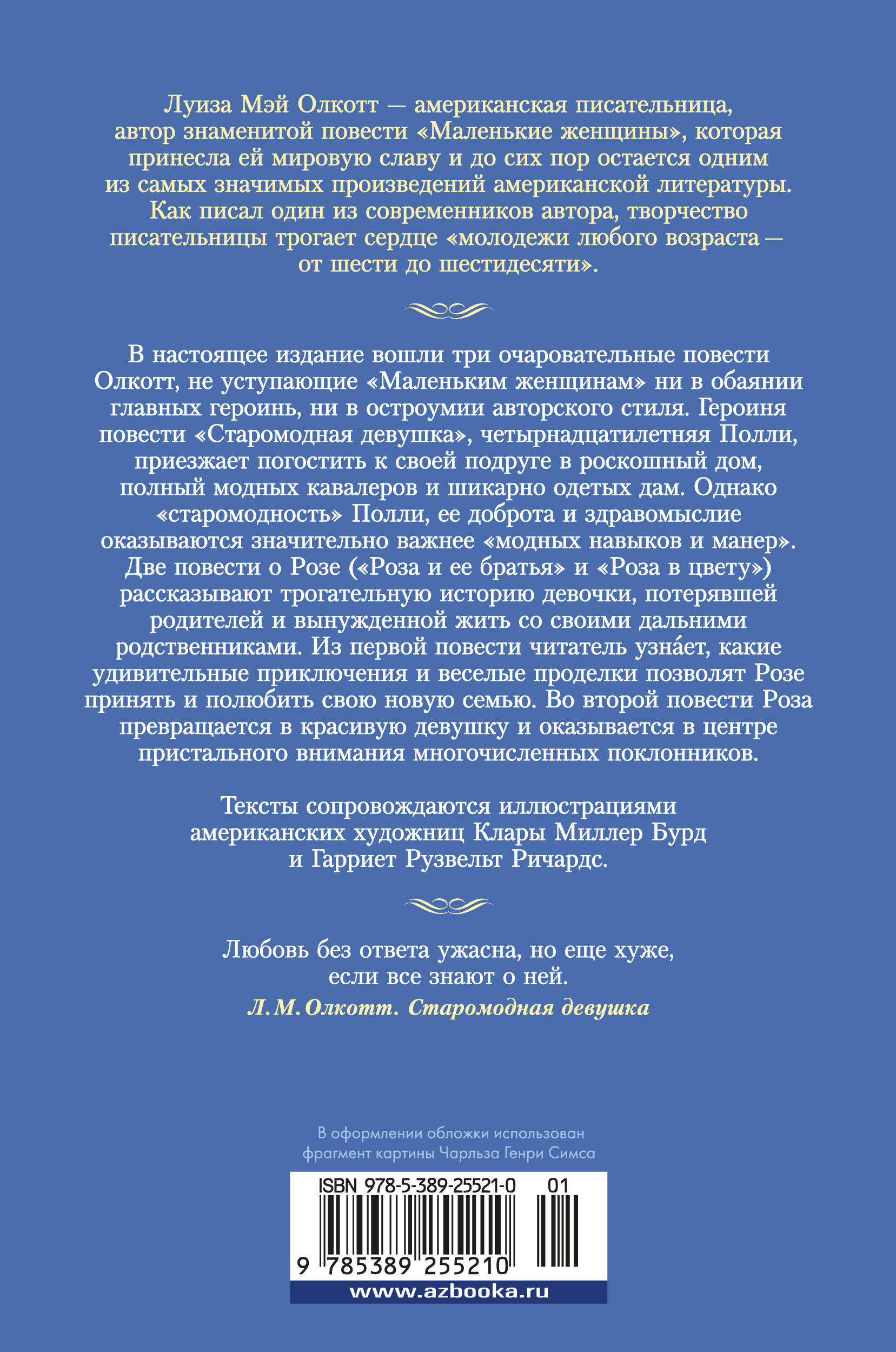 Луиза Мэй Олкотт - американская писательница, автор знаменитой повести "Маленькие женщины", которая принесла ей мировую славу и до сих пор остается одним из самых значимых произведений американской литературы. Как писал один из современников автора, творчество писательницы трогает сердце "молодежи любого возраста - от шести до шестидесяти". В настоящее издание вошли три очаровательные повести Олкотт, не уступающие "Маленьким женщинам" ни в обаянии главных героинь, ни в остроумии авторского стиля. Героиня повести "Старомодная девушка", четырнадцатилетняя Полли, приезжает погостить к своей подруге в роскошный дом, полный модных кавалеров и шикарно одетых дам. Однако "старомодность" Полли, ее доброта и здравомыслие оказываются значительно важнее "модных навыков и манер". Две повести о Розе ("Роза и ее братья" и "Роза в цвету") рассказывают трогательную историю девочки, потерявшей родителей и вынужденной жить со своими дальними родственниками. Из первой части читатель узна`ет, какие удивительные приключения и веселые проделки позволят Розе принять и полюбить свою новую семью. Во второй части Роза превращается в красивую девушку и оказывается в центре пристального внимания многочисленных поклонников. Тексты сопровождаются иллюстрациями американских художниц Клары Миллер Бурд и Гарриет Рузвельт Ричардс.| Издательство | Азбука-Аттикус Издат.группа ООО |