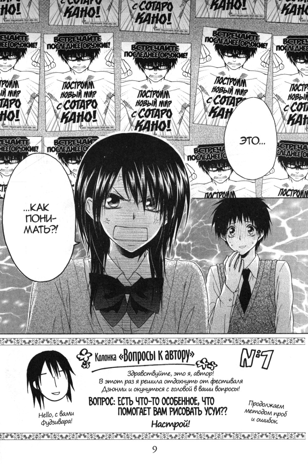 Мисаки, планирующая переизбраться на должность президента школьного совета, вступает в борьбу с Сотаро Кано, чью кандидатуру поддерживает целая армия парней из десятых классов! На время выборов Мисаки отстраняется от Усуи и не знает о его встрече с их старым знакомым! Пока суд да дело, «Мэйд Латте» устраивает мероприятие в честь дня рождения Мисаки! Как её поздравит Усуи? Встречайте волнительный девятый том!
