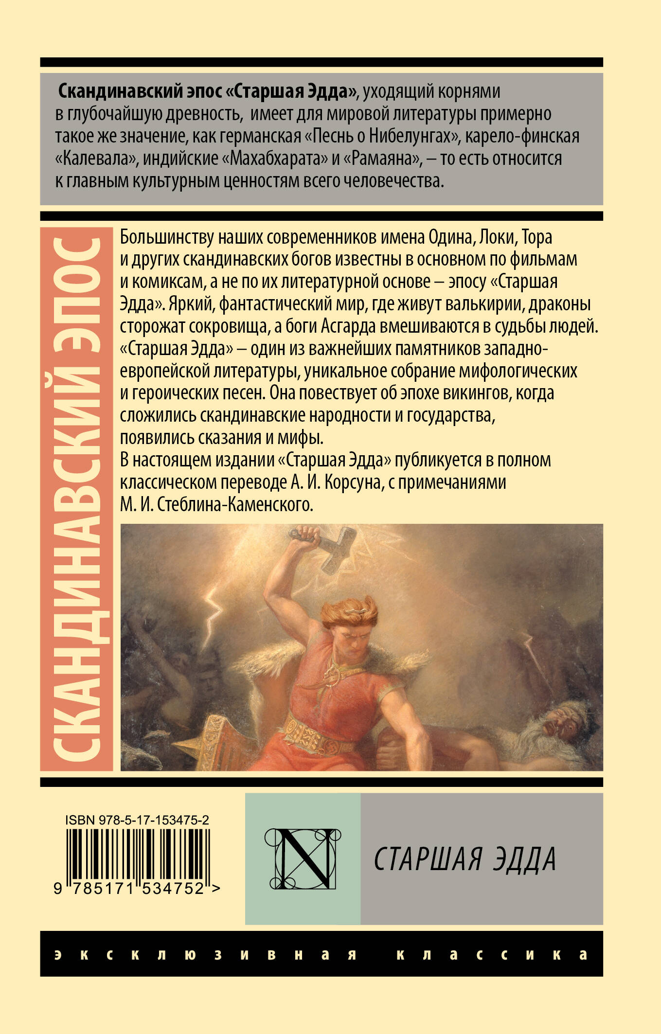 В настоящем издании "Старшая Эдда" публикуется в полном классическом переводе А. И. Корсуна, с примечаниями М. И. Стеблина-Каменского.