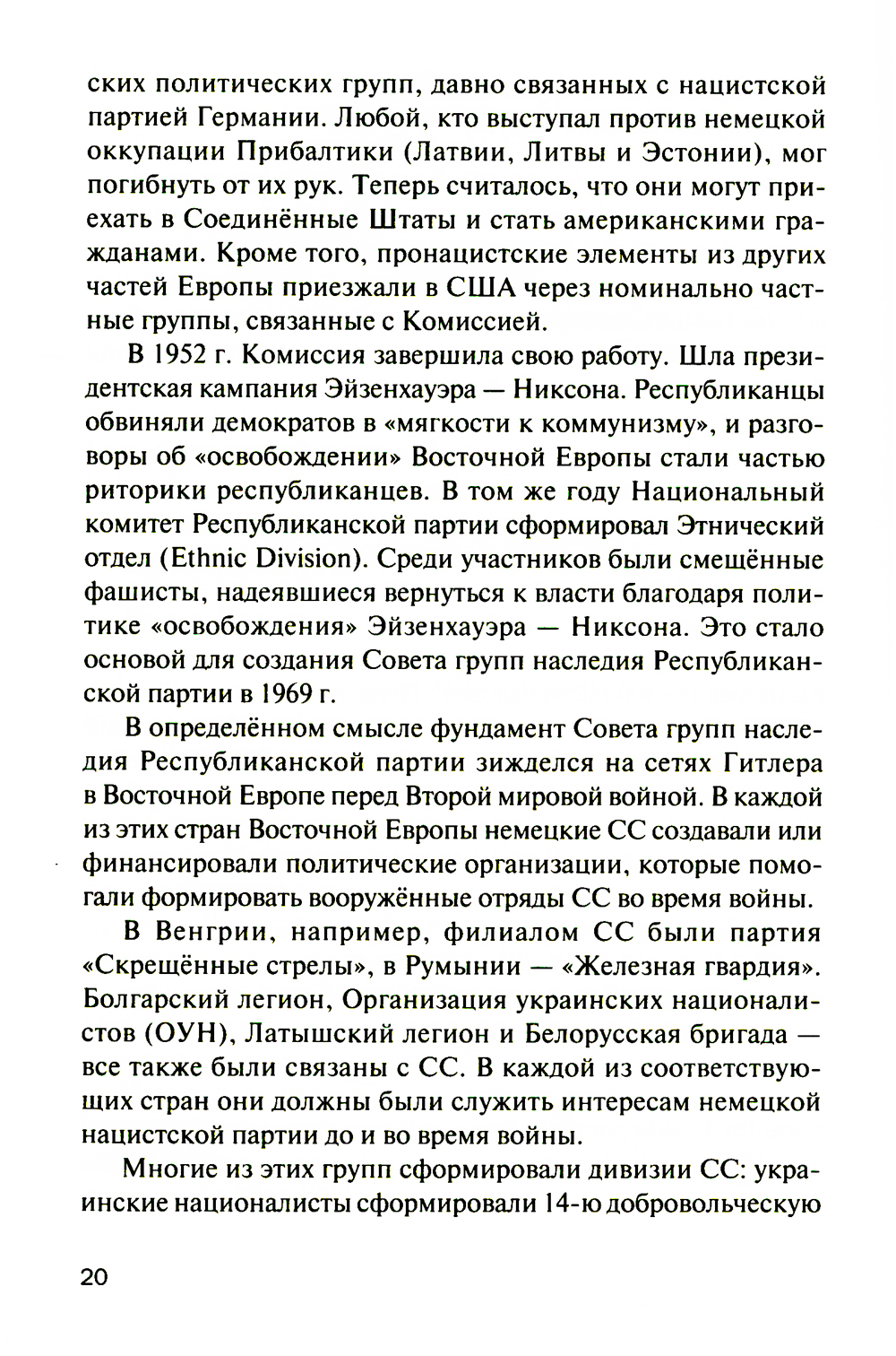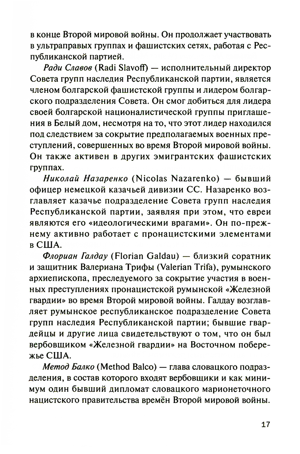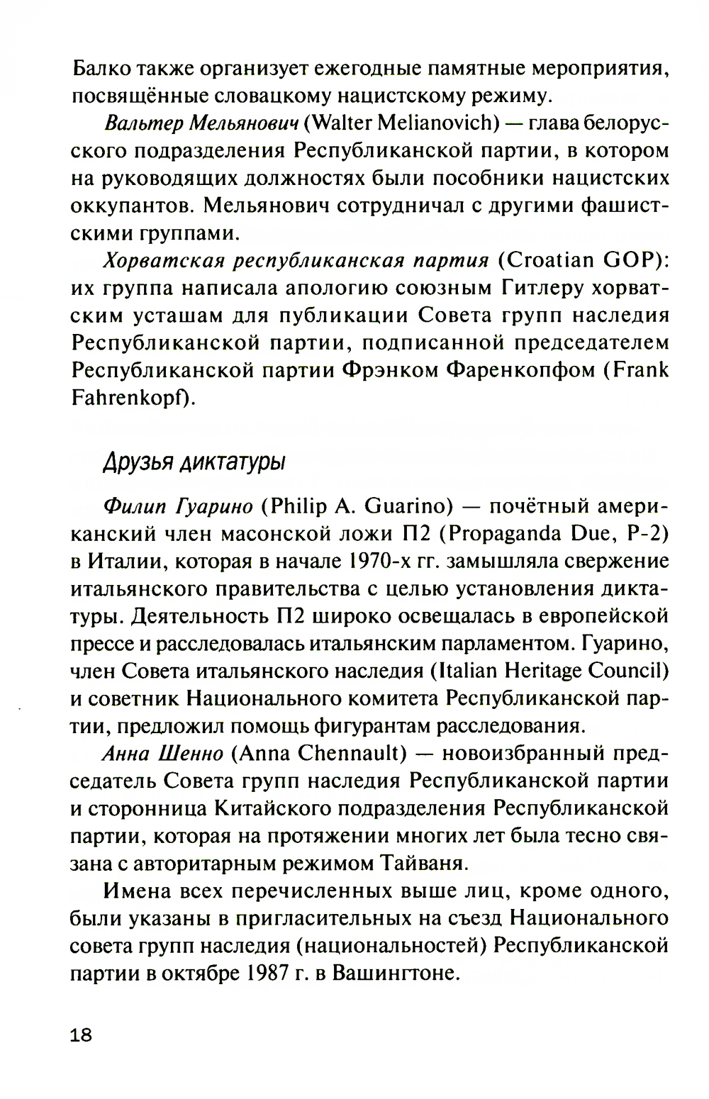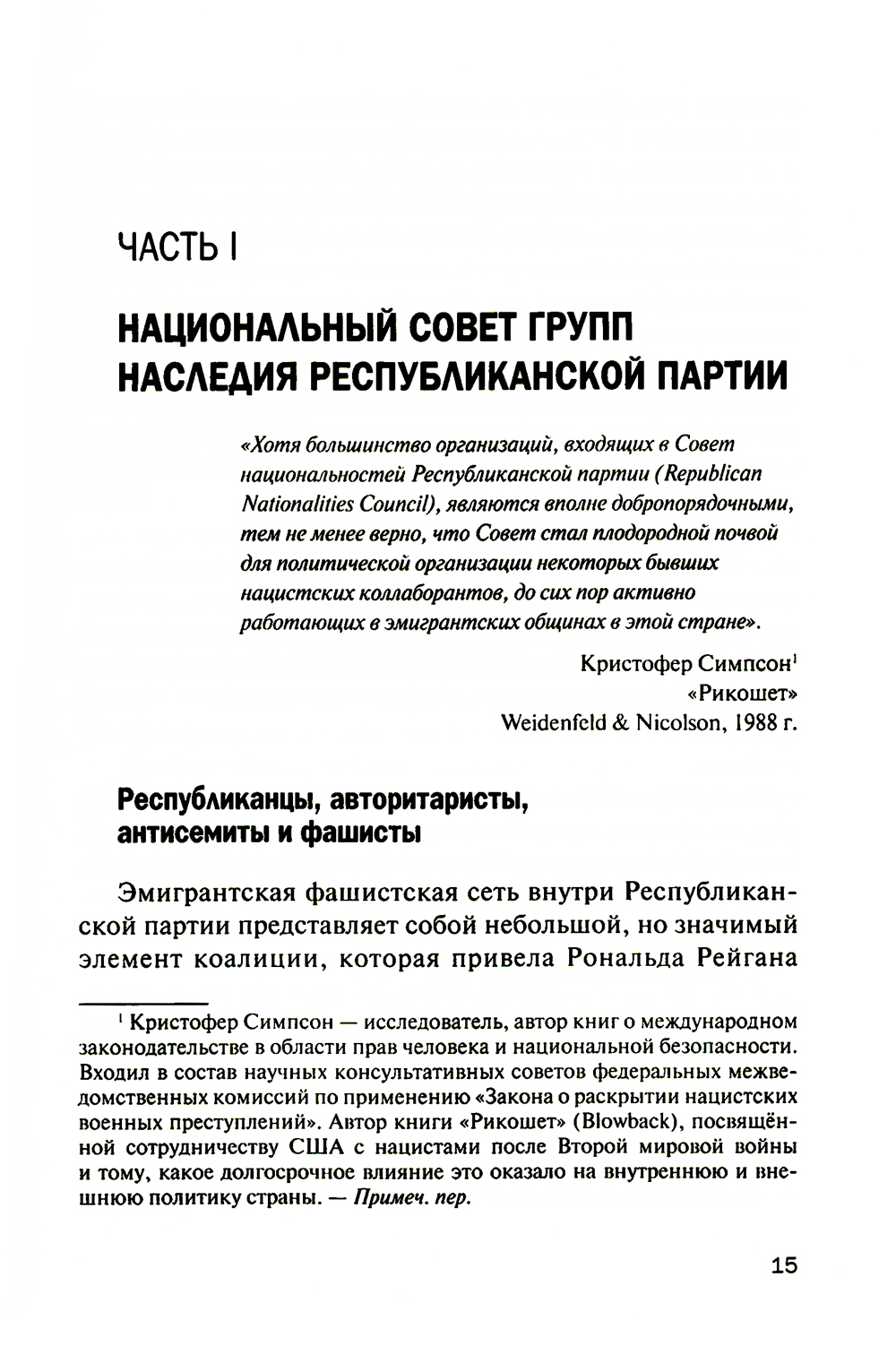 Американский исследователь-антифашист Расе Беллант раскрывает работу Республиканской партии и крайне правых милитаристских кругов США с антисоветскими эмигрантами и коллаборационистами для противодействия СССР и левым движениям в мире в эпоху правления Рональда Рейгана. Автор описывает интеграцию сторонников фашизма в эмигрантские политические организации при Республиканской партии, их функции во внутренней и внешней политике Соединённых Штатов Америки и результаты их работы, в частности сдвиг Республиканской партии вправо. Для текущего российского контекста книга ласт описание деятельности украинской диаспоры в США и позволяет оценить потенциал правого крыла Республиканской партии в решении конфликта на Украине.| Издательство | Кучково поле |