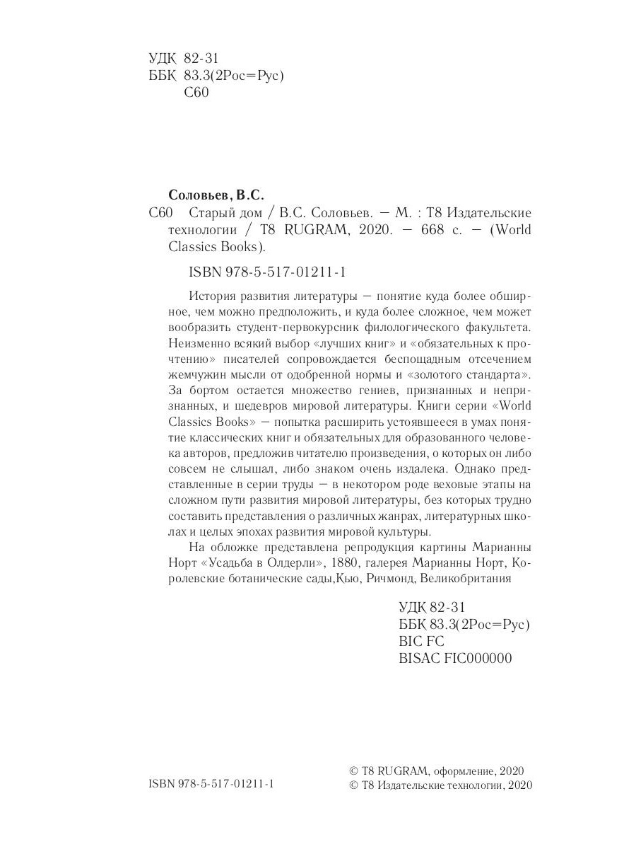 История развития литературы - понятие куда более обширное, чем можно предположить, и куда более сложное, чем может вообразить студент-первокурсник филологического факультета. Неизменно всякий выбор «лучших книг» и «обязательных к прочтению» писателей сопровождается беспощадным отсечением жемчужин мысли от одобренной нормы и «золотого стандарта». За бортом остается множество гениев, признанных и непризнанных, и шедевров мировой литературы. Книги серии «World Classics Books» - попытка расширить устоявшееся в умах понятие классических книг и обязательных для образованного человека авторов, предложив читателю произведения, о которых он либо совсем не слышал, либо знаком очень издалека. Однако представленные в серии труды - в некотором роде веховые этапы на сложном пути развития мировой литературы, без которых трудно составить представления о различных жанрах, литературных школах и целых эпохах развития мировой культуры. На обложке представлена репродукция картины Марианны Норт «Усадьба в Олдерли», 1880, галерея Марианны Норт, Королевские ботанические сады,Кью, Ричмонд, Великобритания